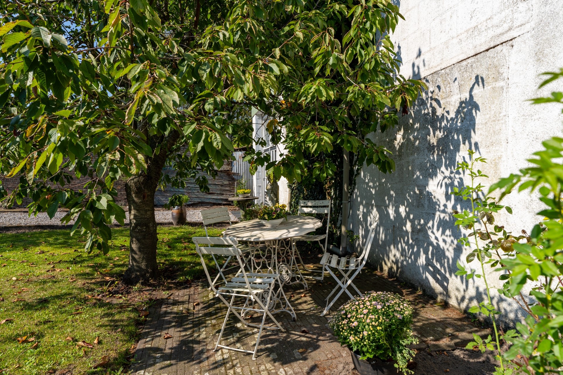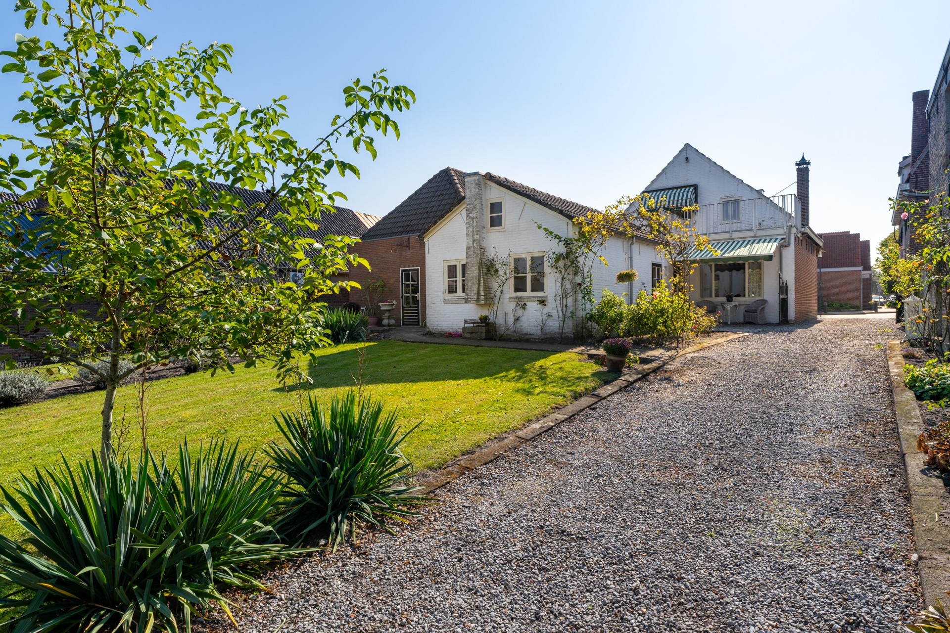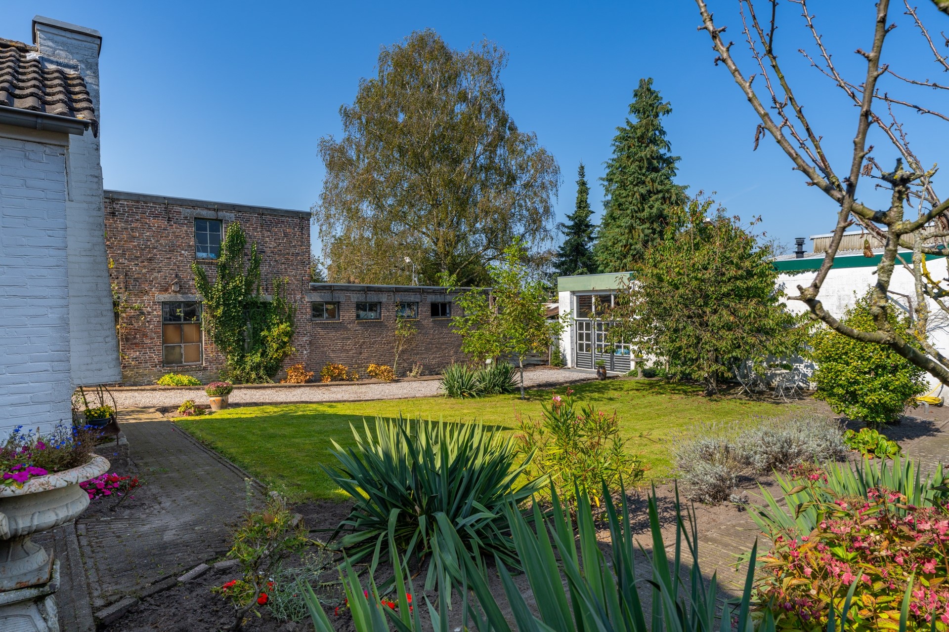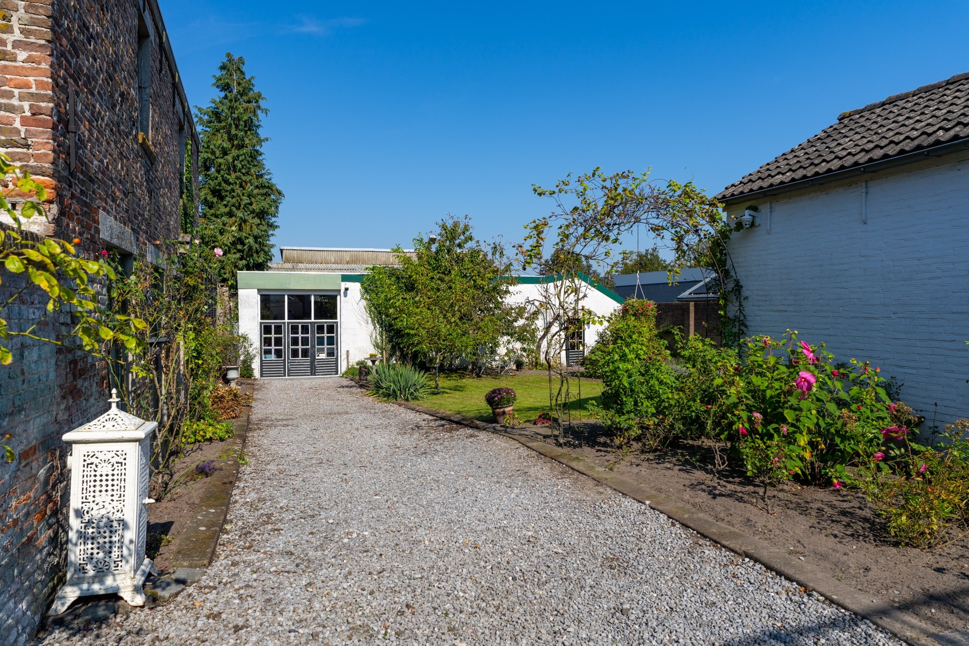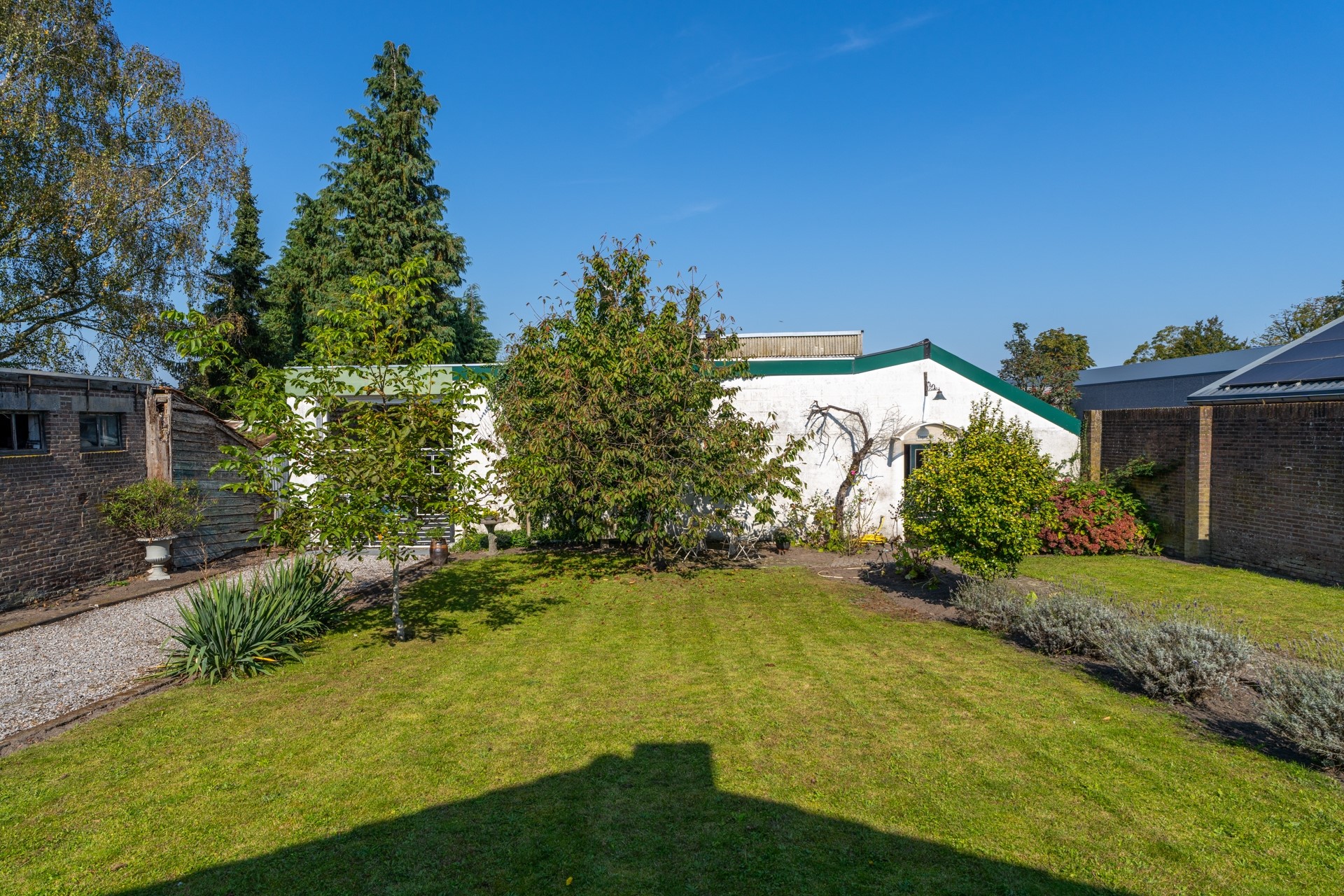 Het buitenterrein aan de voorzijde van het pand is ingericht met bestrating en hoort eveneens bij het perceel. Links van de woning bevindt zich de oprit met toegang naar de hal. De groene tuin is ingericht met verschillende terrassen, sierbestrating, gazon en plantenborders. Er is op elk moment van de dag een plek om van de zon te genieten. Achter het pand is het terrein deels verhard en is er volop ruimte voor buitenactiviteiten. Parkeren kan op eigen terrein en in de directe omgeving.