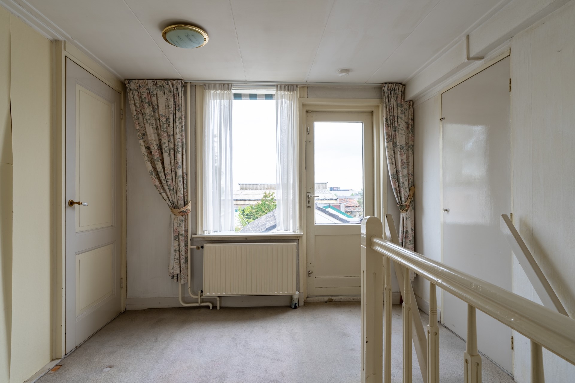 Overloop met toegang tot drie slaapkamers en een inloopkast/berging. Via een loopdeur is er toegang tot het dakterras.