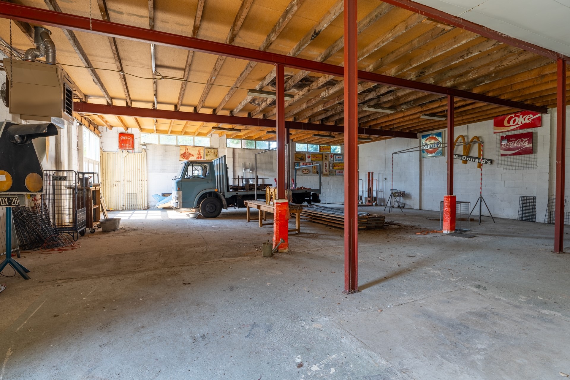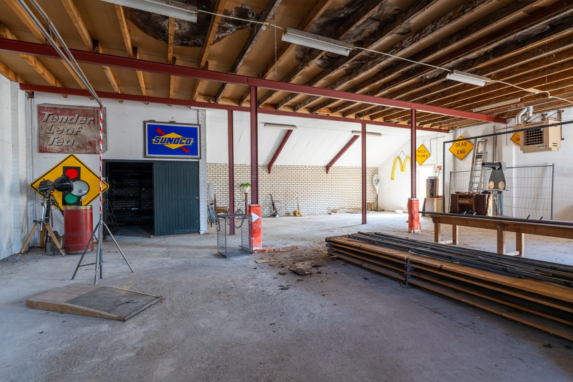 Achter op het perceel staat de royale bedrijfshal van ca. 243 m². Deze is bereikbaar via de oprit en beschikt over een grote schuifdeur. De hal is voorzien van krachtstroom en een heater (verwarming).