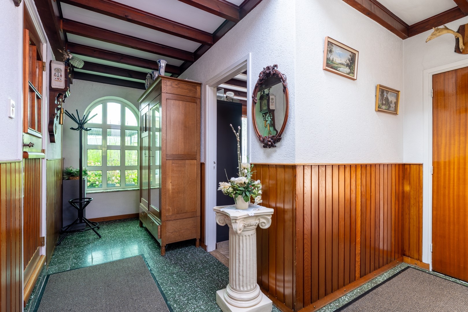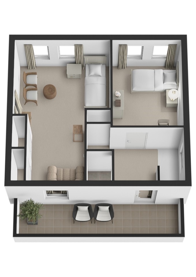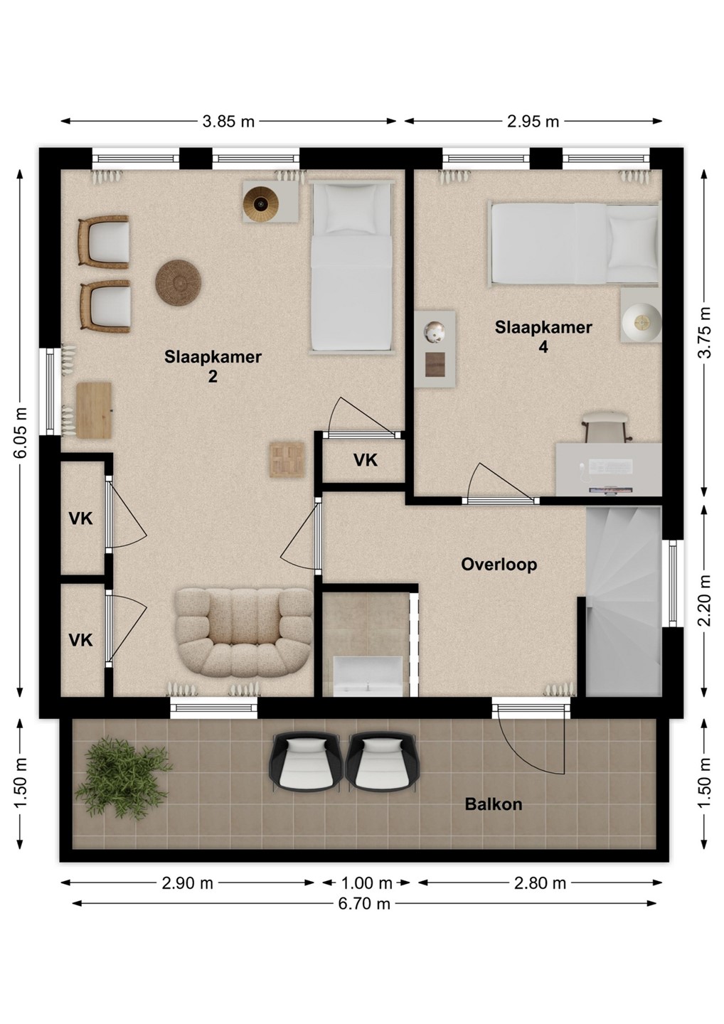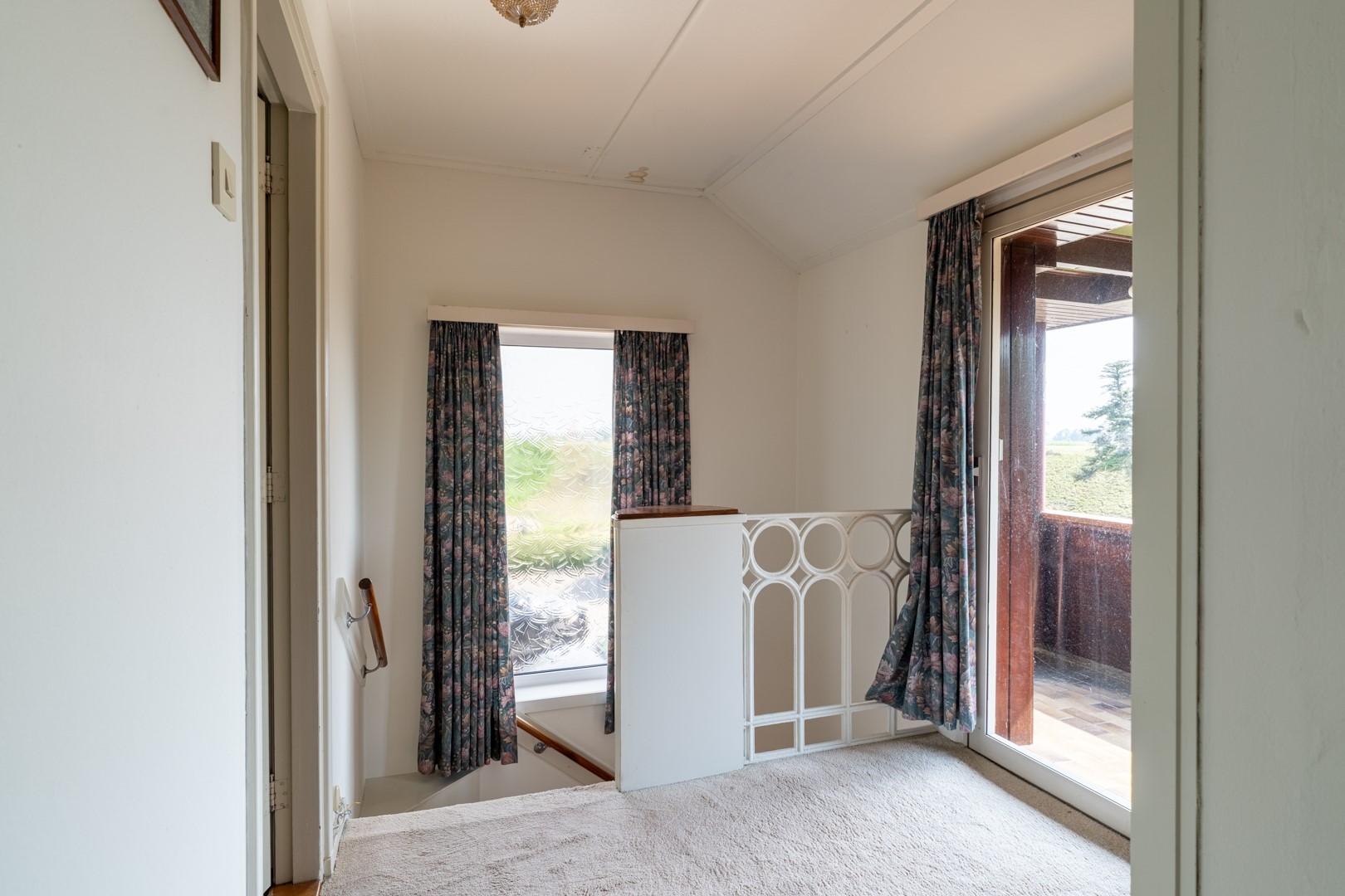 Op de verdieping vind je nog twee slaapkamers, waarvan één met vaste kast en de ander met toegang tot een vliering. Via de overloop bereik je bovendien een ruim inpandig balkon.