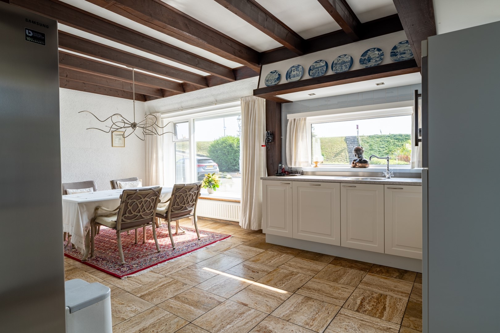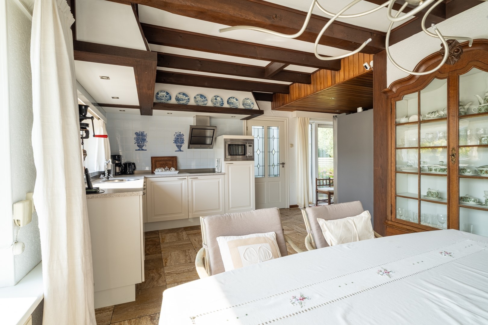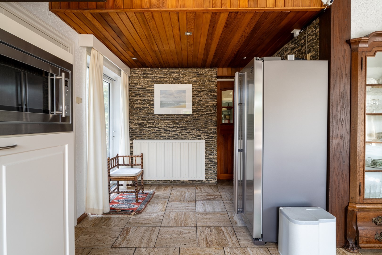 De woonkamer is royaal, licht en voorzien van grote ramen, een sfeervolle haard en hoge plafonds. Vanuit hier bereik je de keuken en de levensloopbestendige aanbouw. Alles is netjes en bruikbaar, maar waarschijnlijk kies je voor renovatie. De solide basis maakt moderniseren extra aantrekkelijk. De keuken is praktisch ingericht en biedt genoeg ruimte voor een grote eethoek. Vanuit het keukenraam en de eethoek kijk je uit over voortuin met de oprit. De keuken is uitgerust met diverse inbouwapparaten, waaronder een vaatwasser, 4-pits inductiekookplaat, magnetron en afzuigkap.
