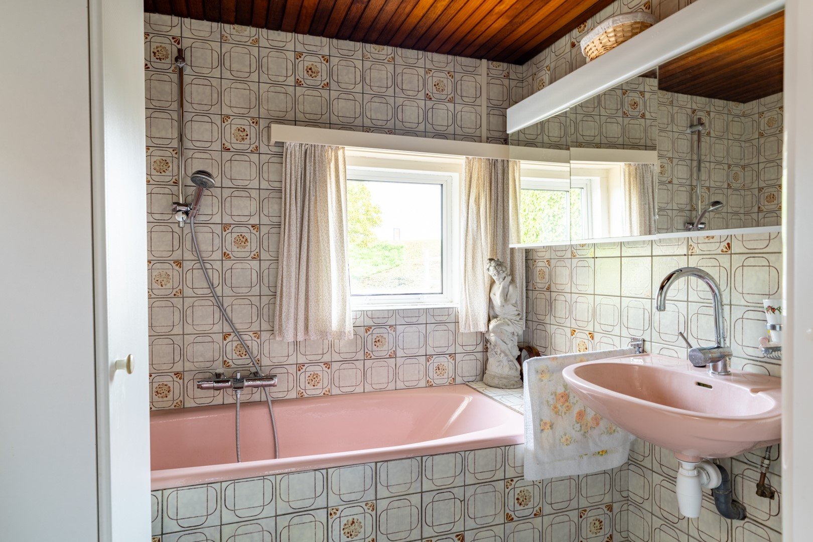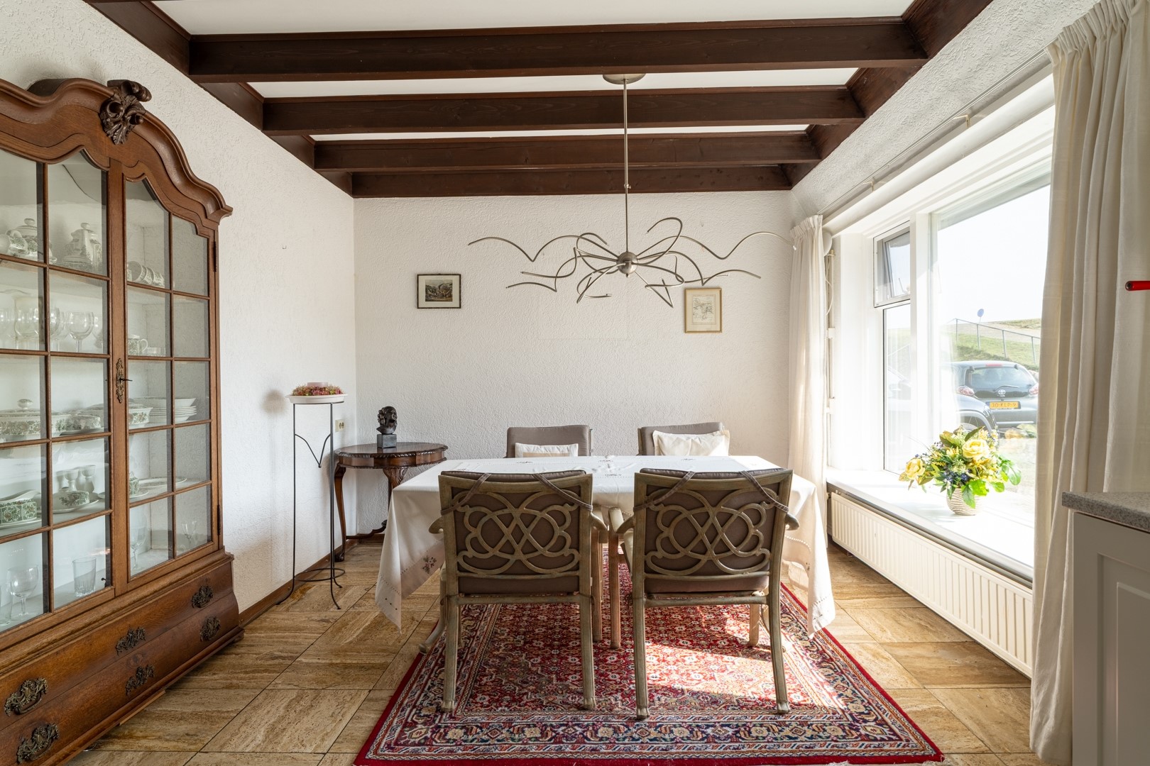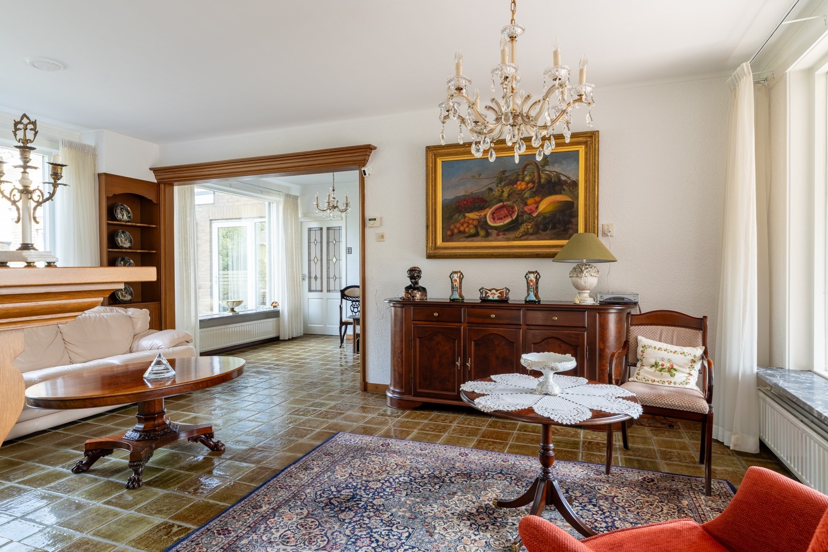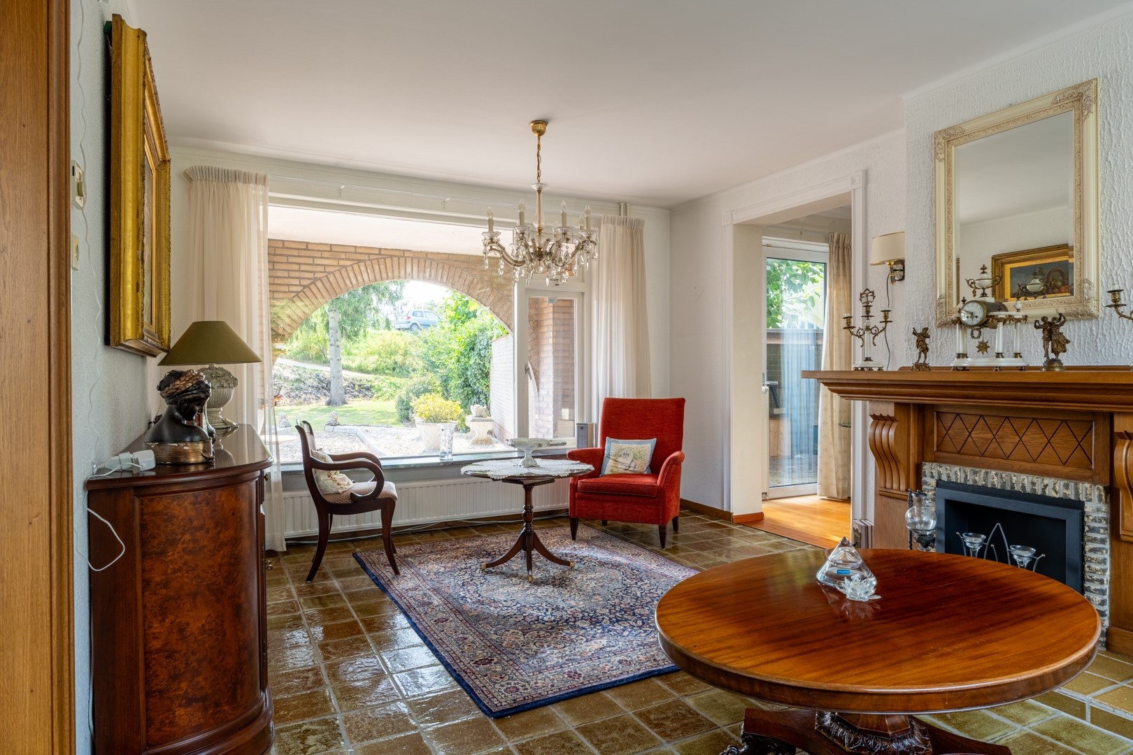 De woonkamer is royaal, licht en voorzien van grote ramen, een sfeervolle haard en hoge plafonds. Vanuit hier bereik je de keuken en de levensloopbestendige aanbouw. Alles is netjes en bruikbaar, maar waarschijnlijk kies je voor renovatie. De solide basis maakt moderniseren extra aantrekkelijk. De keuken is praktisch ingericht en biedt genoeg ruimte voor een grote eethoek. Vanuit het keukenraam en de eethoek kijk je uit over voortuin met de oprit. De keuken is uitgerust met diverse inbouwapparaten, waaronder een vaatwasser, 4-pits inductiekookplaat, magnetron en afzuigkap.