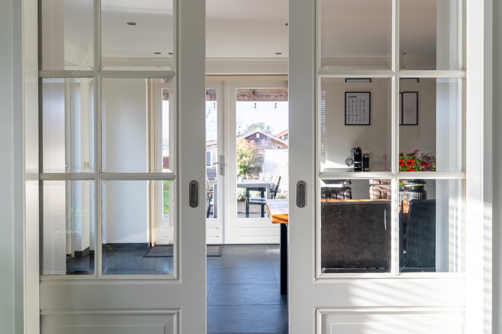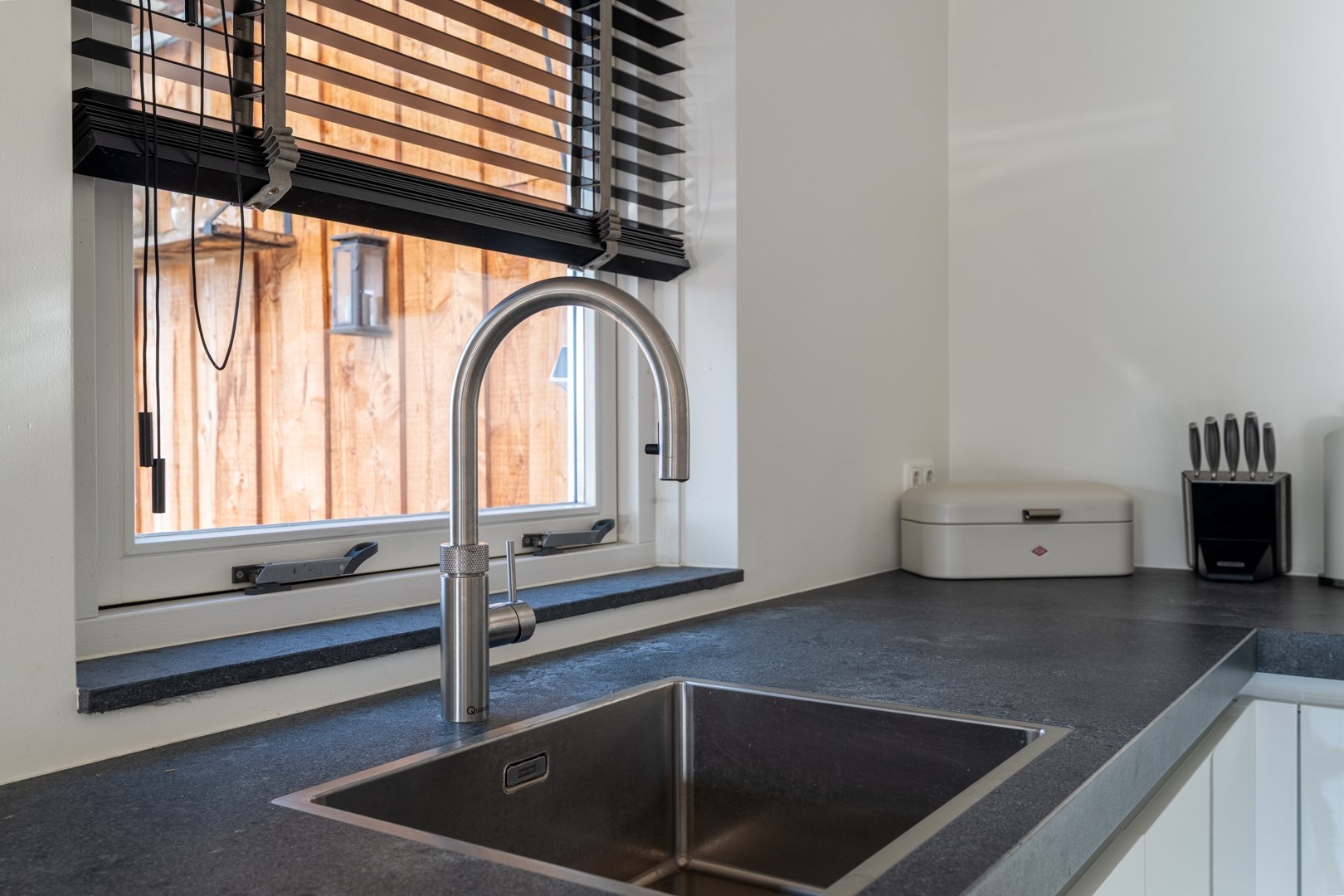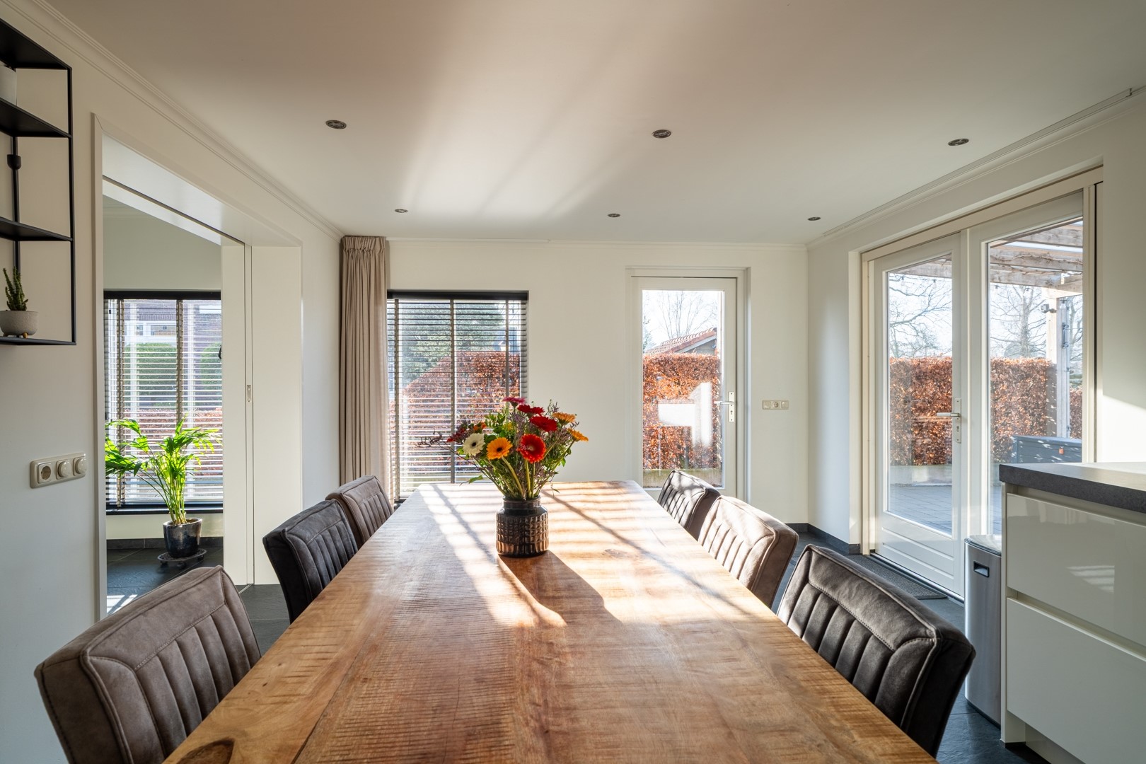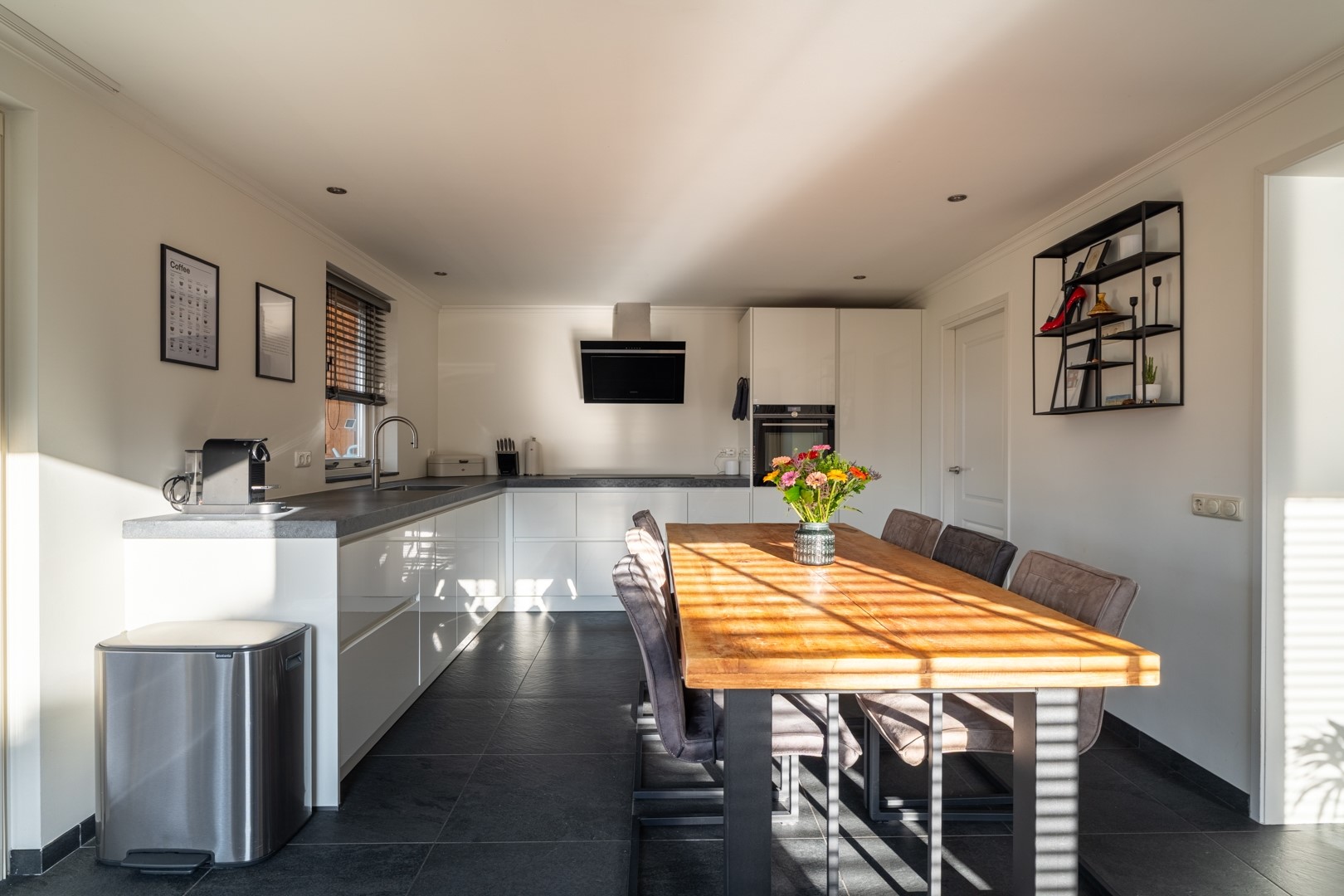 Via een speelse opening met schuifdeuren is de woonkeuken bereikbaar. Deze ruimte staat in directe verbinding met de tuin door middel van openslaande deuren en een extra loopdeur naar het overdekte terras. De L-vormige keukenopstelling is uitgevoerd met diverse moderne inbouwapparatuur, waaronder een Quooker, inductiekookplaat, afzuigkap, combi-oven en koel-/vriescombinatie. koelkast.