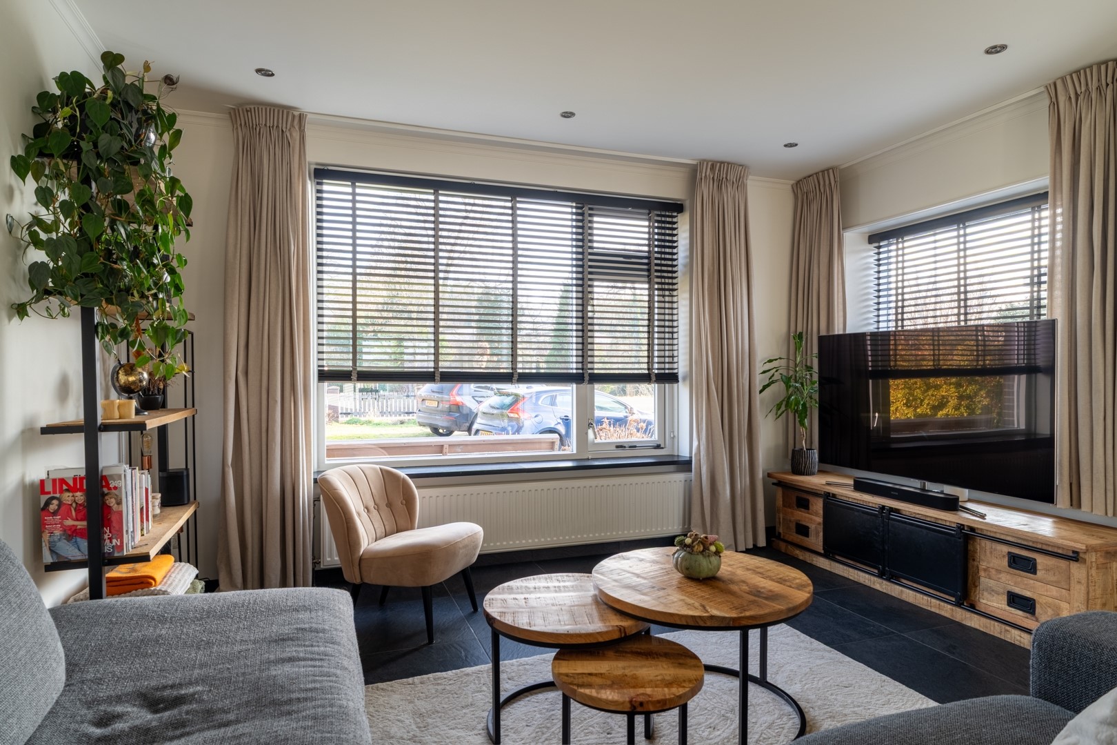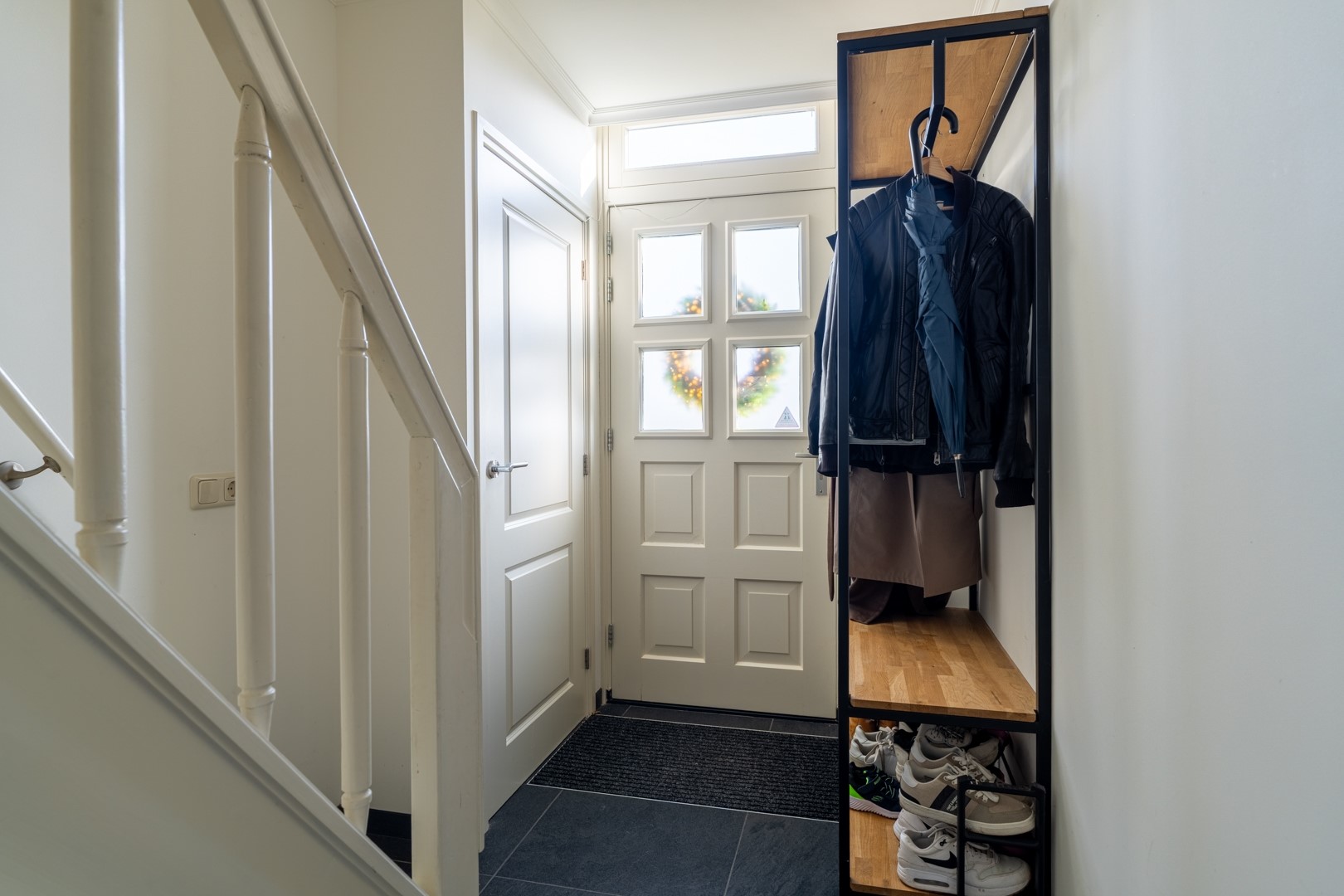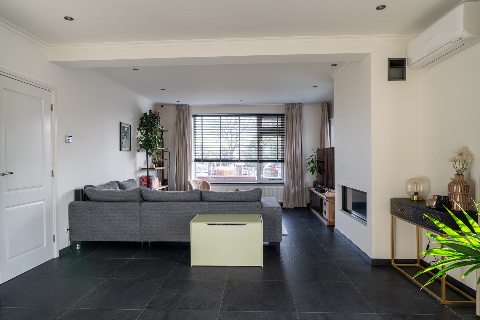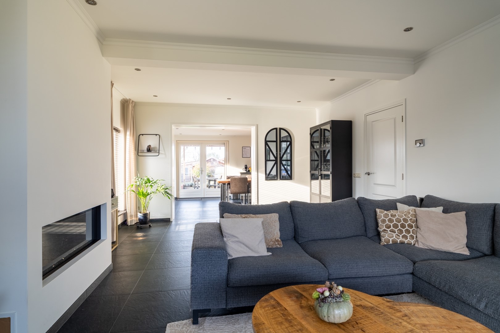 Ontvangsthal met meterkast, trapkast en toiletruimte met fontein. De ruime woonkamer beschikt over een prettig uitzicht aan de voorzijde. De aanwezige gashaard is in verband met de verduurzaming afgekoppeld en niet in gebruik.