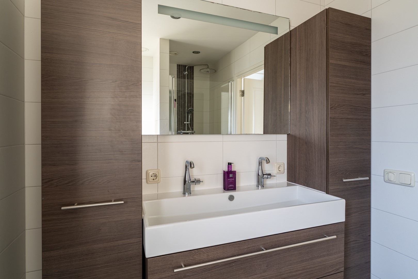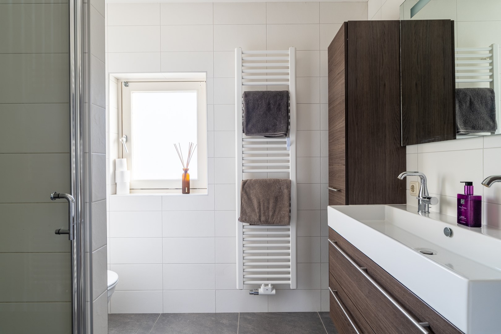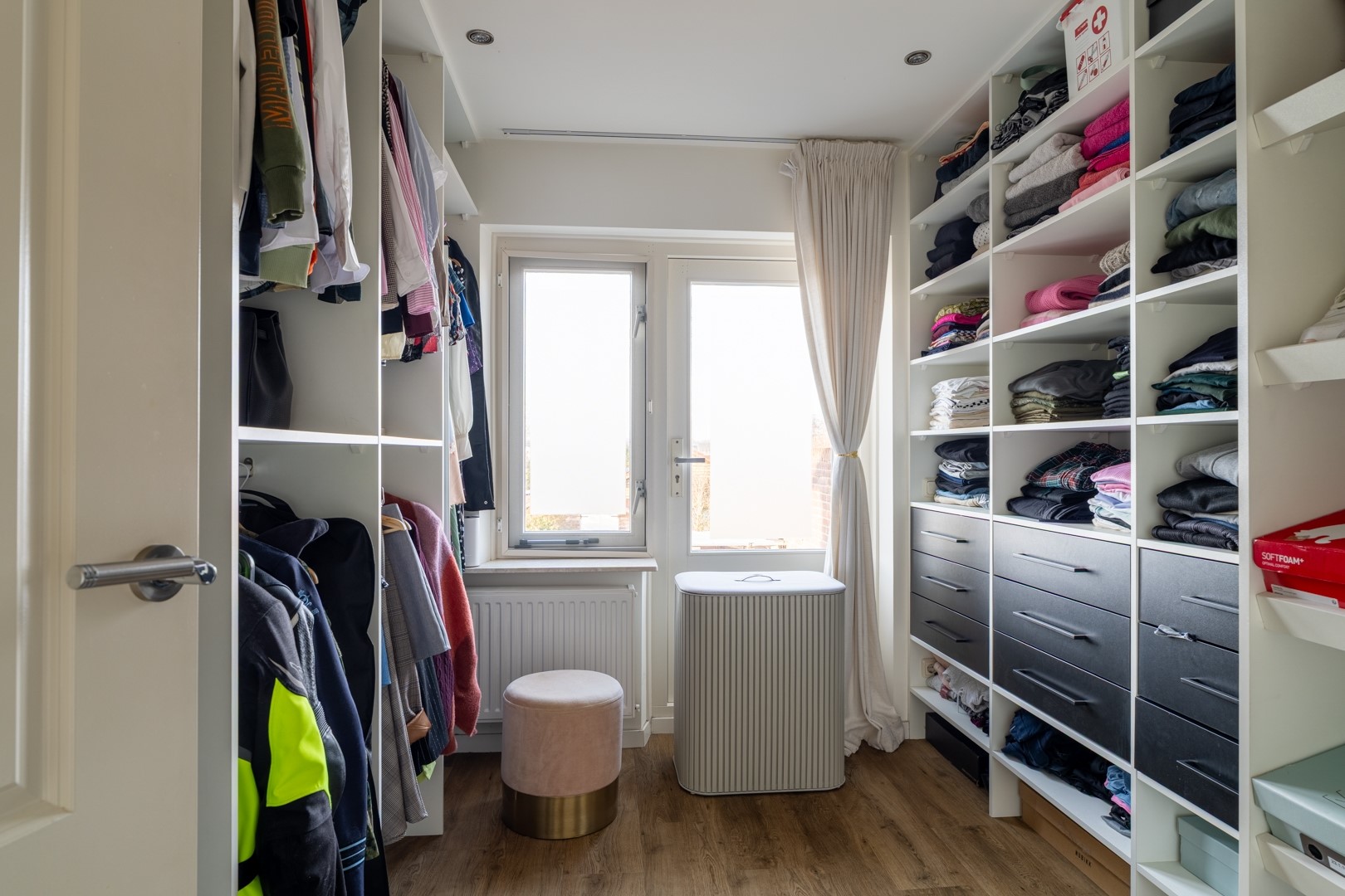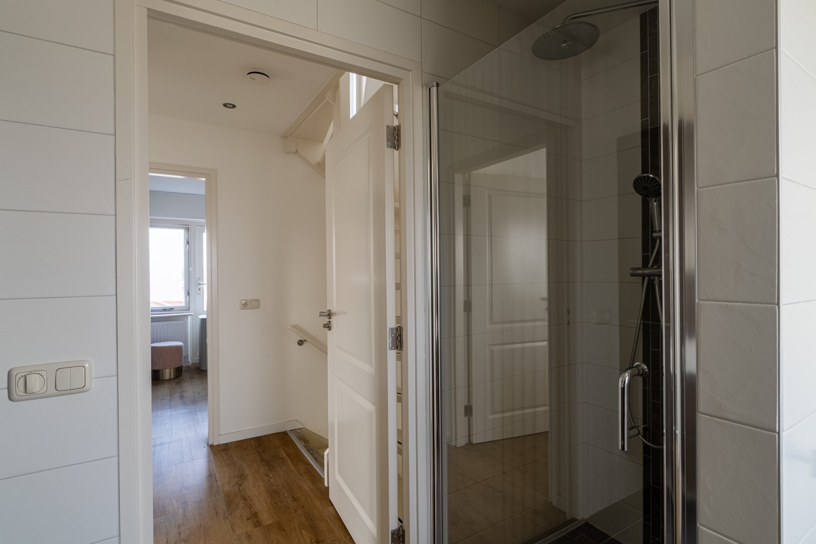 Overloop met toegang tot drie ruime slaapkamers (waarvan 1 ingericht als inloopkast, of iets in de trand van) en een moderne badkamer met vloerverwarming, voorzien van inloopdouche, tweede toilet, tweepersoons wastafelmeubel met extra kastruimte en designradiator.