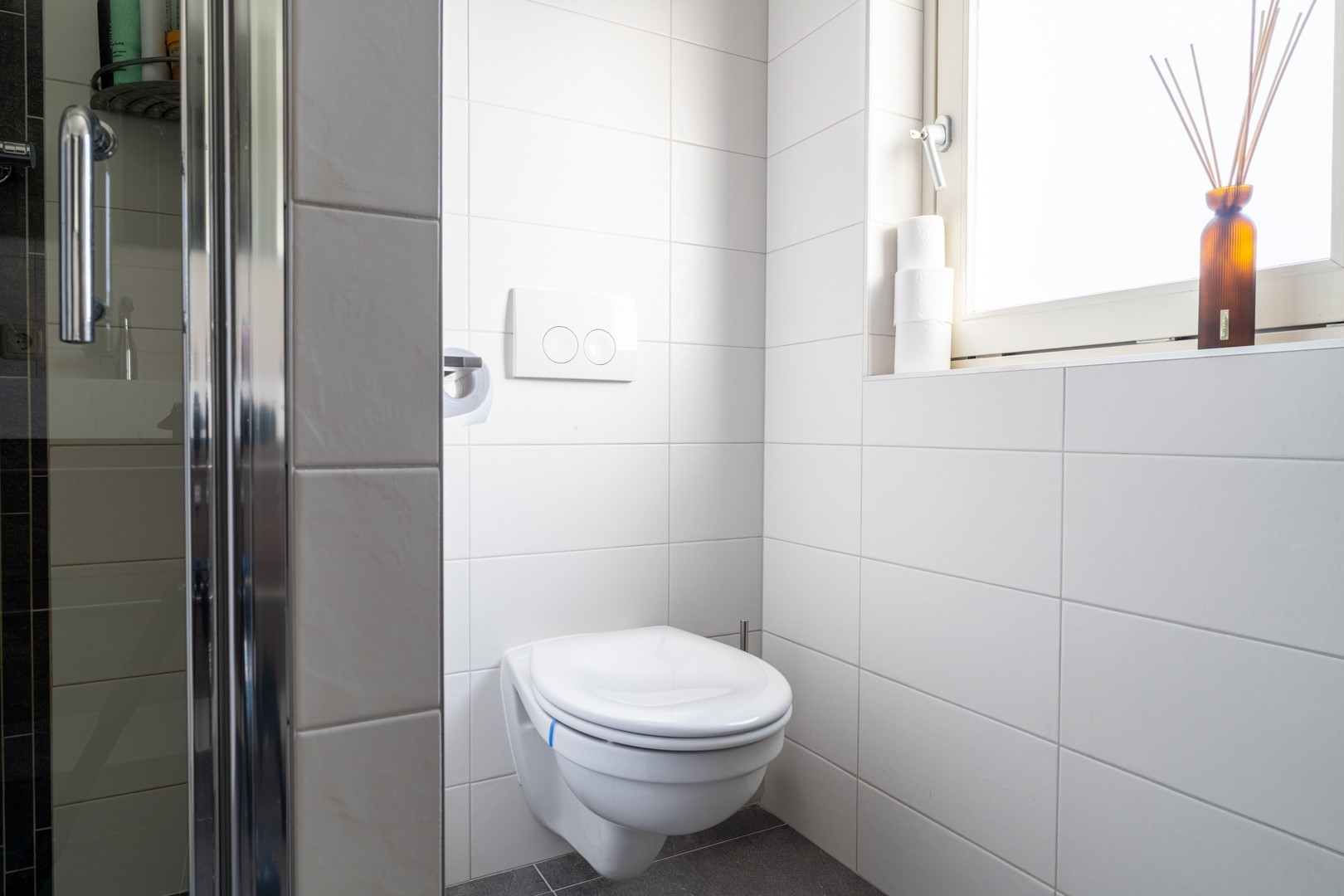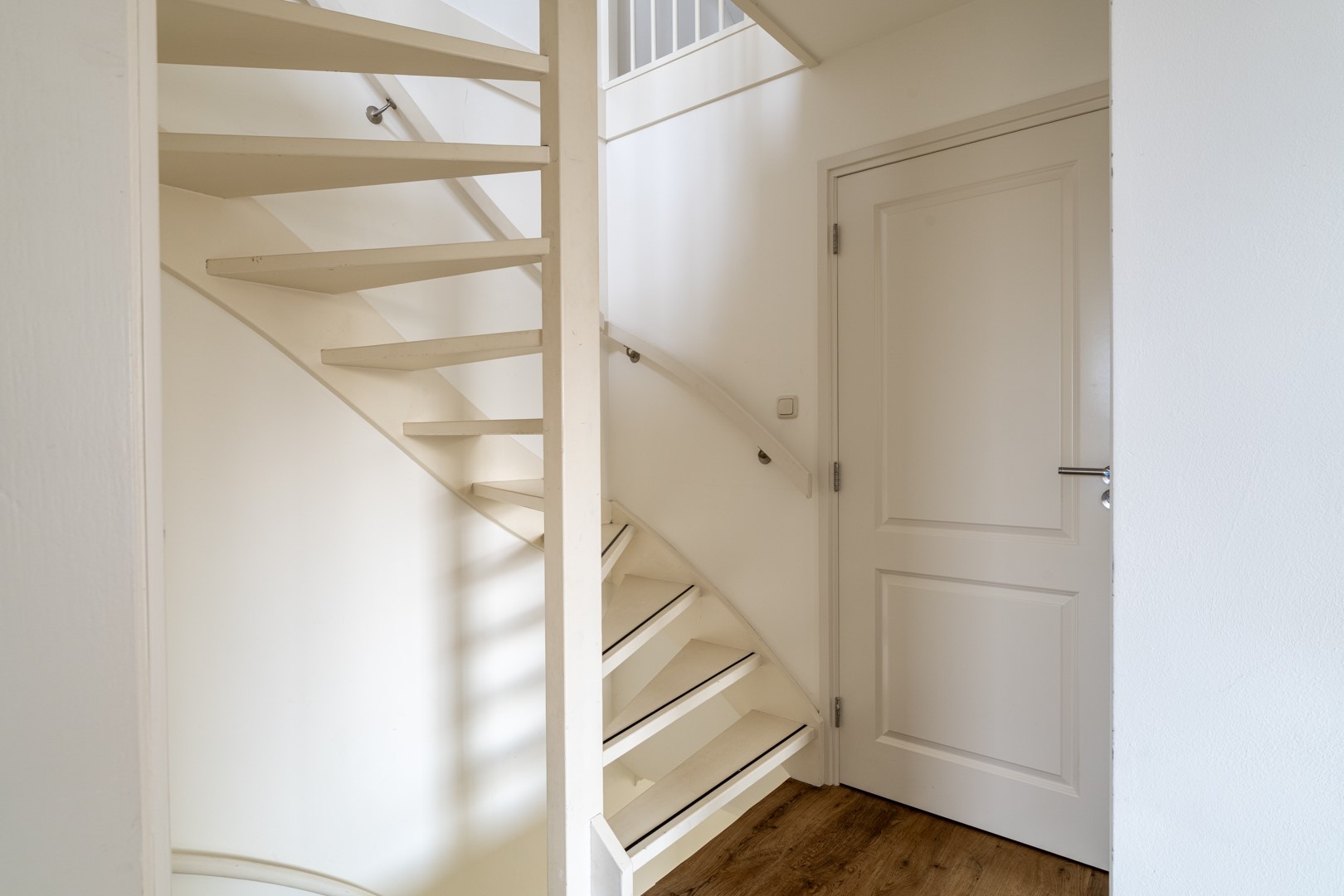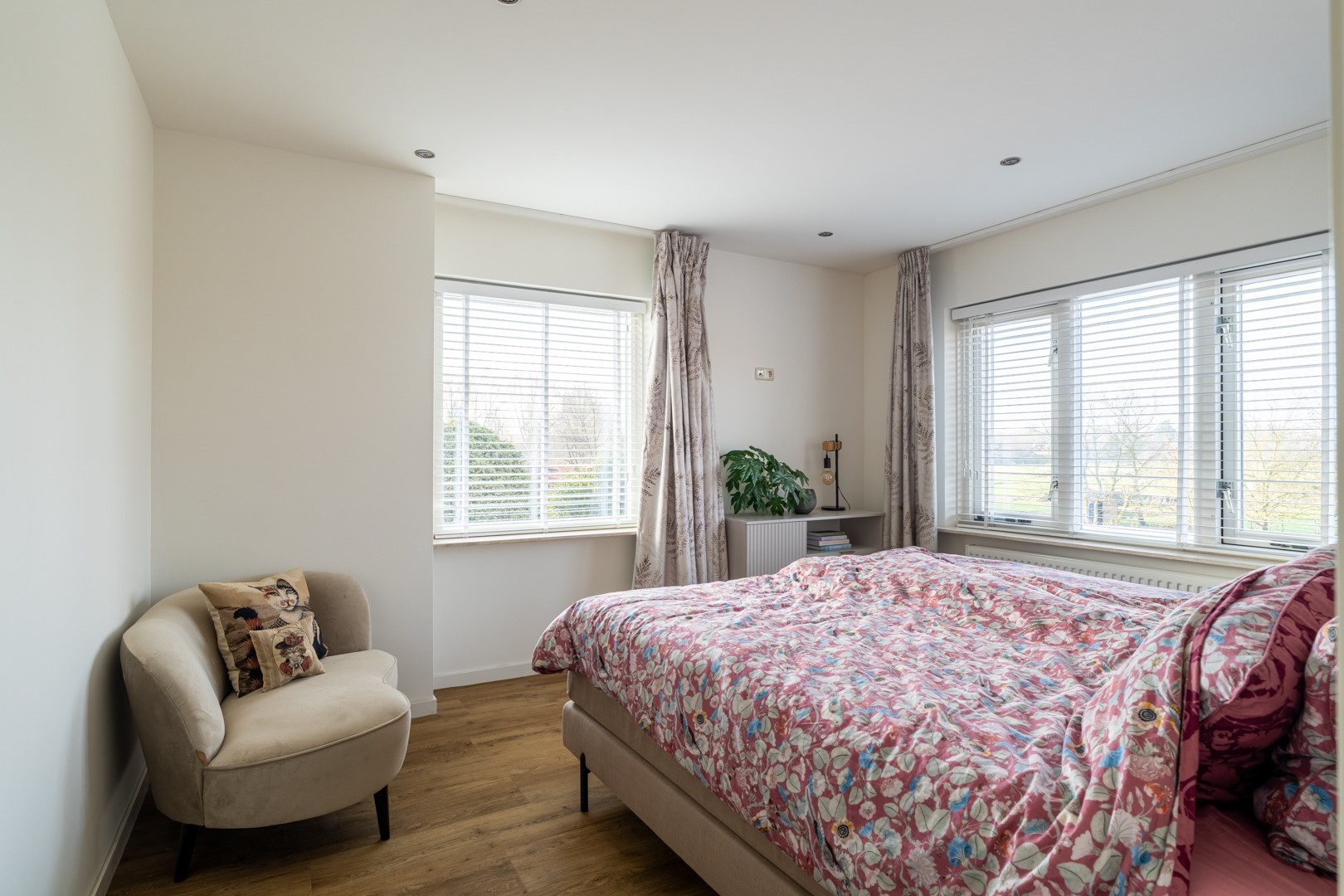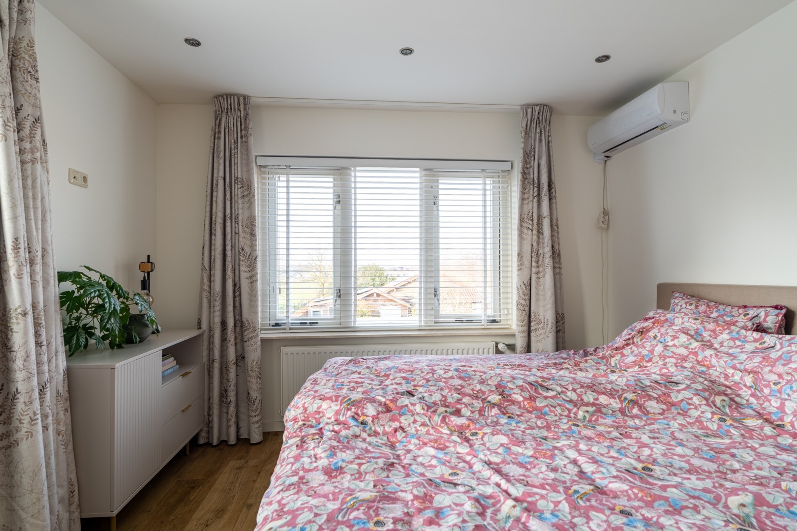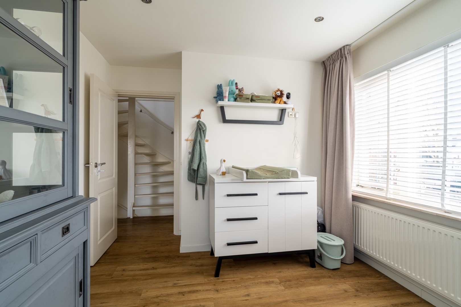 Overloop met toegang tot drie ruime slaapkamers (waarvan 1 ingericht als inloopkast, of iets in de trand van) en een moderne badkamer met vloerverwarming, voorzien van inloopdouche, tweede toilet, tweepersoons wastafelmeubel met extra kastruimte en designradiator.