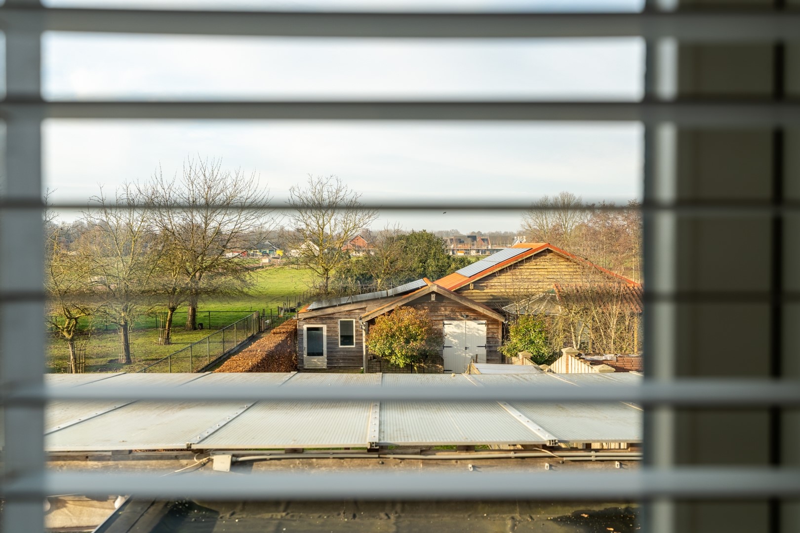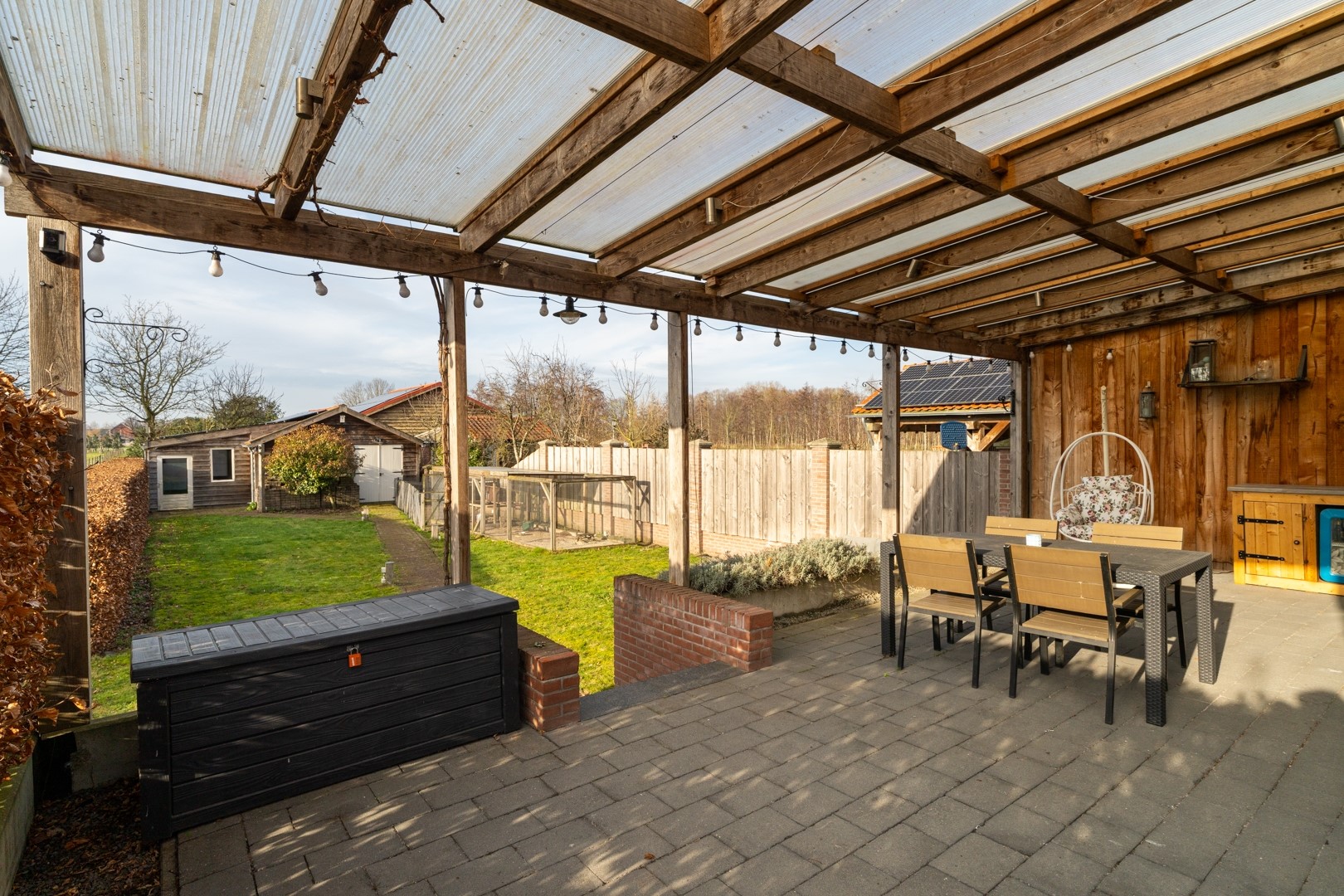 Achter op het perceel bevinden zich de garage en berging, voorzien van zonnepanelen, omvormer, elektra en water. De ruimtes zijn geschikt voor opslag, hobby- of werkdoeleinden.