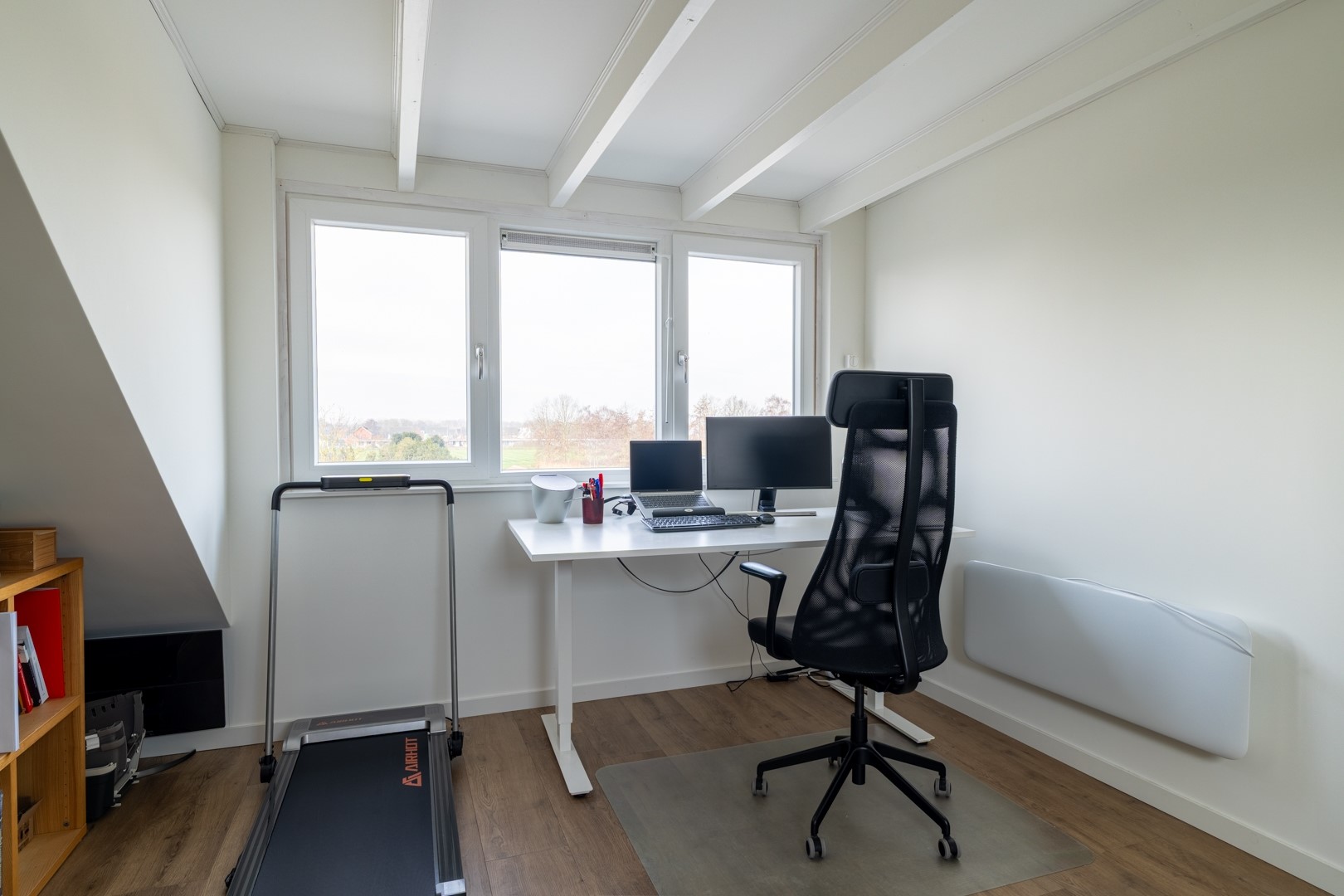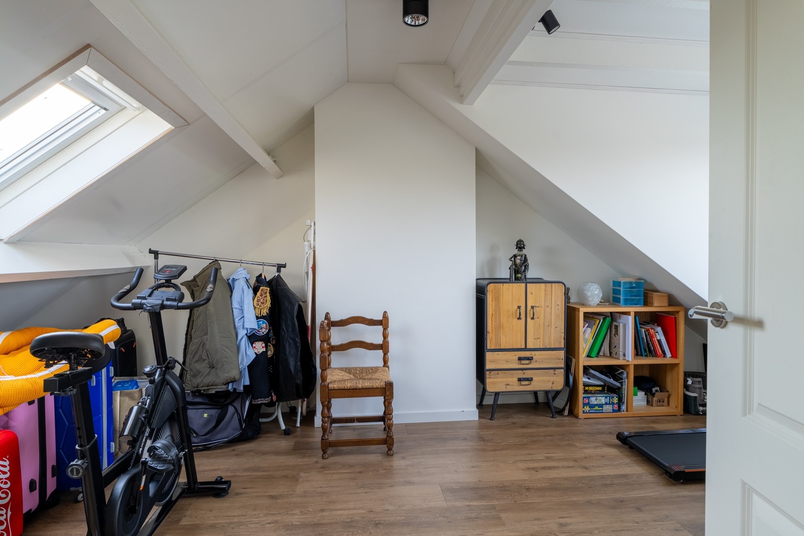 Overloop met opstelling van de technische installatie (hybride warmtepomp, bouwjaar 2023) en een ruime vierde slaapkamer / werkkamer.