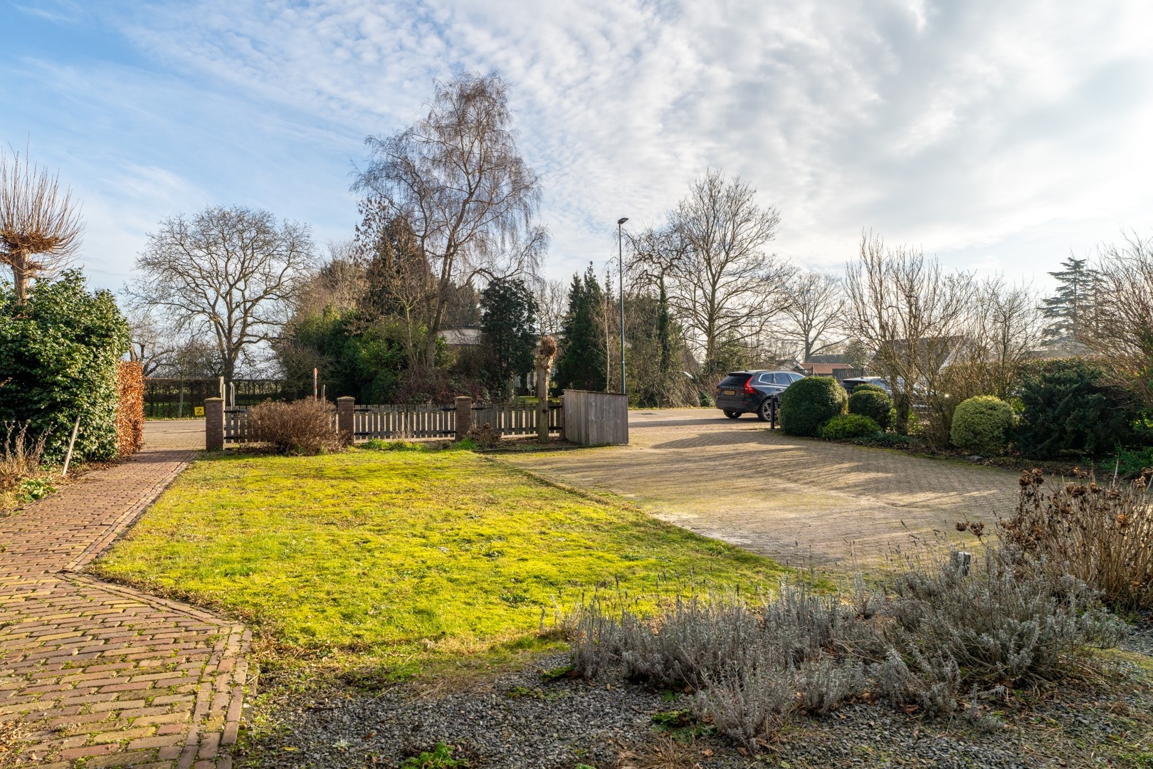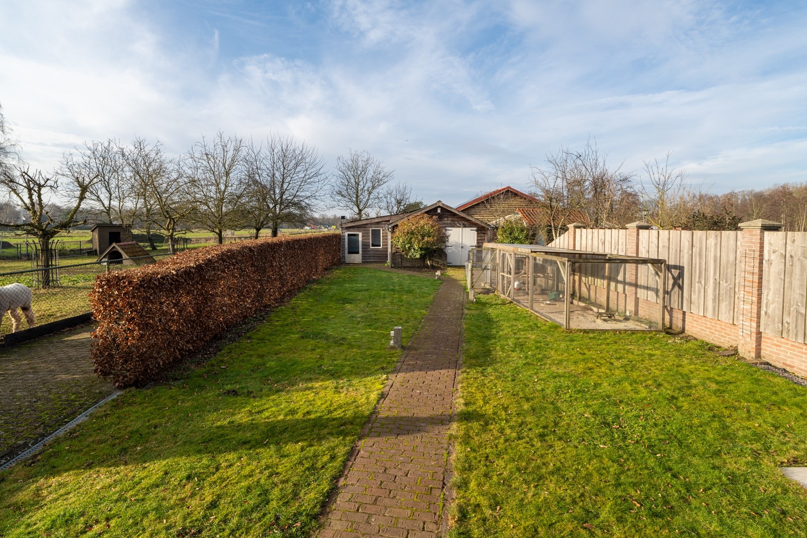 De voortuin is verzorgd aangelegd met sierbestrating en vaste beplanting. Parkeren is mogelijk op eigen terrein. De achtertuin is gesitueerd op het westen en grenst aan lager gelegen weilanden, waardoor vanuit de woning, het terras en vanuit de overkapping een beter uitzicht ontstaat over de achtertuin en omgeving. De tuin is gevarieerd ingericht met meerdere terrassen, gazon, sierbestrating en volwassen beplanting. De natuurlijke ligging en het groene achtergebied versterken het ruimtelijke karakter en de beleving van rust en privacy.