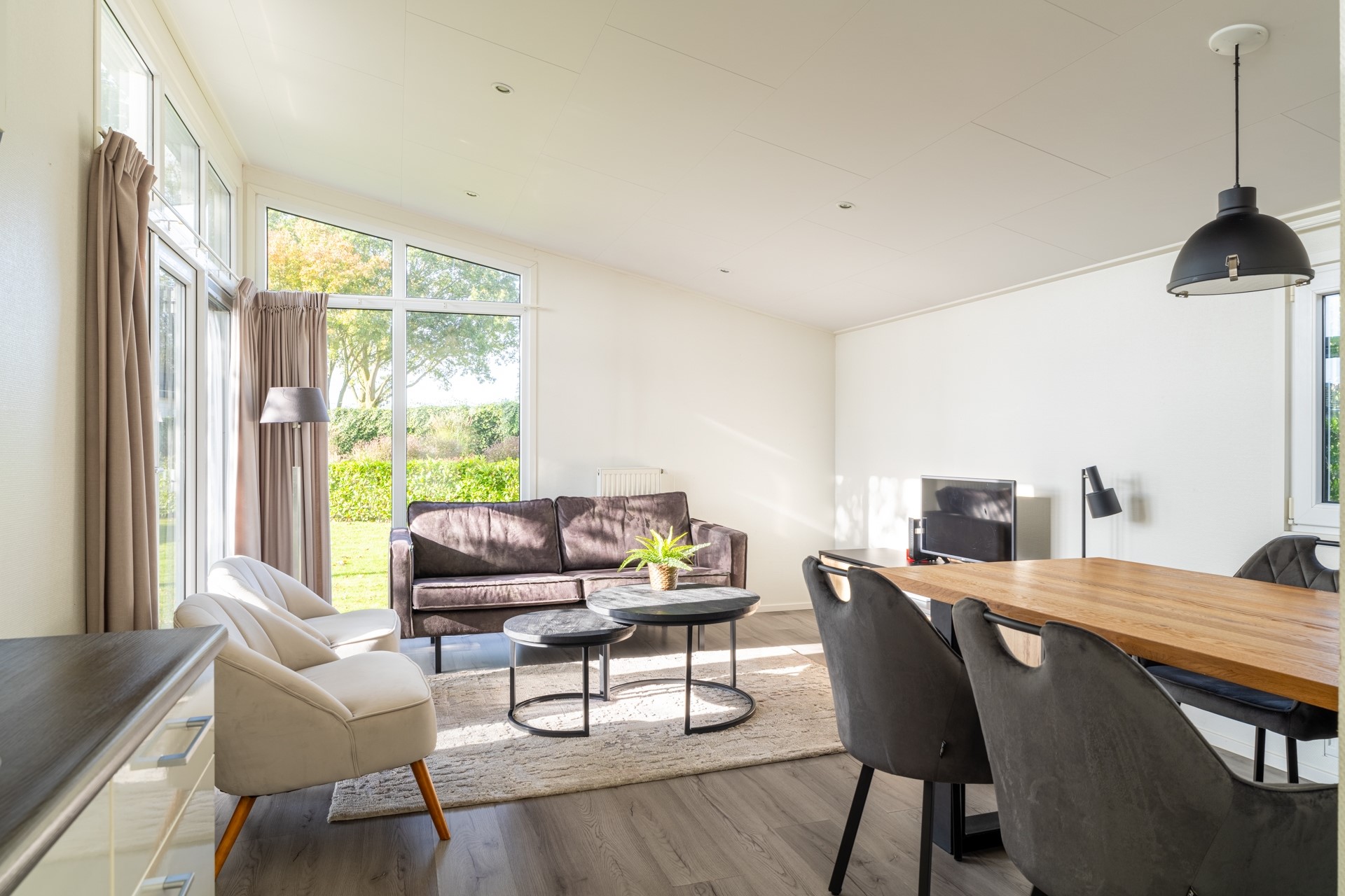 Woonkamer met openslaande tuindeuren en grote raampartijen, keuken met frisse keukenopstelling met diverse inbouwapparatuur waaronder een vaatwasser, De badkamer is voorzien van een douche, zwevend toilet en wastafel. Verder vindt men in dit royale chalet maar 2 slaapkamers.