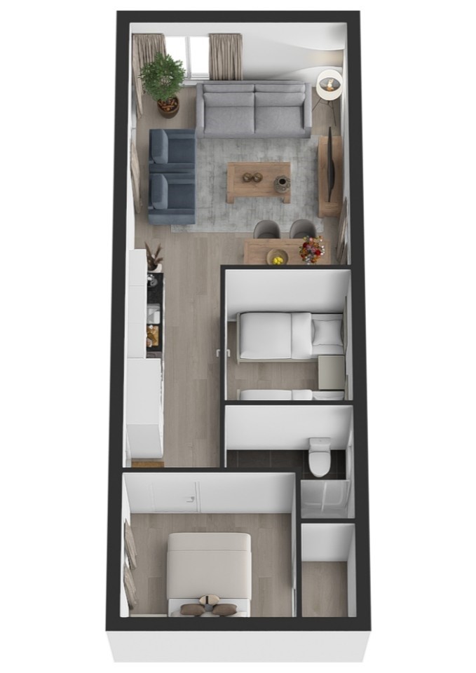 Lichte woonkamer met openslaande deuren naar het terras, open keuken voorzien van 4-pits gasfornuis, afzuigkap, vaatwasser, combimagnetron en koelkast met vriesvak, 2 slaapkamers waarvan 1 met vaste schuifkast, en badkamer voorzien van douche, toilet, wastafel en designradiator.