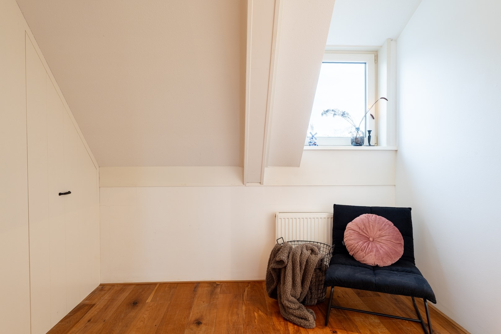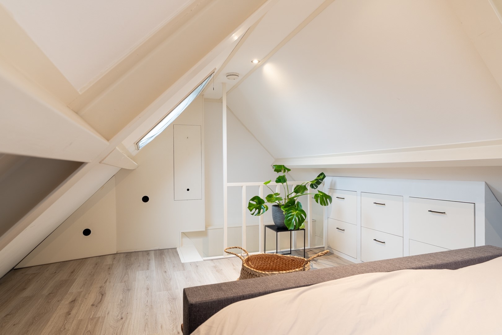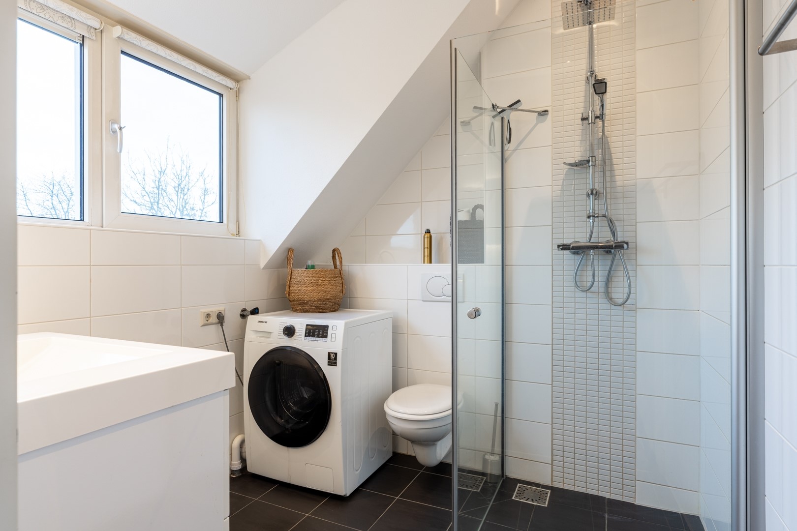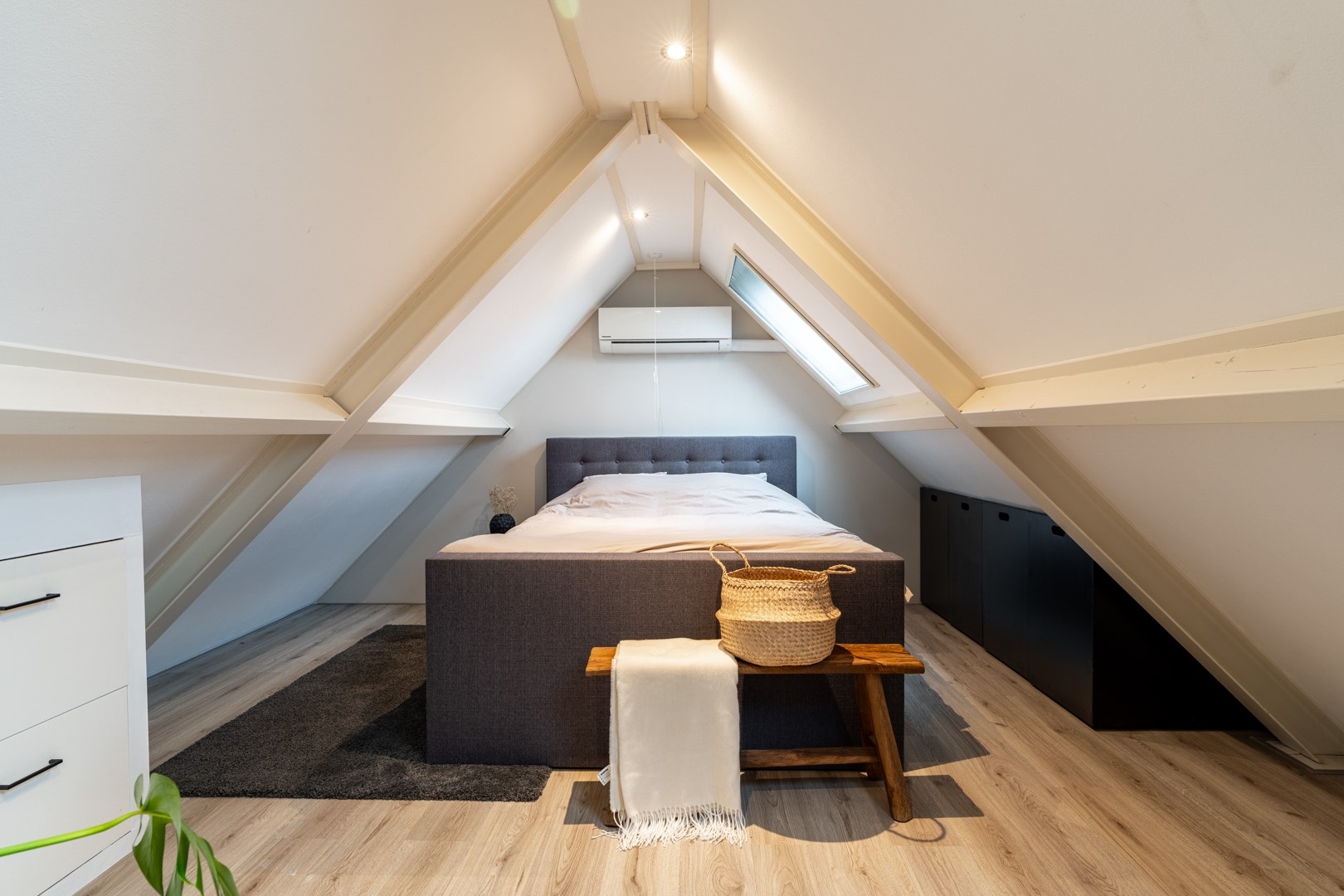 De zolderetage is een grote, comfortabele slaapkamer met twee dakramen die zorgen voor licht, lucht en een rustige sfeer. De recent vernieuwde cv-installatie (2025) is netjes weggewerkt in een bergkast bovenaan de trap. De badkamer op de woonverdieping is helemaal compleet met een inloopdouche, zwevend toilet, wastafelmeubel en een aansluiting voor de wasmachine.