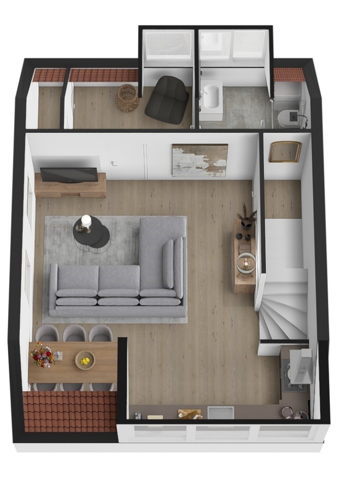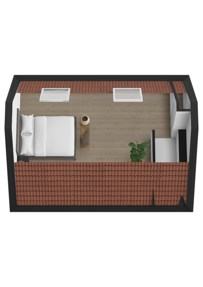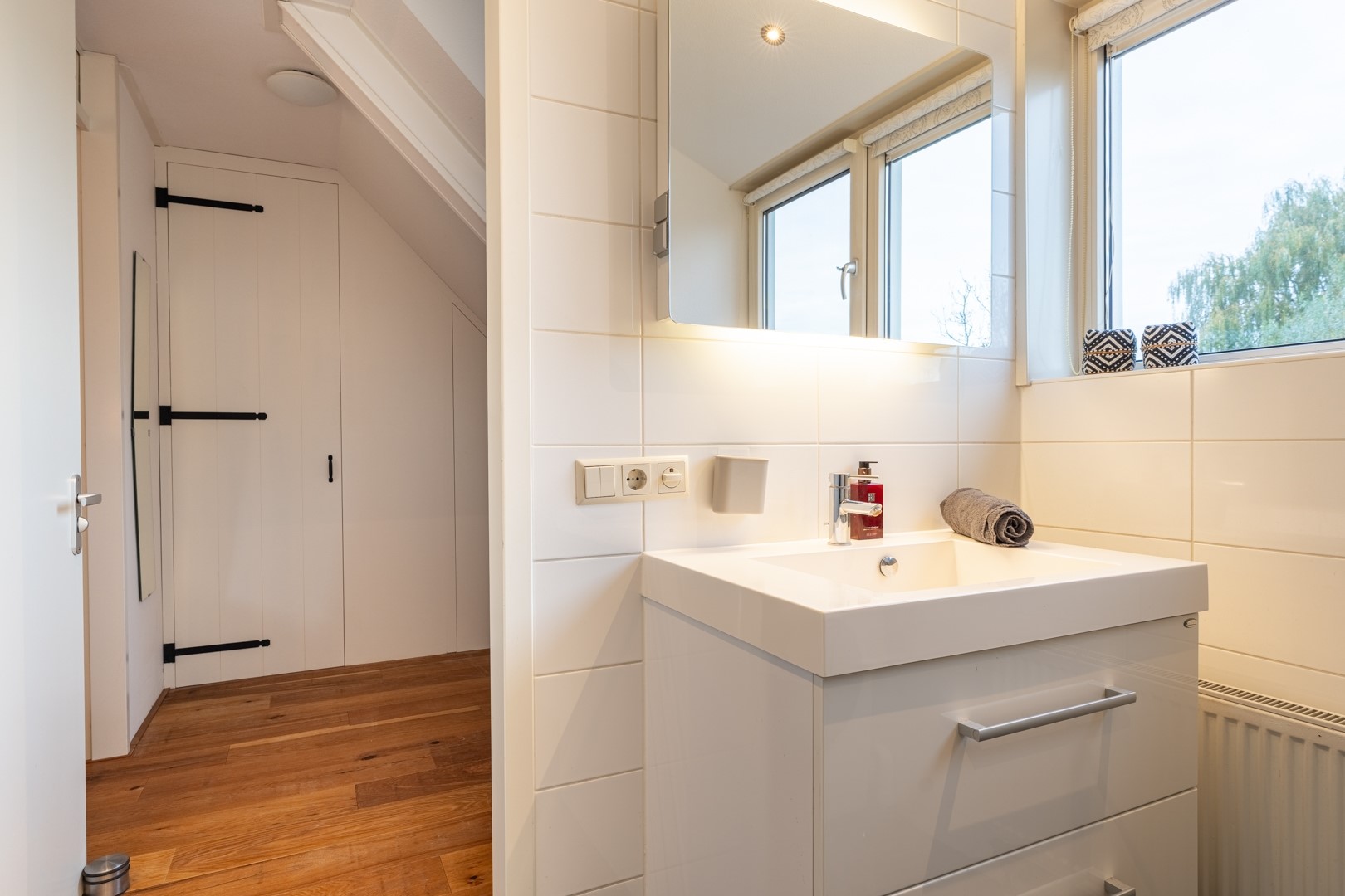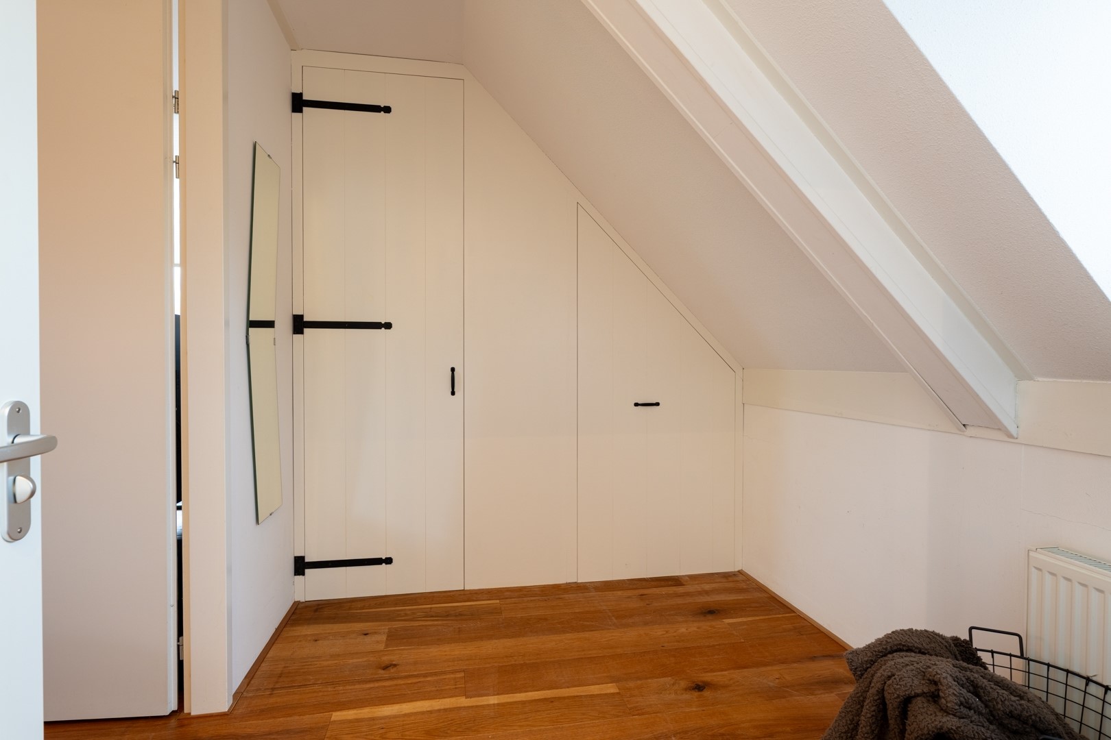 De zolderetage is een grote, comfortabele slaapkamer met twee dakramen die zorgen voor licht, lucht en een rustige sfeer. De recent vernieuwde cv-installatie (2025) is netjes weggewerkt in een bergkast bovenaan de trap. De badkamer op de woonverdieping is helemaal compleet met een inloopdouche, zwevend toilet, wastafelmeubel en een aansluiting voor de wasmachine.