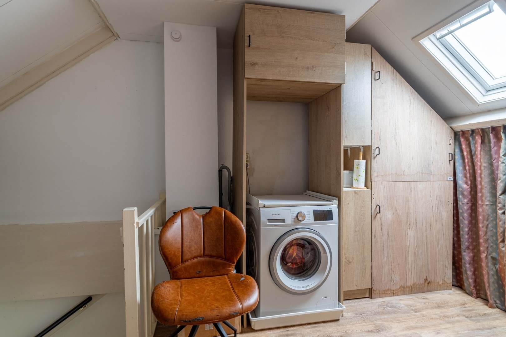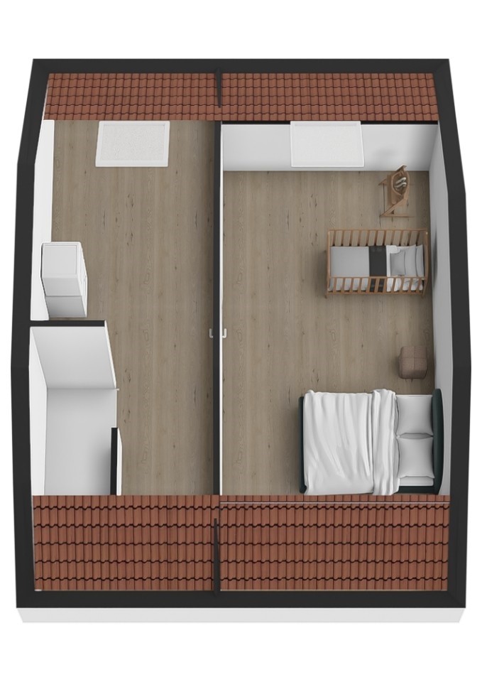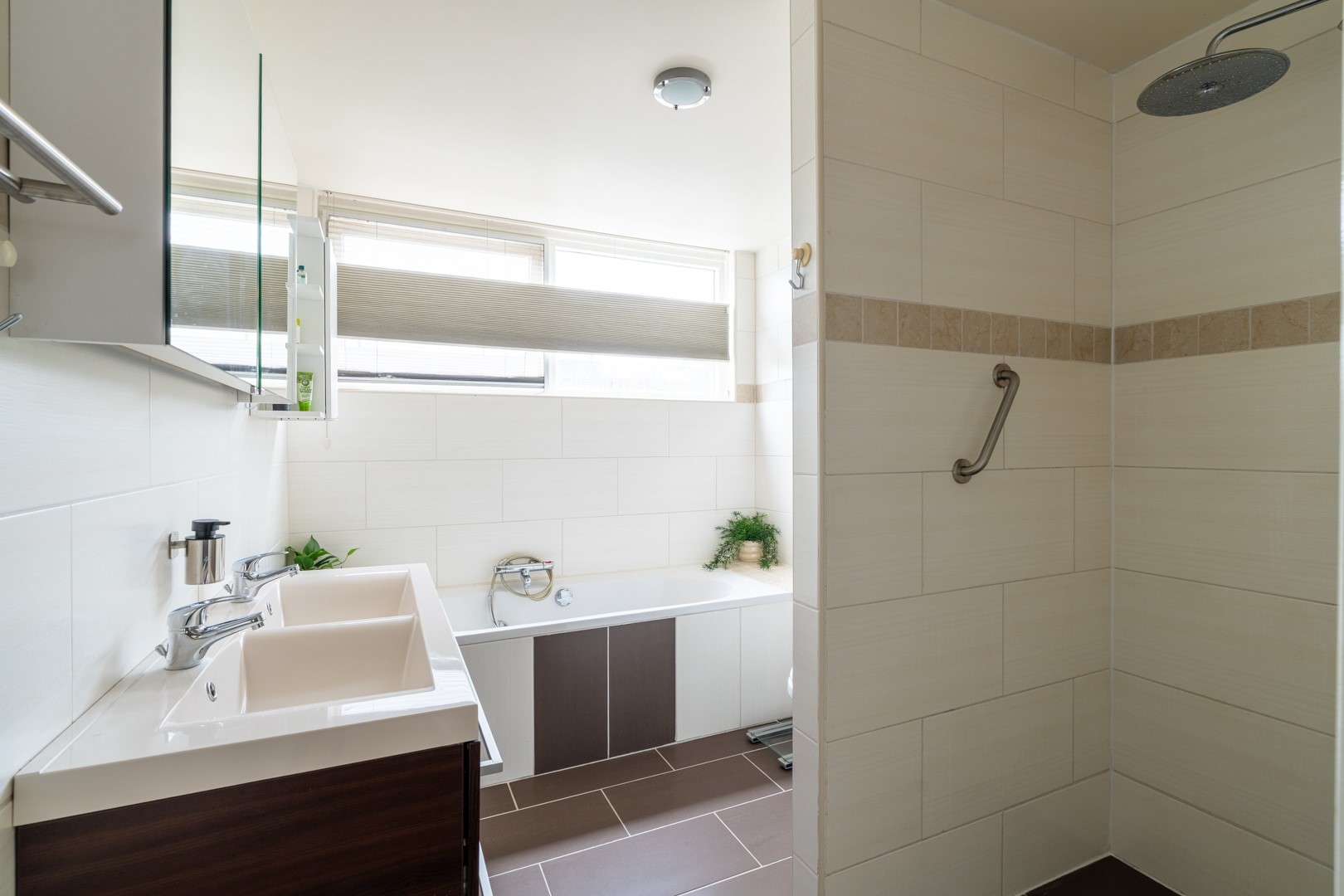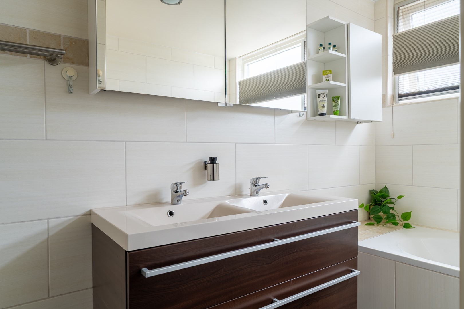 Ook boven is het ruim en relaxed. Drie flinke slaapkamers, een overloop met vaste kastruimte en een badkamer om jaloers op te worden: ligbad, inloopdouche met regendouche én handdouche, dubbele wastafel met meubel, zwevend toilet... alles erop en eraan. De zolder? Die bereik je met een vaste trap. Daar vind je nog een grote vierde slaapkamer met dakraam én een wasruimte met aansluitingen voor je wasmachine en droger.