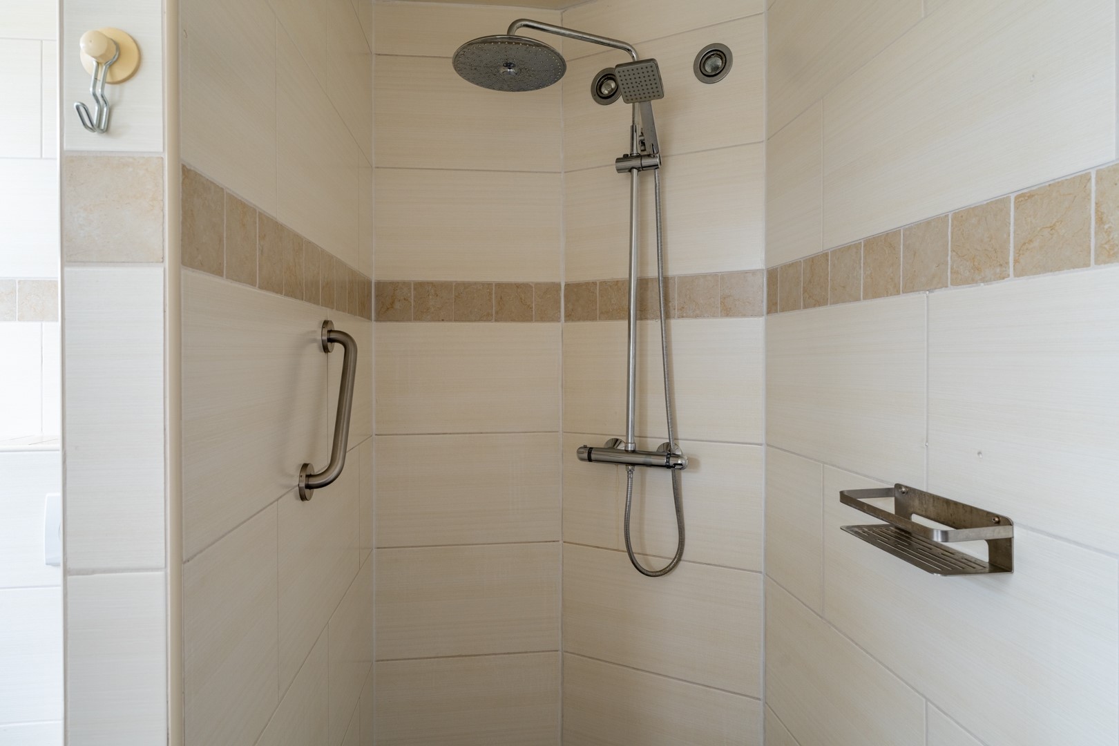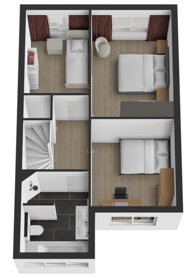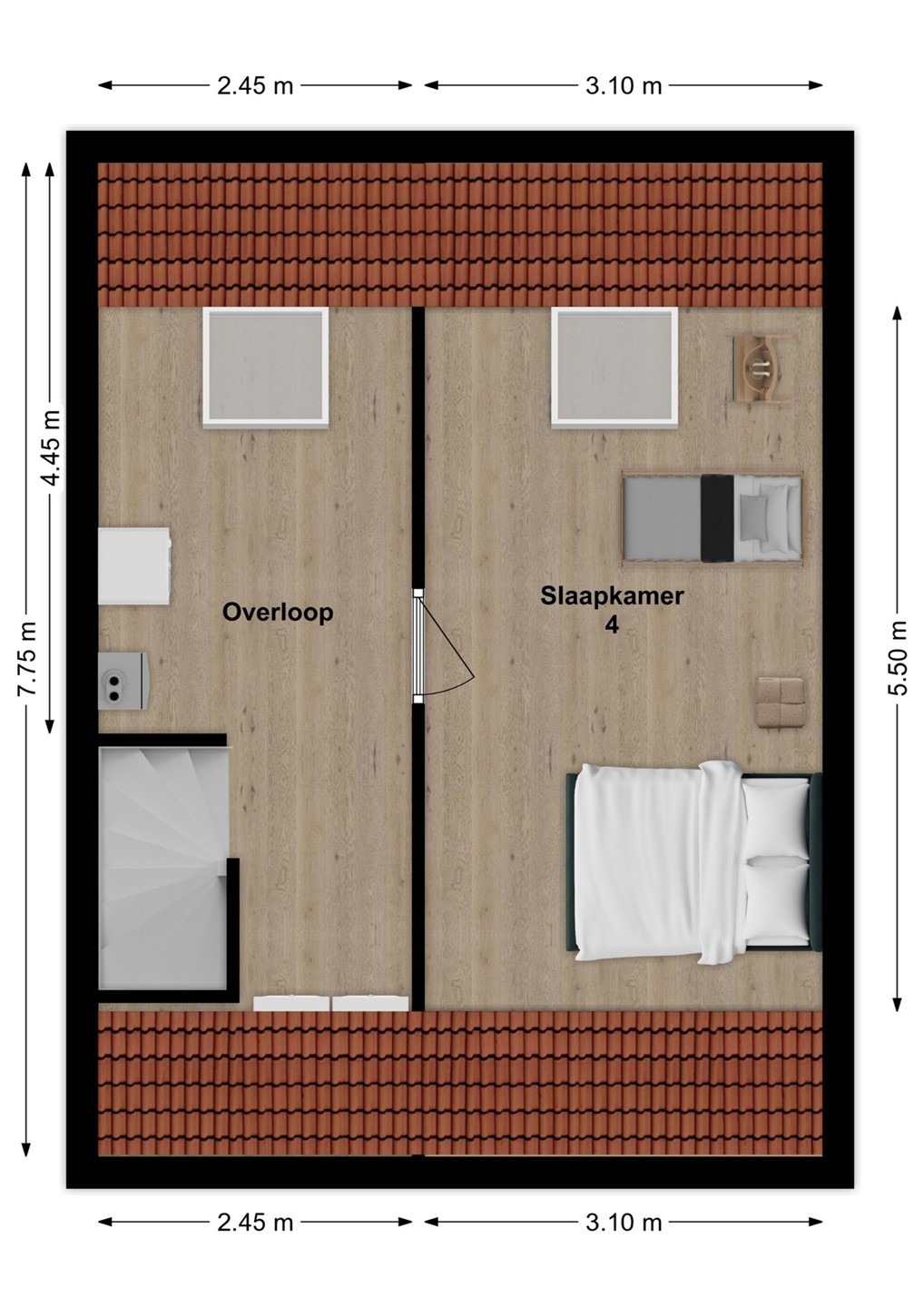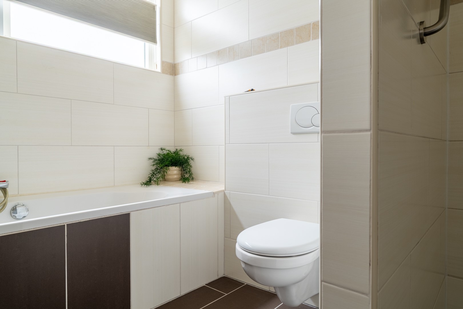 Ook boven is het ruim en relaxed. Drie flinke slaapkamers, een overloop met vaste kastruimte en een badkamer om jaloers op te worden: ligbad, inloopdouche met regendouche én handdouche, dubbele wastafel met meubel, zwevend toilet... alles erop en eraan. De zolder? Die bereik je met een vaste trap. Daar vind je nog een grote vierde slaapkamer met dakraam én een wasruimte met aansluitingen voor je wasmachine en droger.