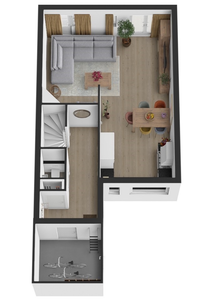 Binnenkomen kan via de voordeur, maar ook via de handige inpandige berging – ideaal voor natte jassen, tassen en schoenen. Binnen wacht je een warme ontvangst met slimme opbergruimte onder de trap en een strak, modern toilet. Aan de achterkant vind je de gezellige woonkamer met een knusse houtkachel en openslaande deuren naar het zonneterras. Heerlijk licht en lekker leefbaar!