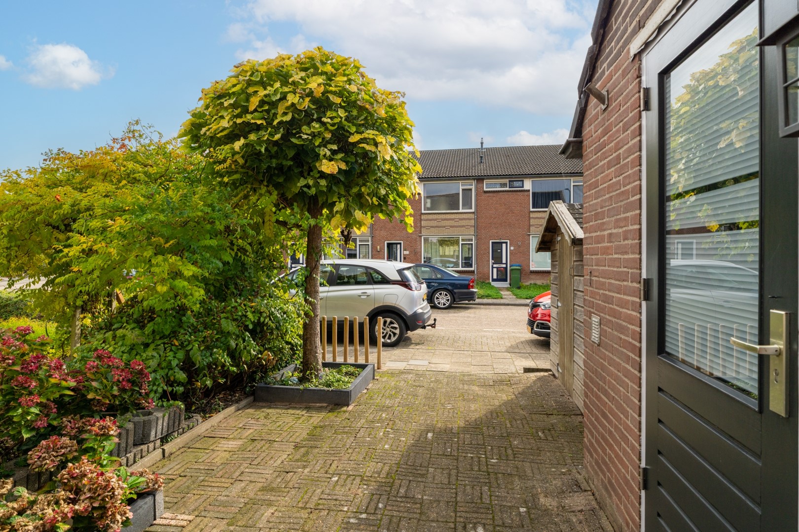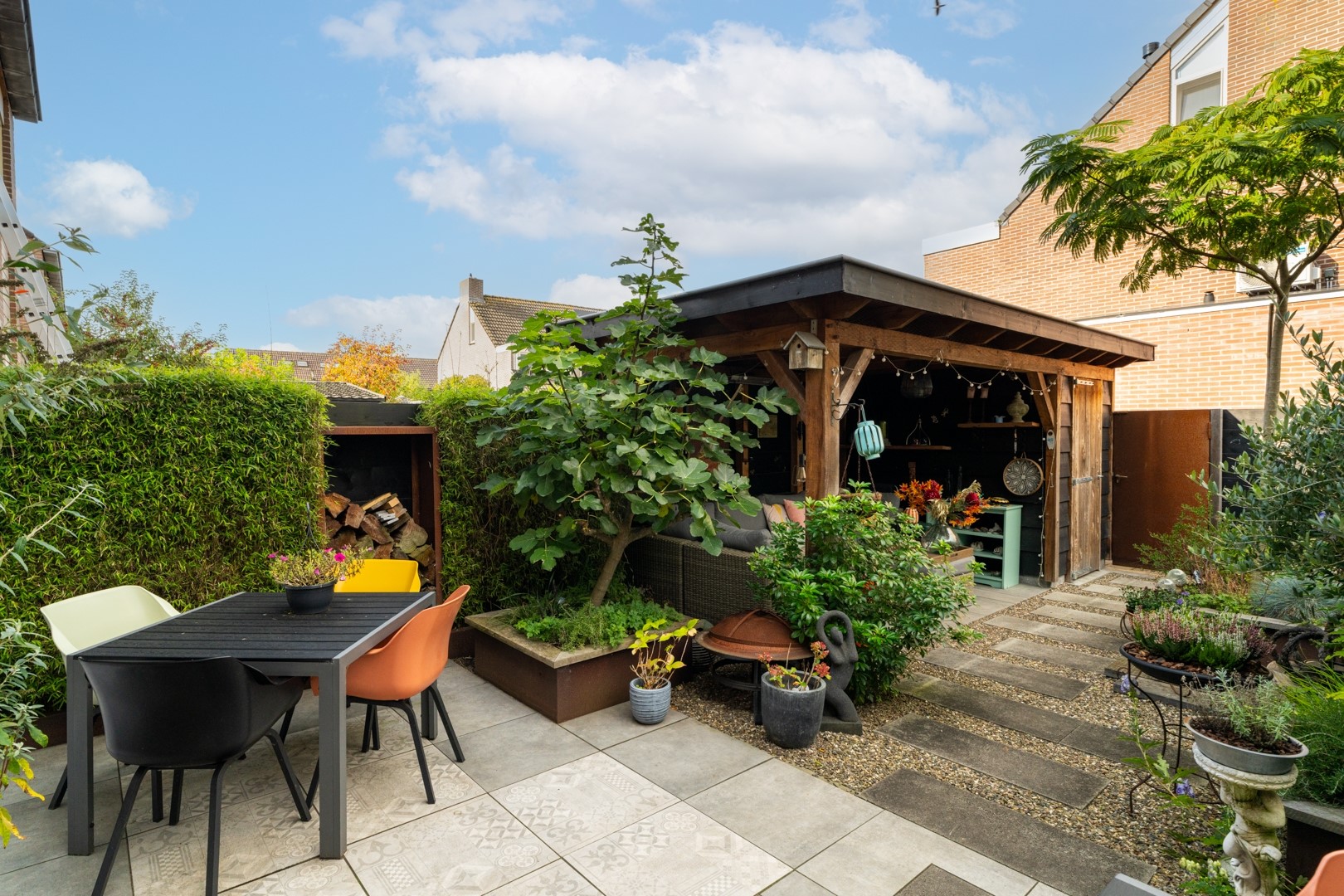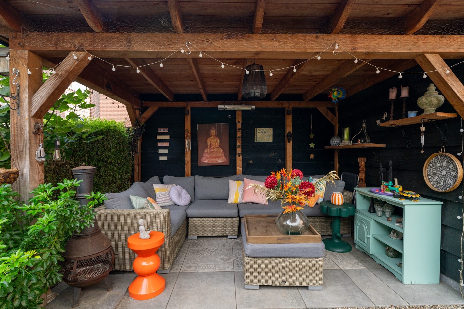 Zodra je de tuin in stapt, voelt het alsof je op vakantie bent. Onder architectuur aangelegd met een knipoog naar de Méditerranée: Portugese tegels, een speelse mix van bloembakken, siergrind, Zuid-Europese planten en een stoere poort van cortenstaal. De veranda met aansluitende berging maakt het plaatje compleet. Aan de voorkant nog een stukje siertuin en voldoende parkeergelegenheid op openbaar terrein.