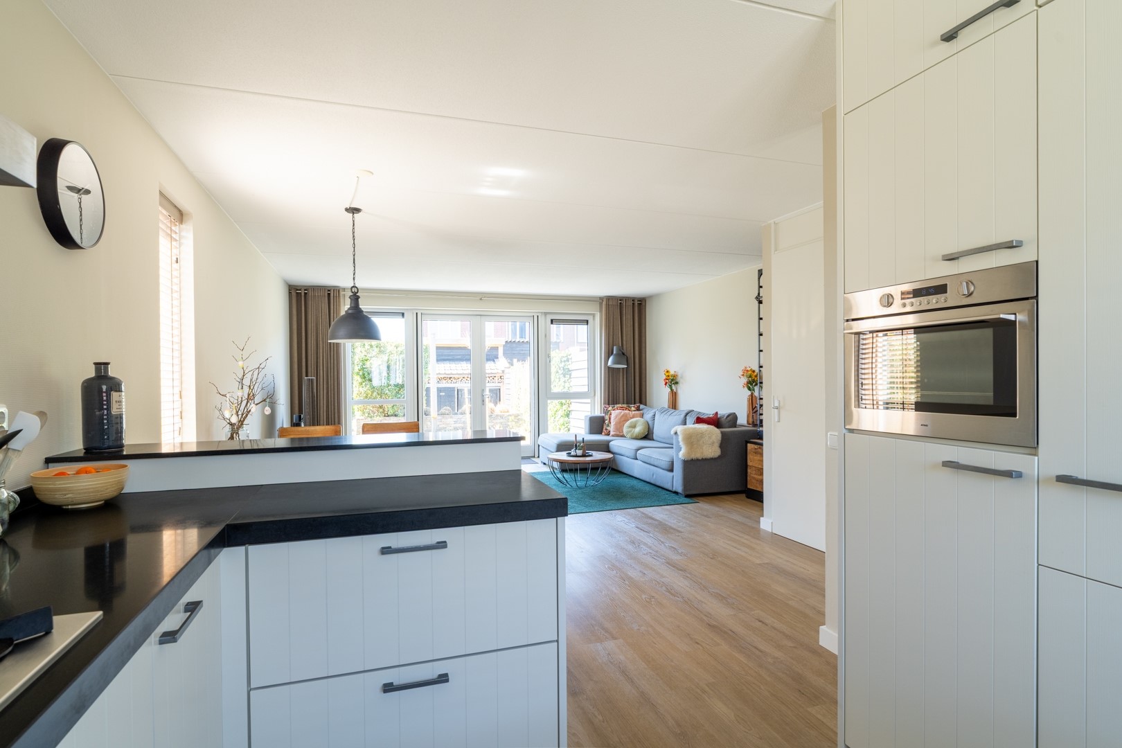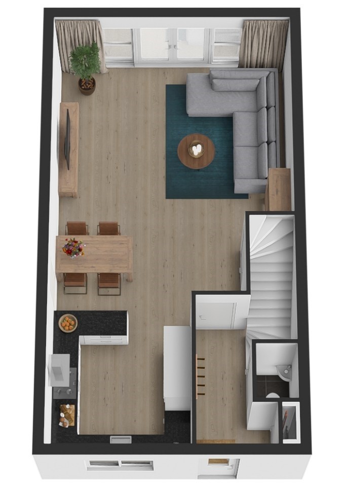 Je komt binnen in een nette en verzorgde hal met meterkast, toilet en trapopgang. Vanuit hier stap je de leefruimte in, waar direct opvalt hoe licht en ruim het geheel is. De open keuken is praktisch ingericht, netjes afgewerkt en voorzien van diverse inbouwapparatuur, waaronder een vaatwasser. Daarbij is er volop kastruimte – wel zo fijn. De uitgebouwde woonkamer biedt alle ruimte voor een comfortabele zithoek én een gezellige eethoek. Dankzij de openslaande tuindeuren loopt binnen naadloos over in buiten. Extra praktisch is de trapkast voor de nodige bergruimte. De begane grond is volledig voorzien van vloerverwarming. Dat betekent: geen radiatoren in het zicht én altijd warme voeten in de winter.