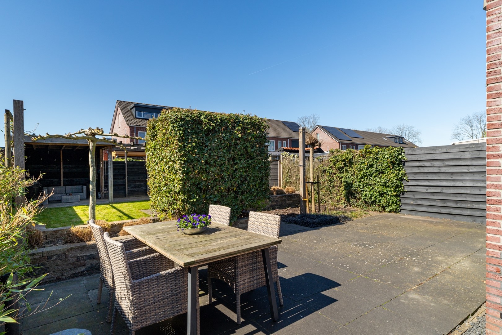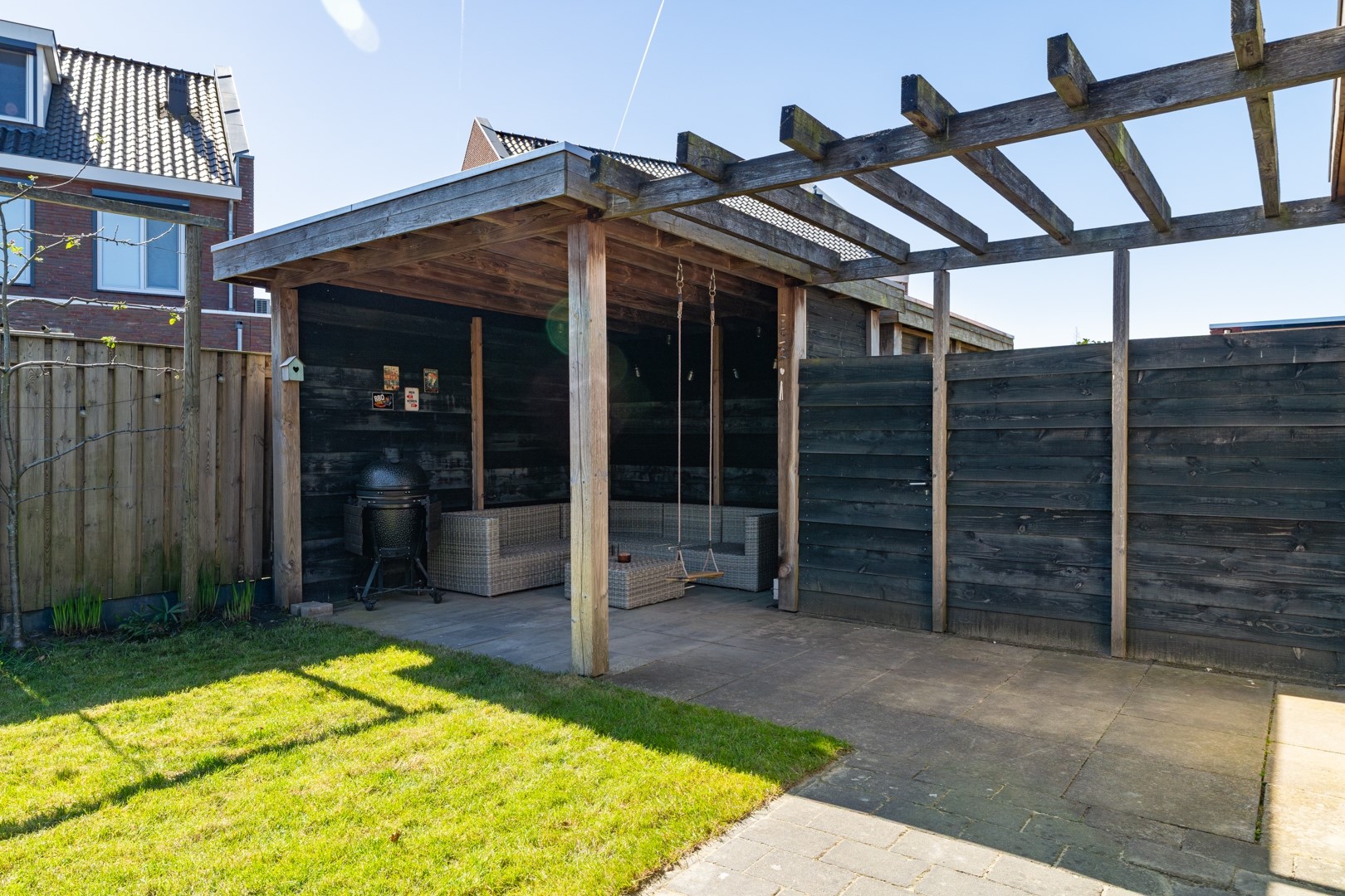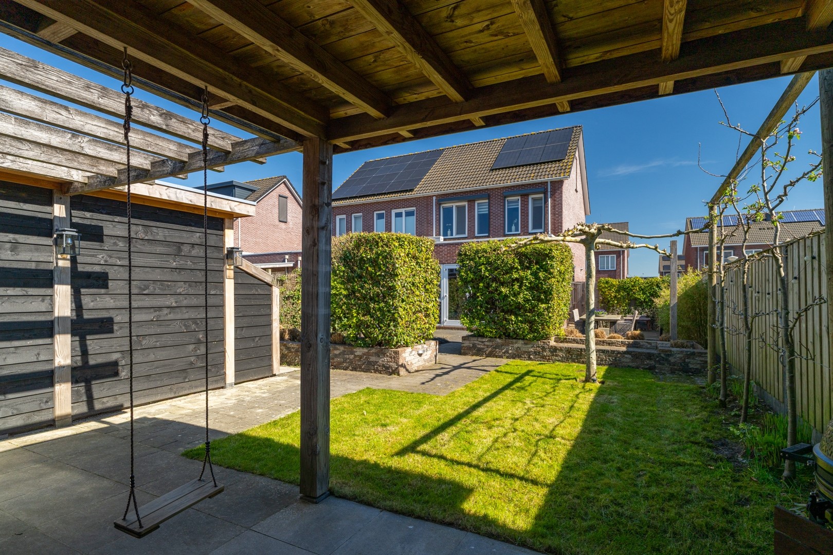 De buitenruimte is echt een groot pluspunt van deze woning. Aan de voorzijde vind je een verzorgde siertuin en een extra brede oprit. Hierdoor is er niet alleen ruimte voor meerdere auto’s, maar ook de mogelijkheid om een garage te realiseren mét achterom. De achtertuin is fraai aangelegd met een combinatie van gazon en sierbestrating. Achterin de tuin vind je een ruime overkapping – dé plek voor lange zomeravonden – én een extra grote berging.
