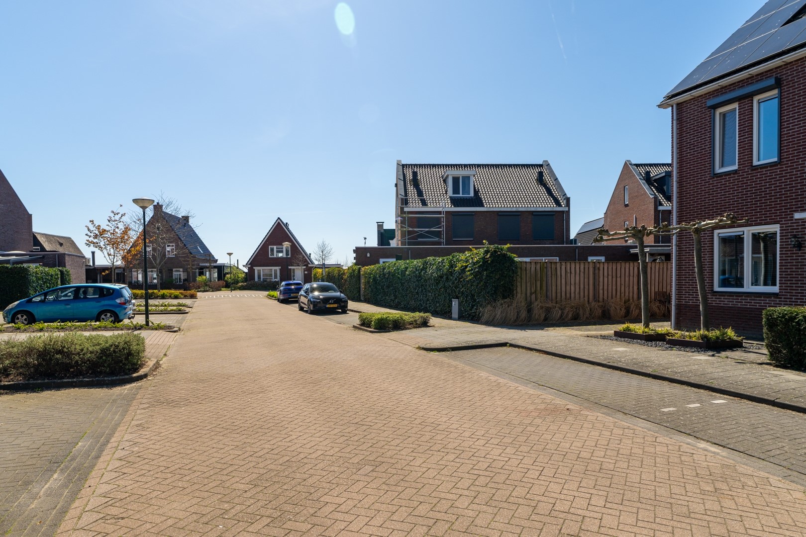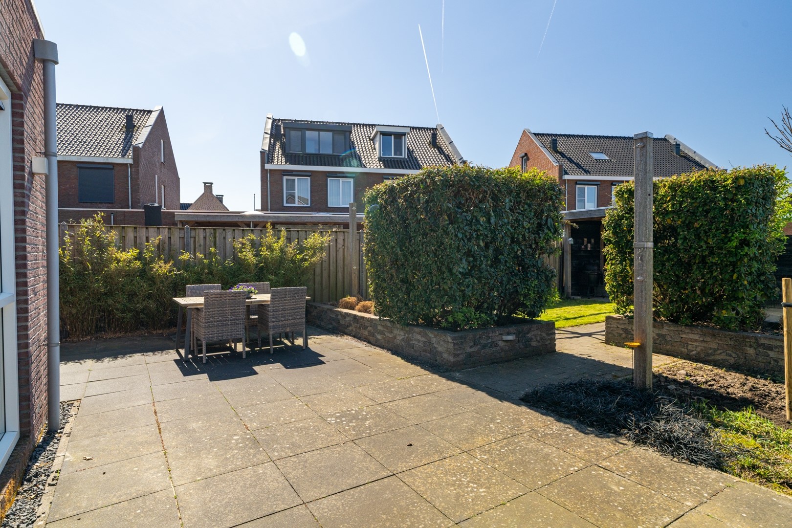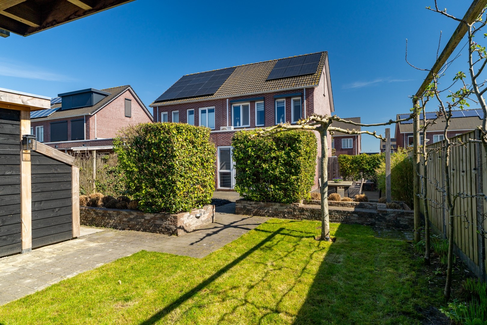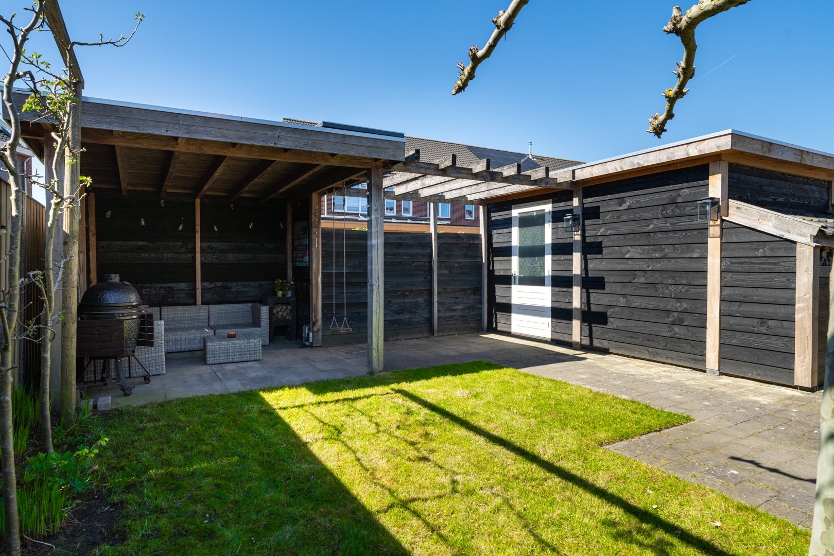 De buitenruimte is echt een groot pluspunt van deze woning. Aan de voorzijde vind je een verzorgde siertuin en een extra brede oprit. Hierdoor is er niet alleen ruimte voor meerdere auto’s, maar ook de mogelijkheid om een garage te realiseren mét achterom. De achtertuin is fraai aangelegd met een combinatie van gazon en sierbestrating. Achterin de tuin vind je een ruime overkapping – dé plek voor lange zomeravonden – én een extra grote berging.