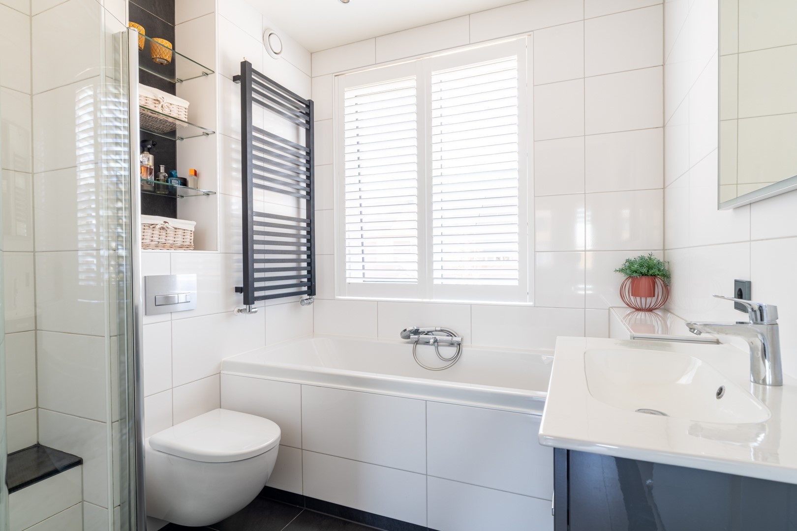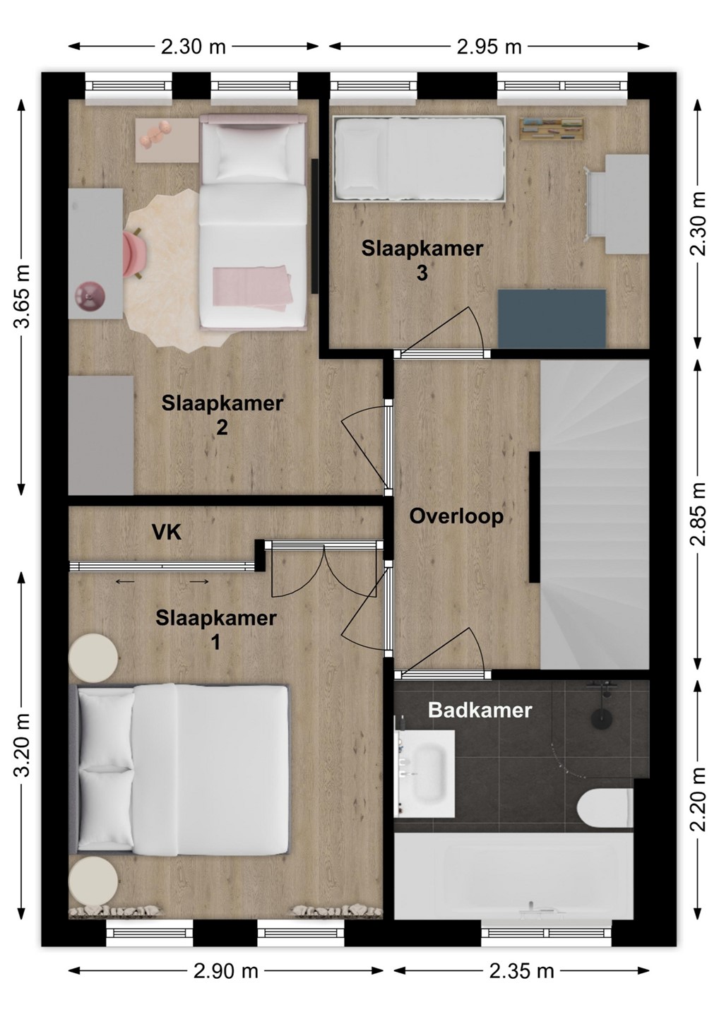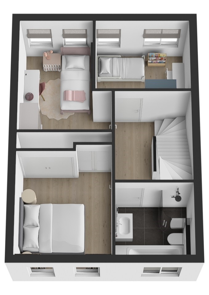 Op de eerste verdieping bevinden zich drie ruime slaapkamers, stuk voor stuk goed van formaat en ideaal voor een gezin. Of je nu kamers nodig hebt voor de kinderen, een thuiswerkplek of hobbyruimte – hier kan het allemaal. De badkamer is royaal, netjes afgewerkt en uitgevoerd in een neutrale stijl. Je vindt hier een inloopdouche, ligbad, wastafelmeubel en een toilet. Extra comfortabel: ook deze verdieping is voorzien van vloerverwarming, per ruimte regelbaar.
