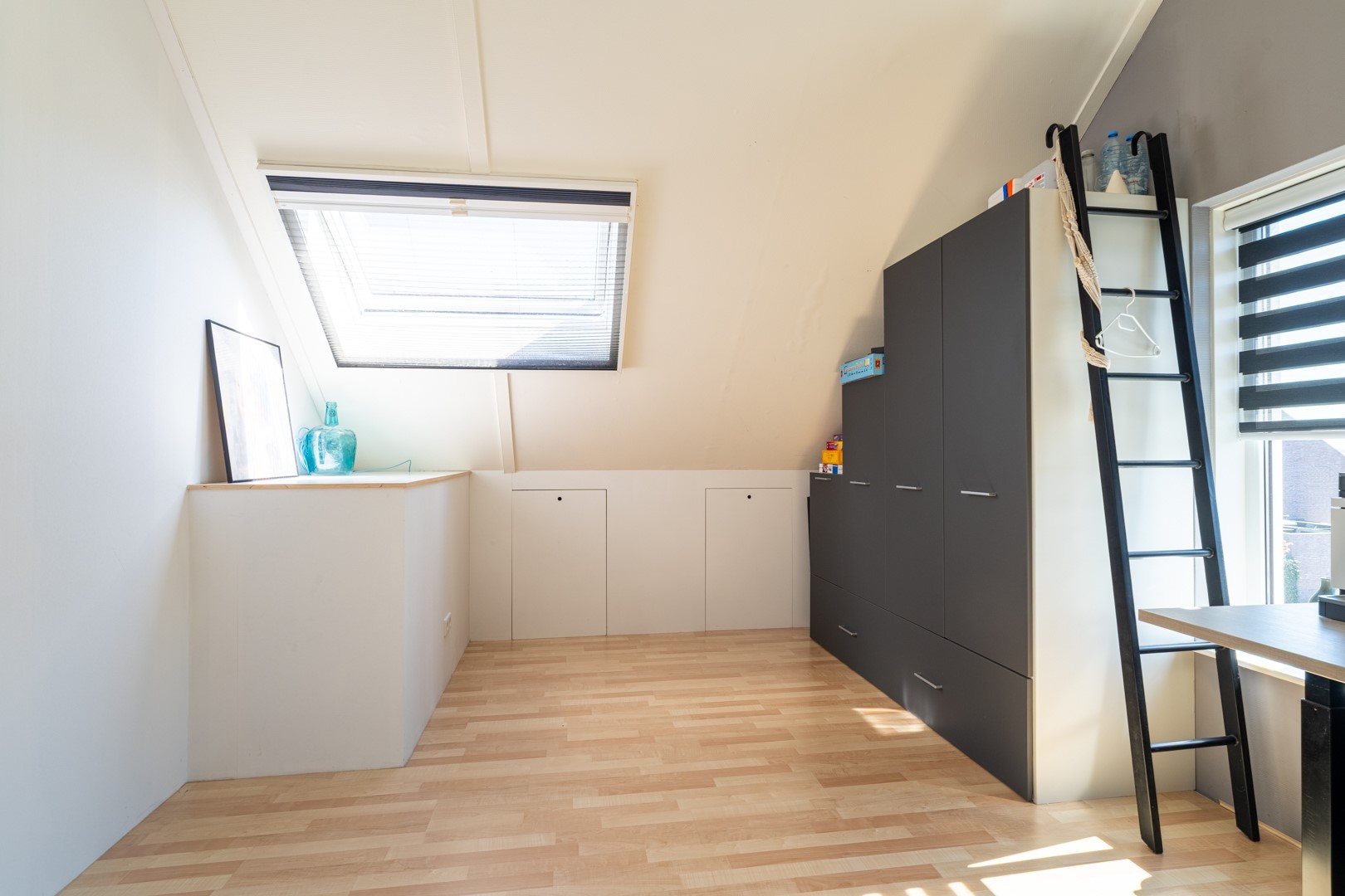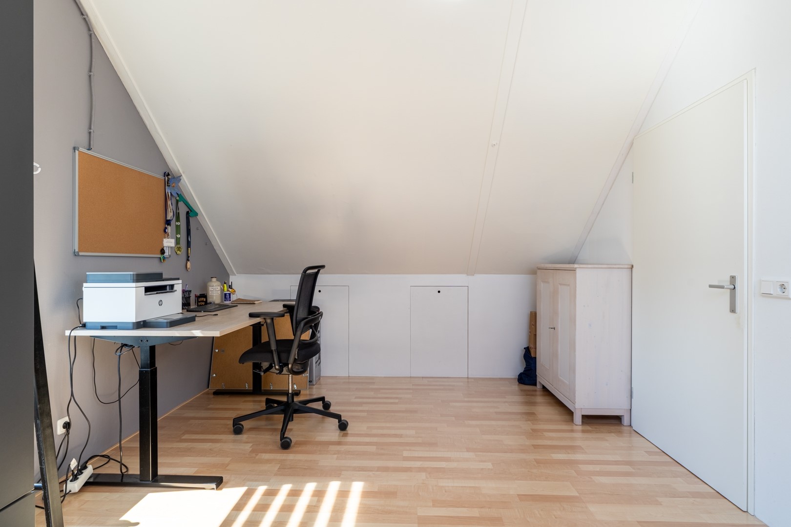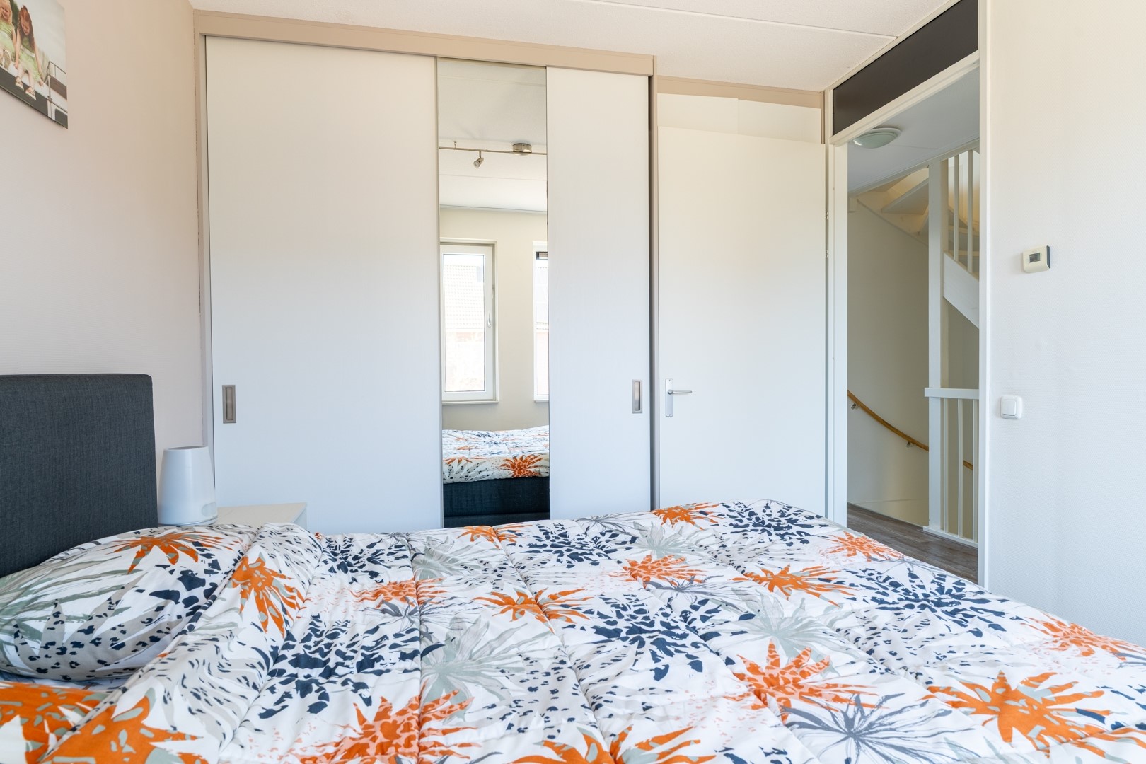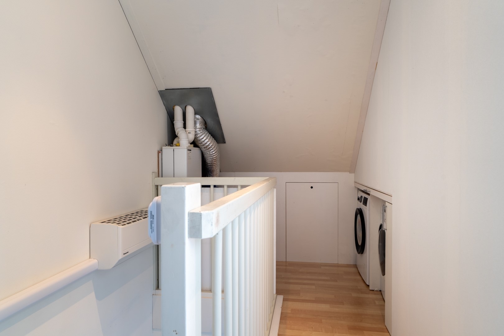 De tweede verdieping is een volwaardige woonlaag. Op de overloop vind je de technische installaties, waaronder de cv-ketel en de mechanische ventilatie-unit. Daarnaast is er een slimme, vaste kast gerealiseerd voor de wasmachine en droger – netjes weggewerkt en praktisch in gebruik. De grote vierde slaapkamer maakt deze verdieping compleet. Een fijne, lichte ruimte die zich perfect leent als slaapkamer, werkplek of hobbykamer.