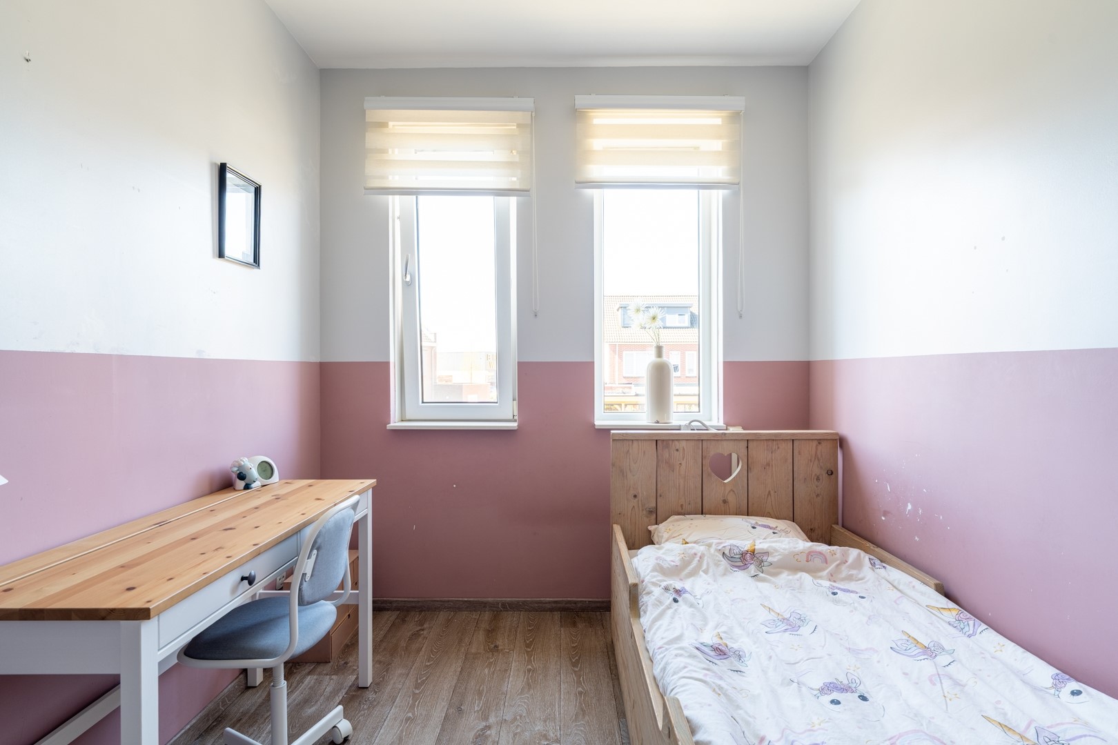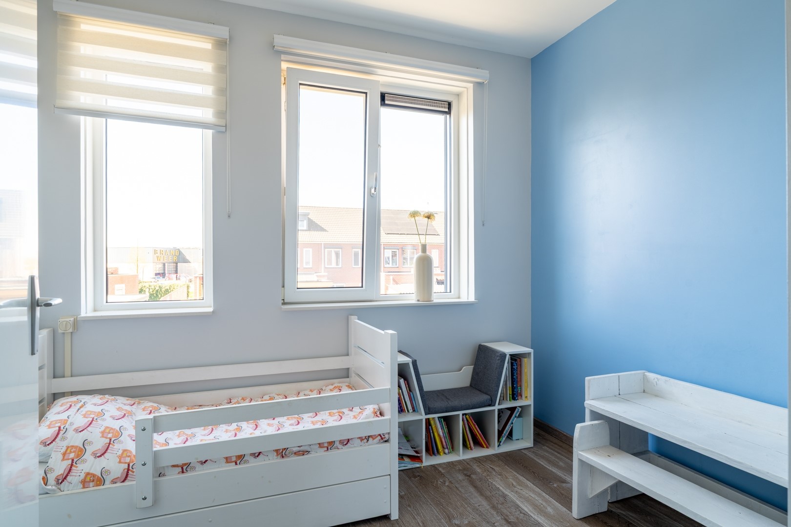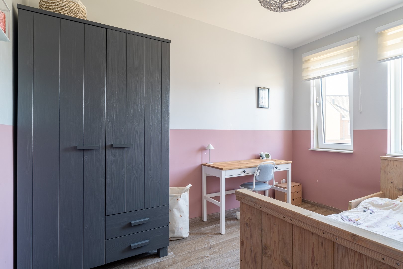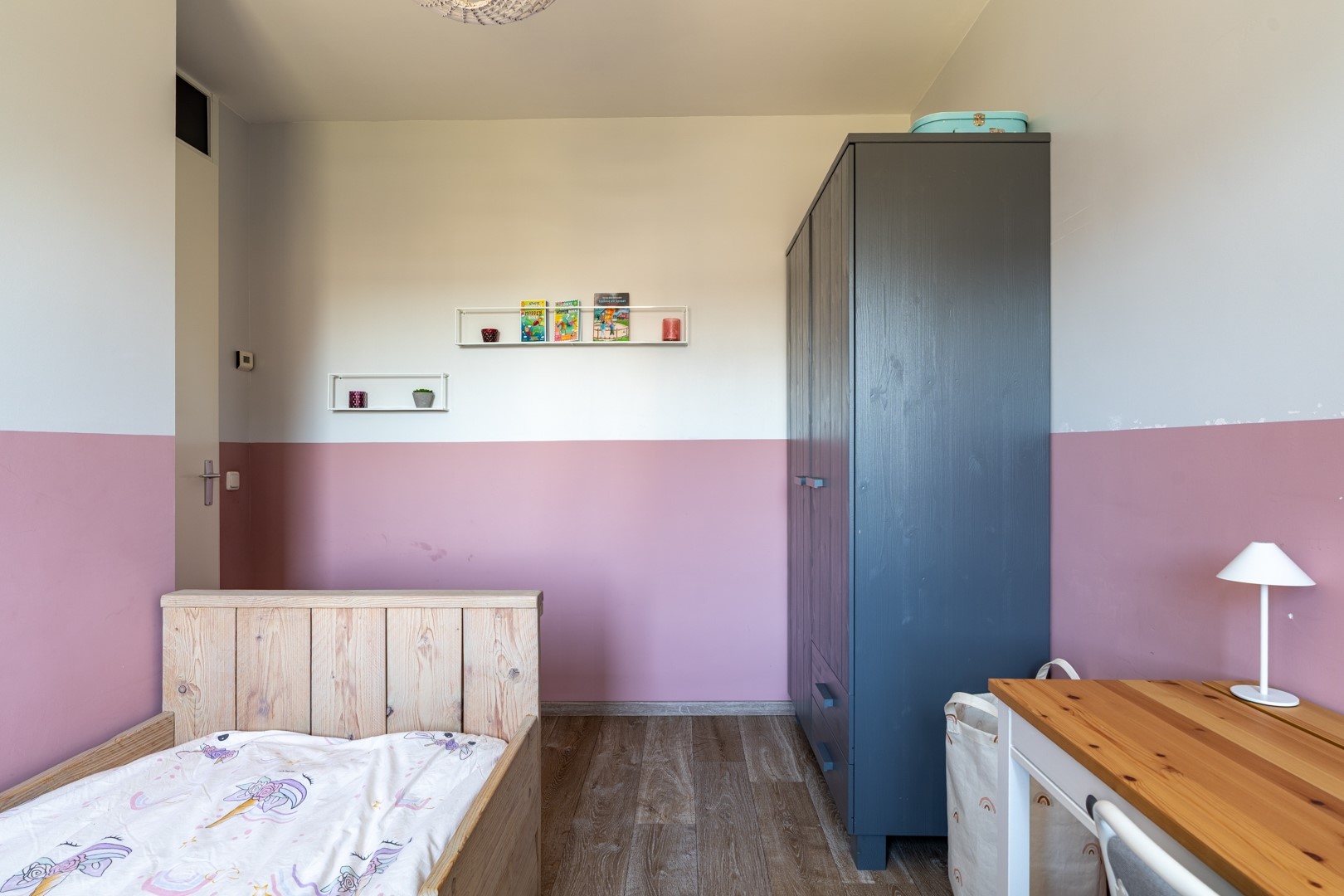 De tweede verdieping is een volwaardige woonlaag. Op de overloop vind je de technische installaties, waaronder de cv-ketel en de mechanische ventilatie-unit. Daarnaast is er een slimme, vaste kast gerealiseerd voor de wasmachine en droger – netjes weggewerkt en praktisch in gebruik. De grote vierde slaapkamer maakt deze verdieping compleet. Een fijne, lichte ruimte die zich perfect leent als slaapkamer, werkplek of hobbykamer.