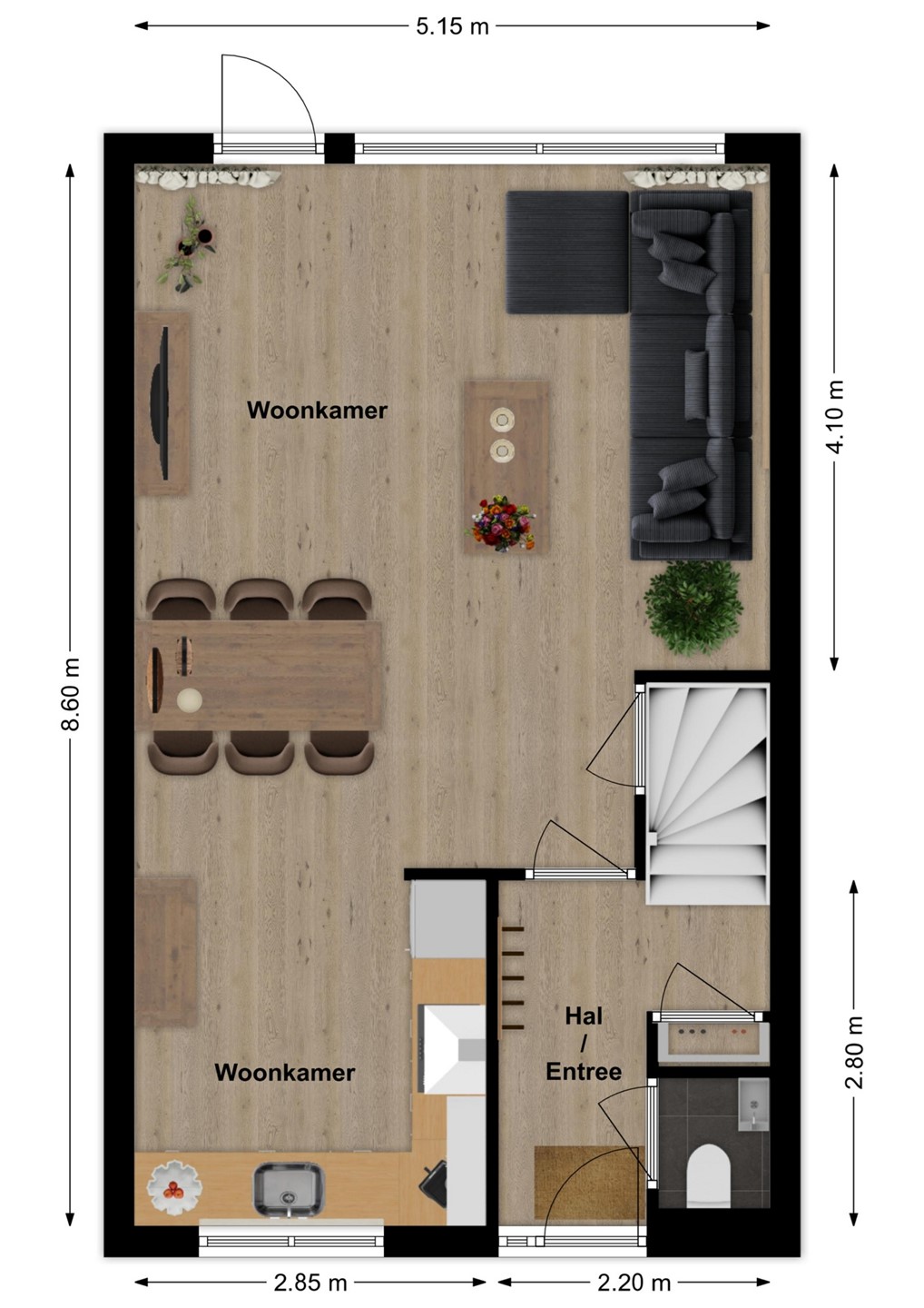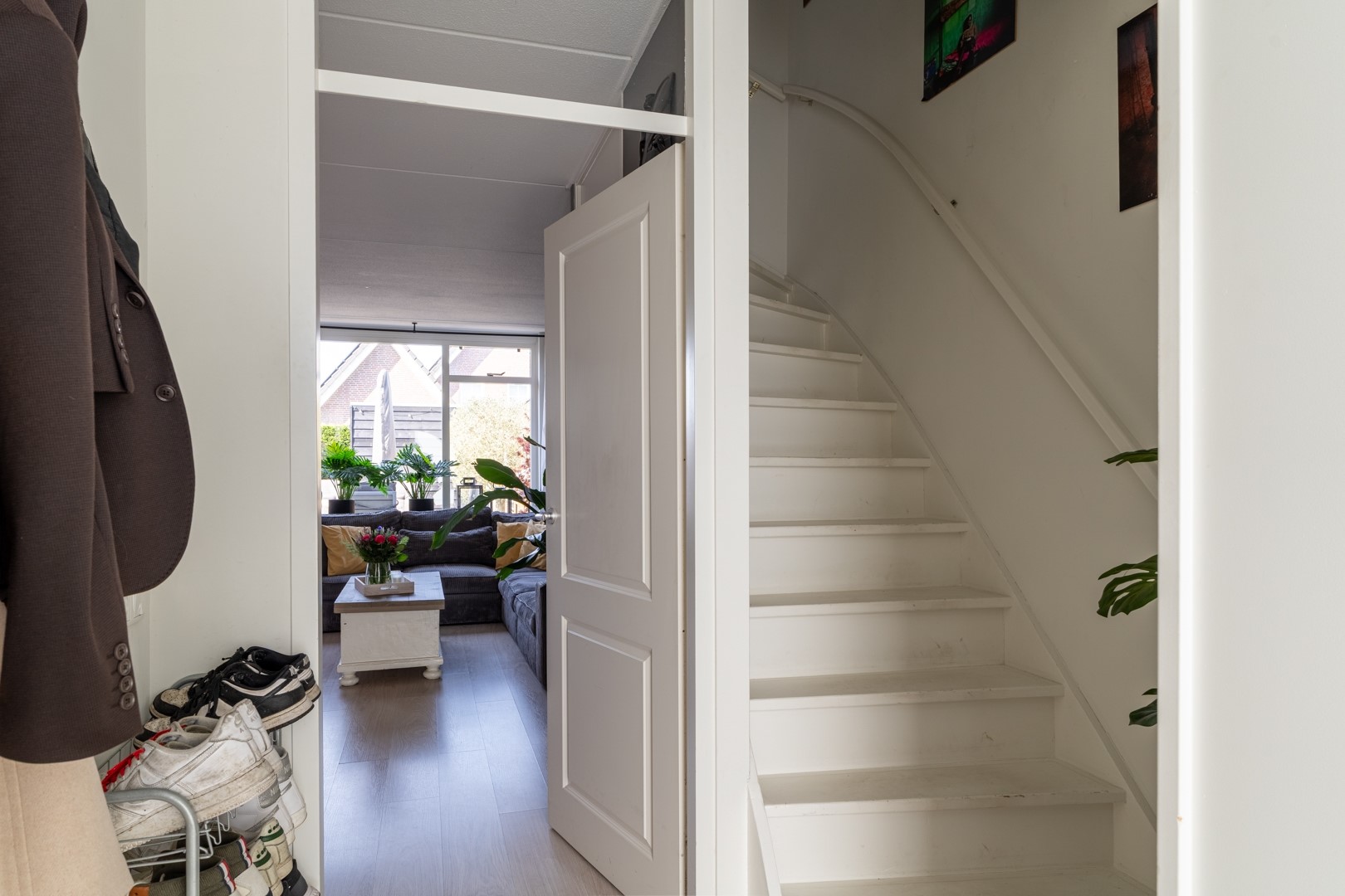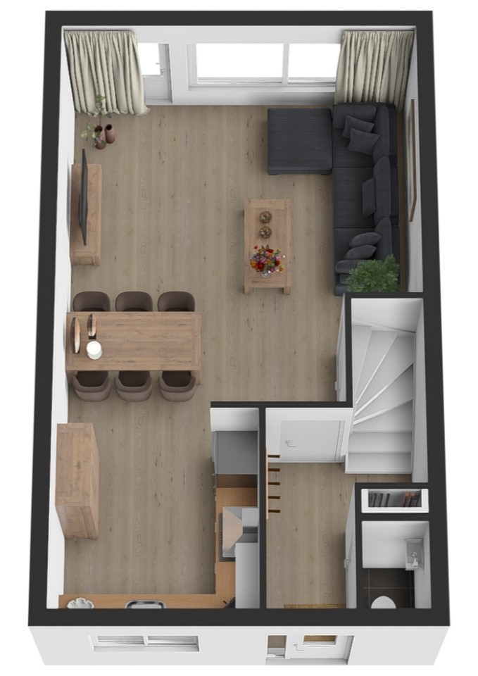 Je loopt vanaf de parkeerplek zo je huis binnen. In de hal vind je het toilet, de trap naar boven en toegang tot de woonkamer. Extra chill: de handige bergruimte onder de trap. De woonkamer is lekker breed, waardoor je alle vrijheid hebt om ‘m in te richten zoals jij wilt. Van chillhoek tot eettafel met vrienden – alles past. Via de deur loop je zo de tuin in.