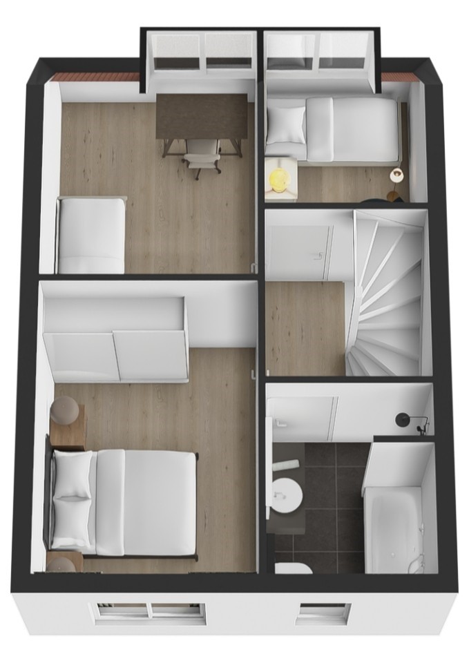 Op de eerste verdieping vind je drie ruime slaapkamers en een strakke badkamer. Dankzij de grote dakkapel zijn de kamers aan de achterkant extra ruim en licht. De badkamer is echt een luxe upgrade: ligbad, inloopdouche, zwevend toilet, modern wastafelmeubel en een designradiator. En dan de bonus. De zolder! Nu ingericht als gameroom, maar perfect als werkplek, extra slaapkamer of wasruimte. Dankzij de dakramen is het hier lekker licht en goed geventileerd.
