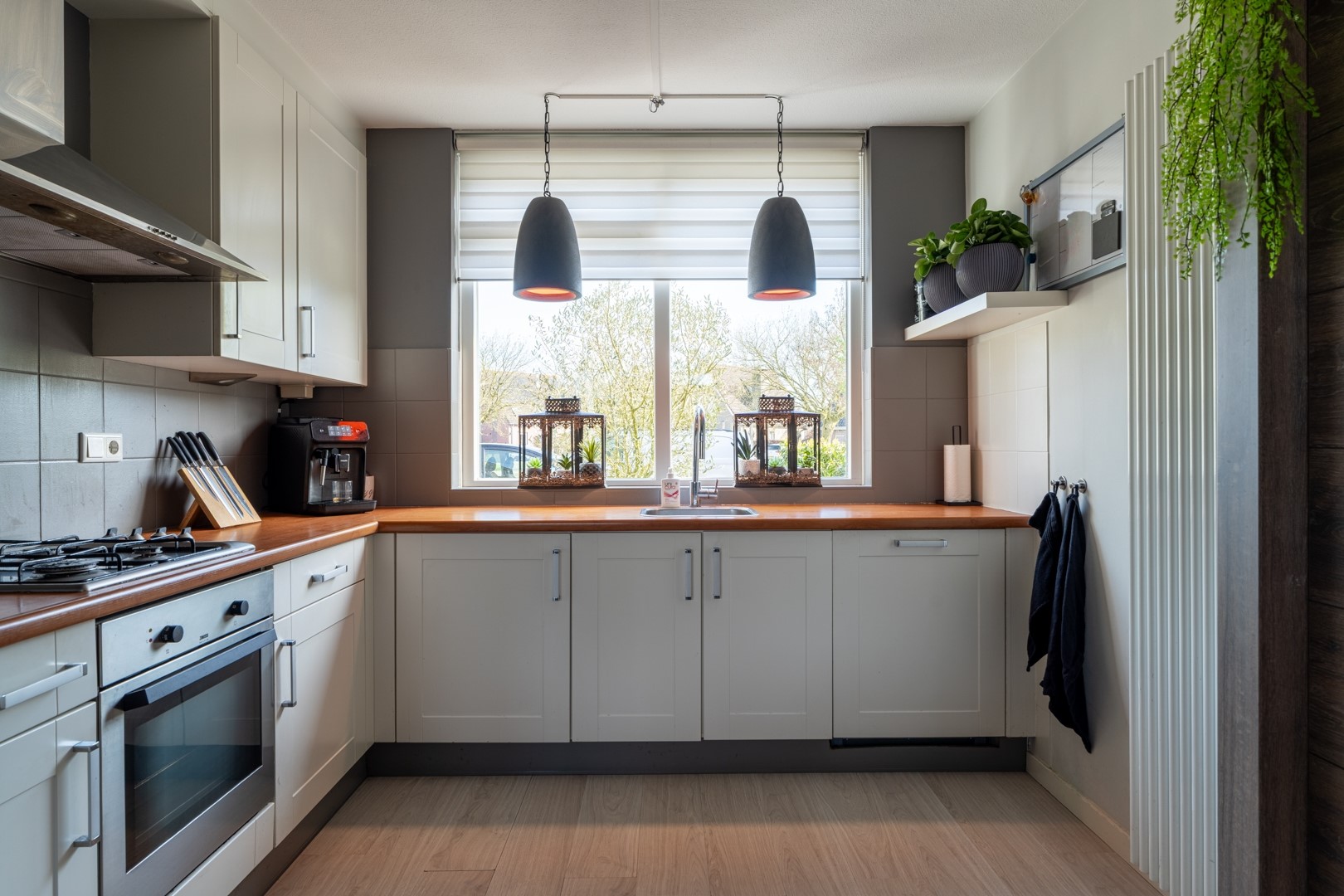 De keuken ligt aan de voorzijde en heeft een fijne hoekopstelling. Alles wat je nodig hebt is er: gaskookplaat, rvs afzuigkap, vaatwasser, oven en een koel/vriescombi (ter overname). Hier kook je makkelijk je favoriete meals of mix je iets snels in elkaar.