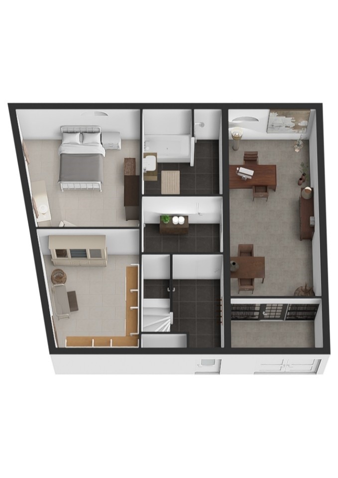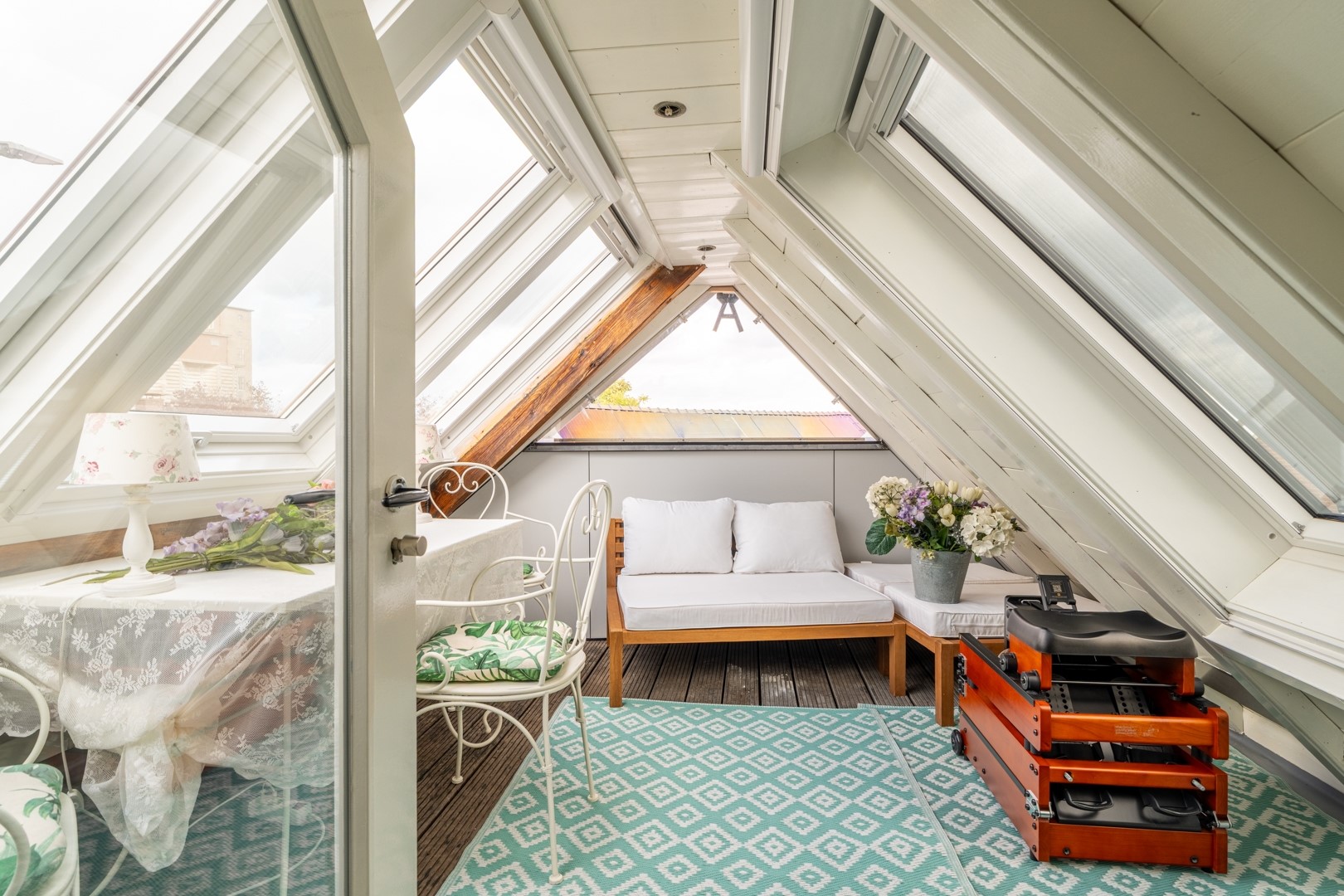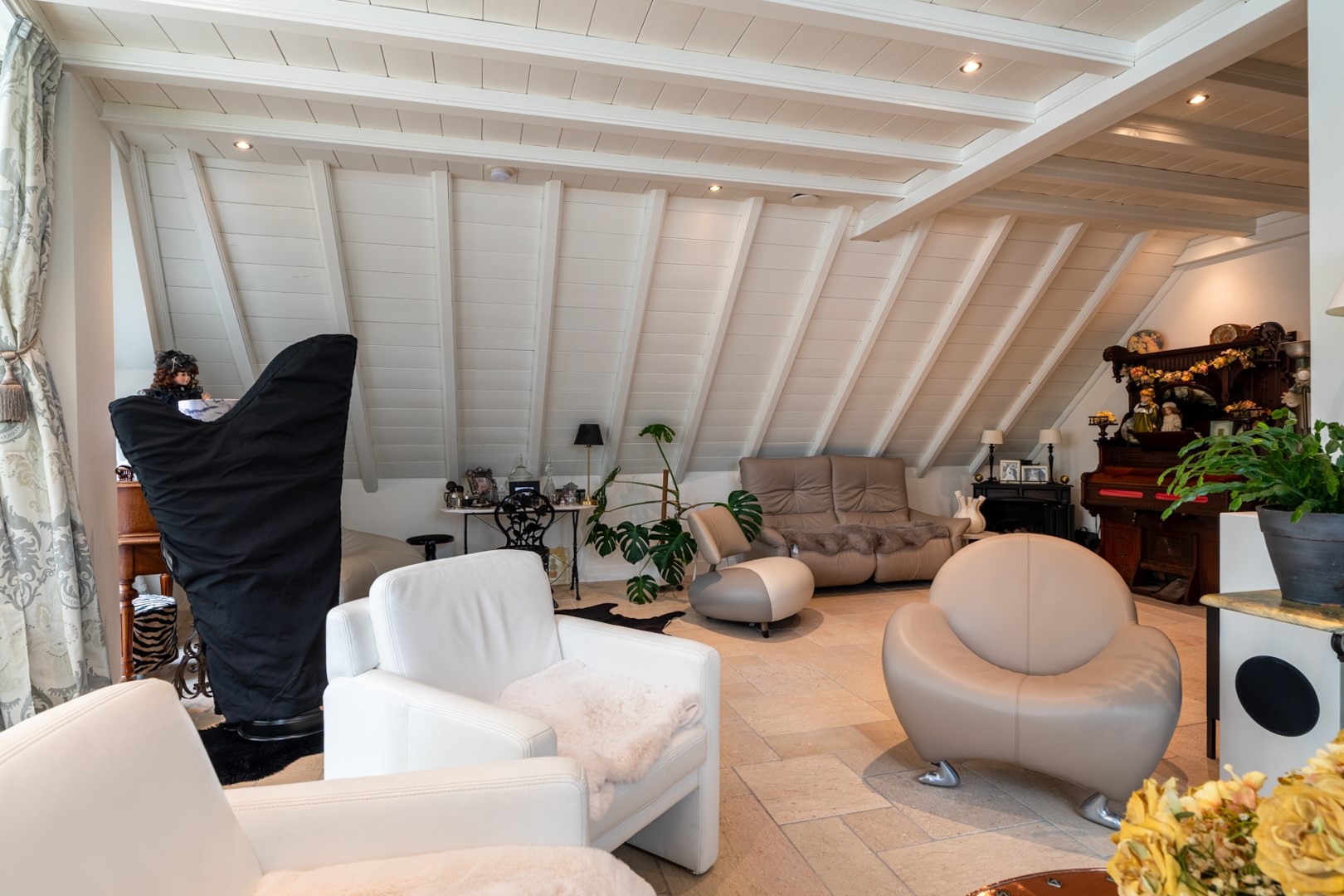 Het souterrain biedt veel mogelijkheden. Hier bevinden zich twee ruime slaapkamers, met de mogelijkheid een derde slaapkamer te creëren in de multifunctionele ruimte. De luxe badkamer is afgewerkt met natuursteen en voorzien van een inloopdouche, ligbad, modern wastafelmeubel en toilet – een echte spa-ervaring in eigen huis! Daarnaast is er een aansluiting voor spiegelverwarming en een geïntegreerde muziekinstallatie. Op de bovenverdieping vind je een grote slaapkamer met toegang tot de loggia, waar je in alle seizoenen de hele dag heerlijk kunt genieten van de zon, aangezien hij volledig afsluitbaar is gemaakt door middel van Velux (kunststof) dakramen en een verwijderbare polycarbonaat voorkant. Door de panorama dakvensters, 90 graden te openen, kun je zomers ook van de zon en het buitengevoel genieten. Vanuit de loggia heb je en prachtig uitzicht op de Maas.