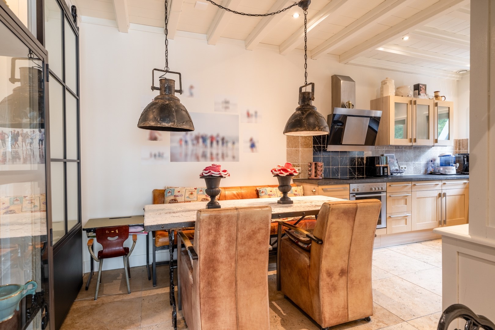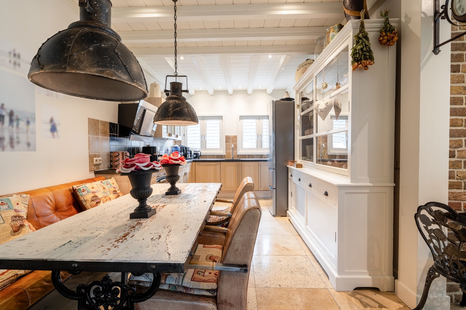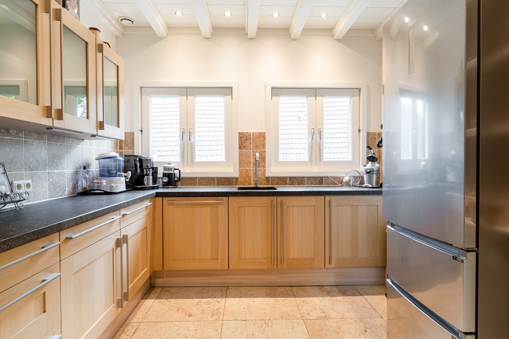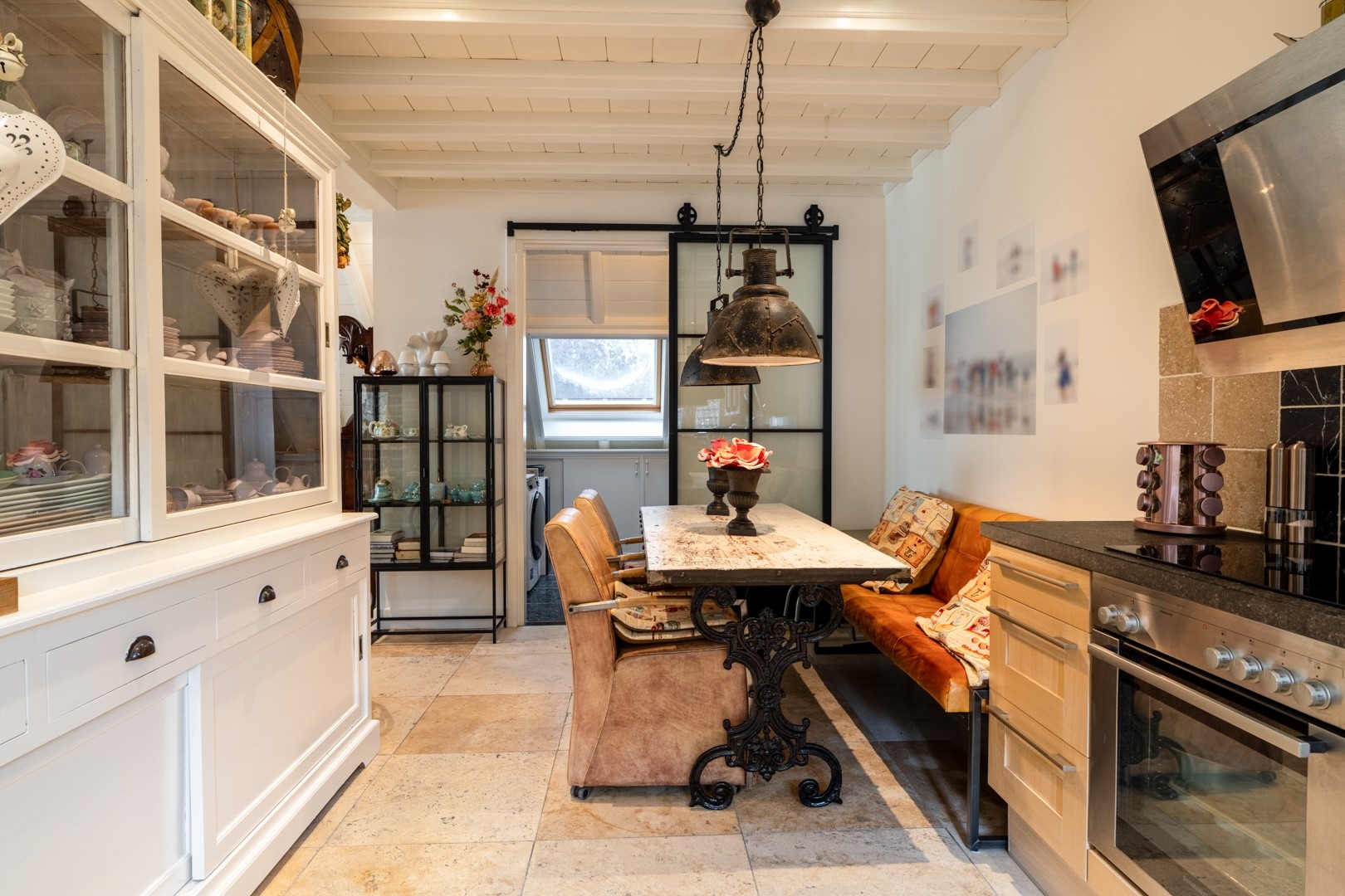 De woonkamer op dijkniveau is een lichte, royale leefruimte van circa 58 m². De vloer is voorzien van speksteentegels (ivoorkleurig), die samen met het travertin in de keuken en het souterrain de warmte uitstekend vasthouden – heerlijk comfortabel in zomer én winter. Dankzij de erker en grote raampartijen is er volop lichtinval en een prachtig uitzicht over de omgeving. De woonkeuken is praktisch ingedeeld met een nette hoekopstelling en voorzien van moderne inbouwapparatuur, zoals oven, inductie kookplaat uit 2022 met afzuiging en een vaatwasser. Naast de keuken ligt de bijkeuken: extra bergruimte, witgoedaansluitingen én de technische installaties (cv en WTW). Alles bij elkaar vormt dit een functioneel en comfortabel geheel, klaar om direct zorgeloos in te trekken.