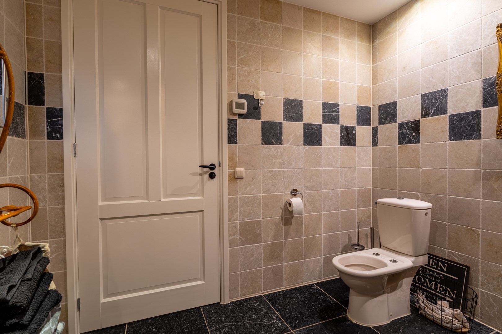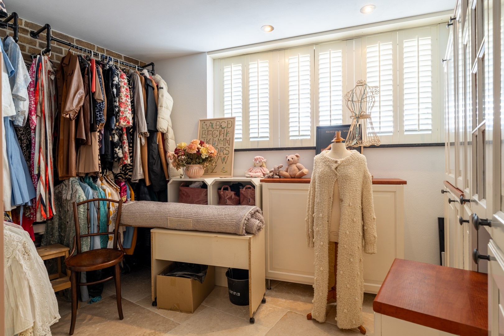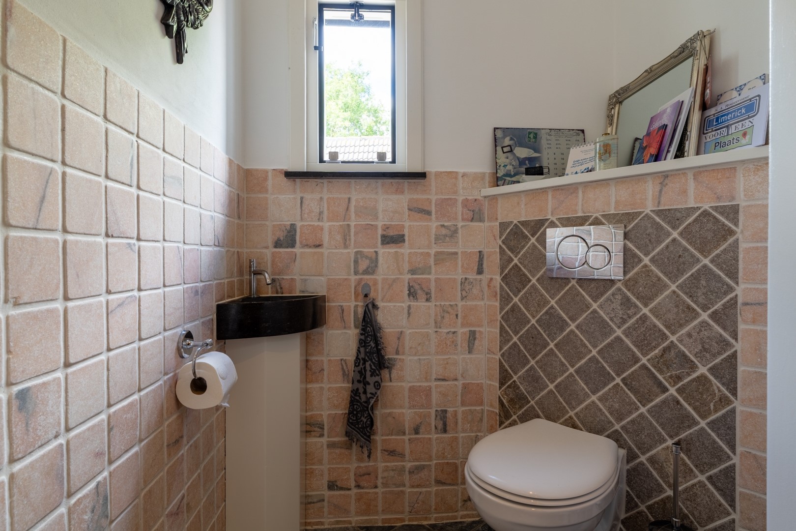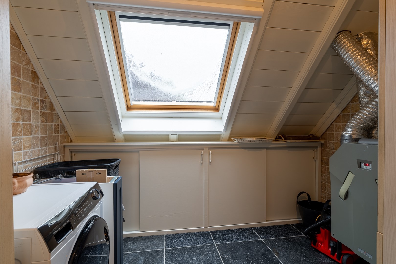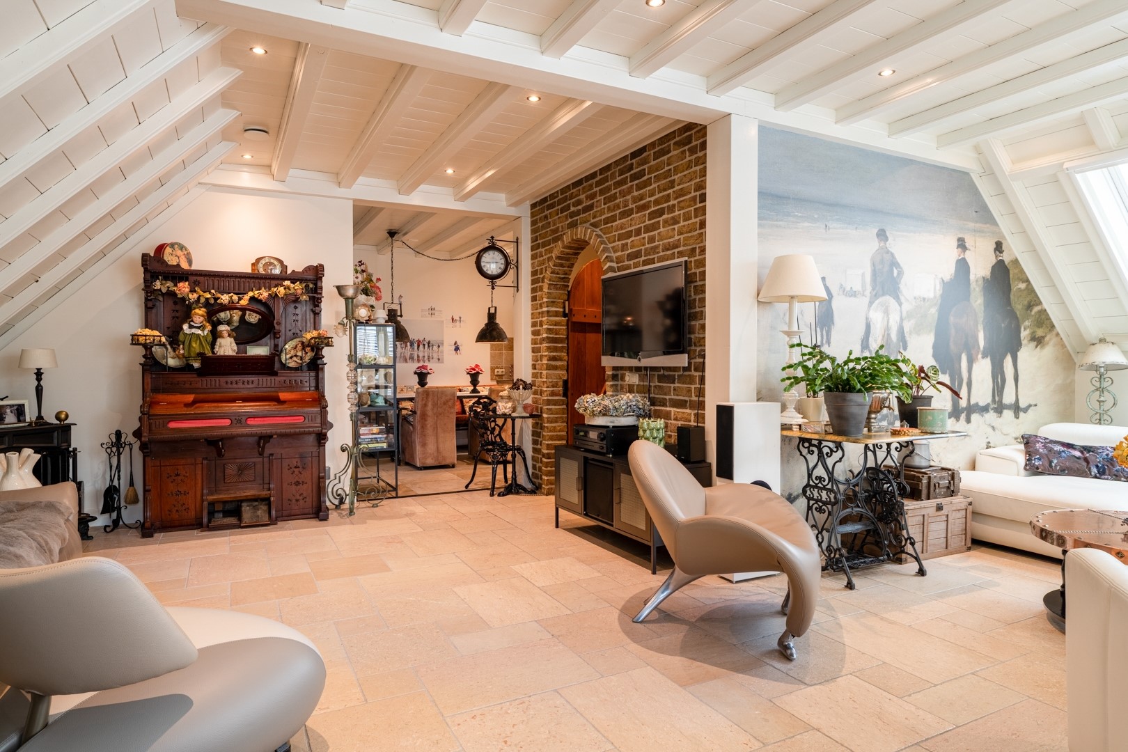 De woonkamer op dijkniveau is een lichte, royale leefruimte van circa 58 m². De vloer is voorzien van speksteentegels (ivoorkleurig), die samen met het travertin in de keuken en het souterrain de warmte uitstekend vasthouden – heerlijk comfortabel in zomer én winter. Dankzij de erker en grote raampartijen is er volop lichtinval en een prachtig uitzicht over de omgeving. De woonkeuken is praktisch ingedeeld met een nette hoekopstelling en voorzien van moderne inbouwapparatuur, zoals oven, inductie kookplaat uit 2022 met afzuiging en een vaatwasser. Naast de keuken ligt de bijkeuken: extra bergruimte, witgoedaansluitingen én de technische installaties (cv en WTW). Alles bij elkaar vormt dit een functioneel en comfortabel geheel, klaar om direct zorgeloos in te trekken.