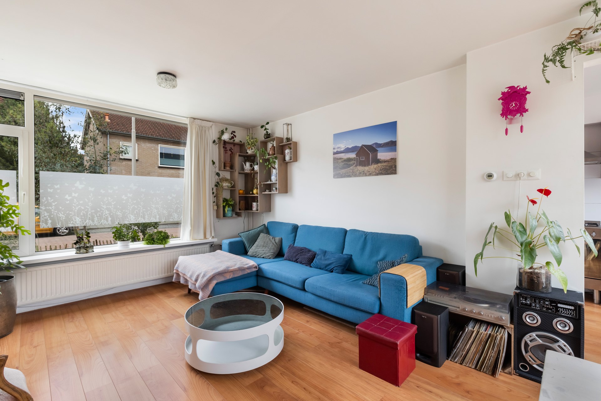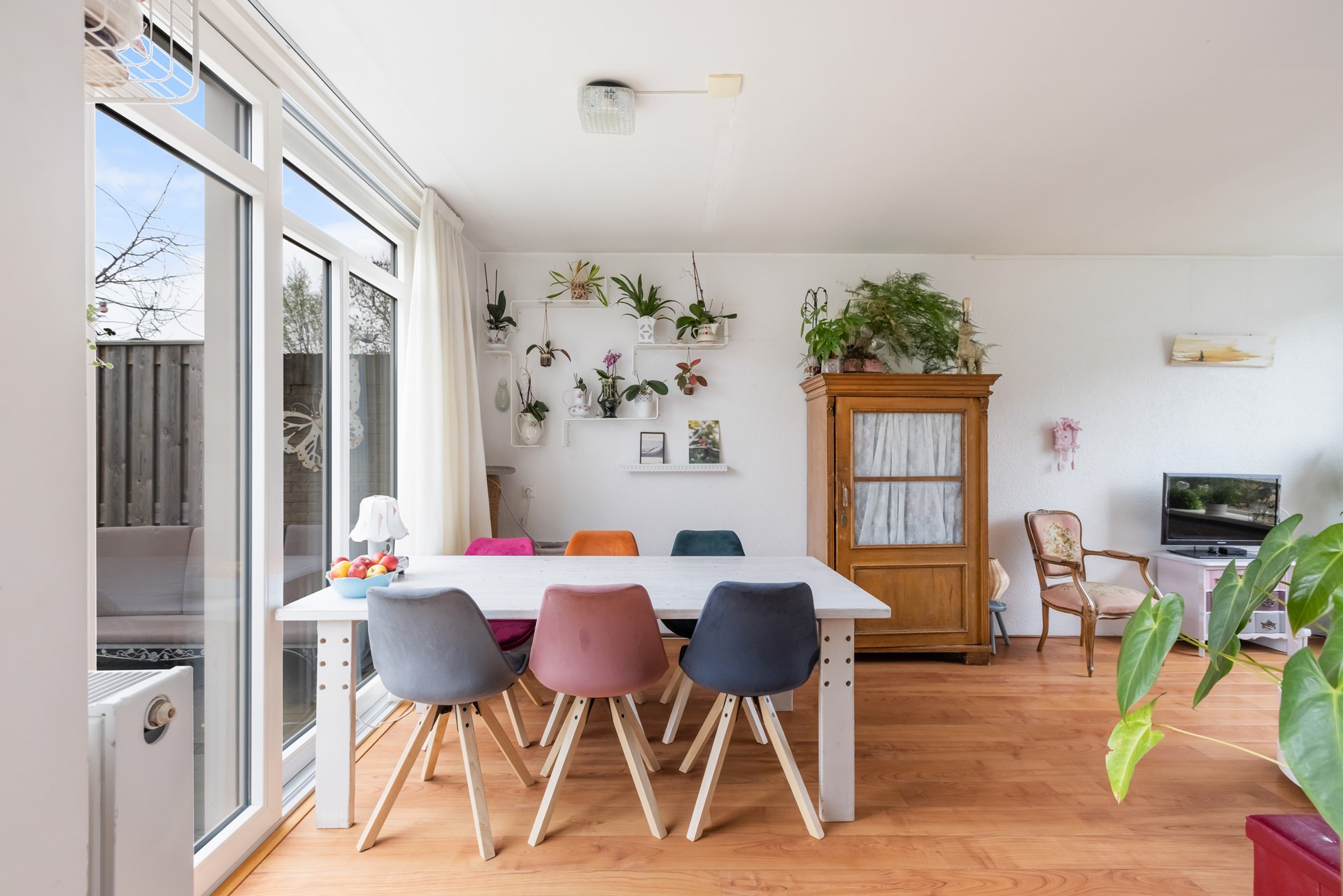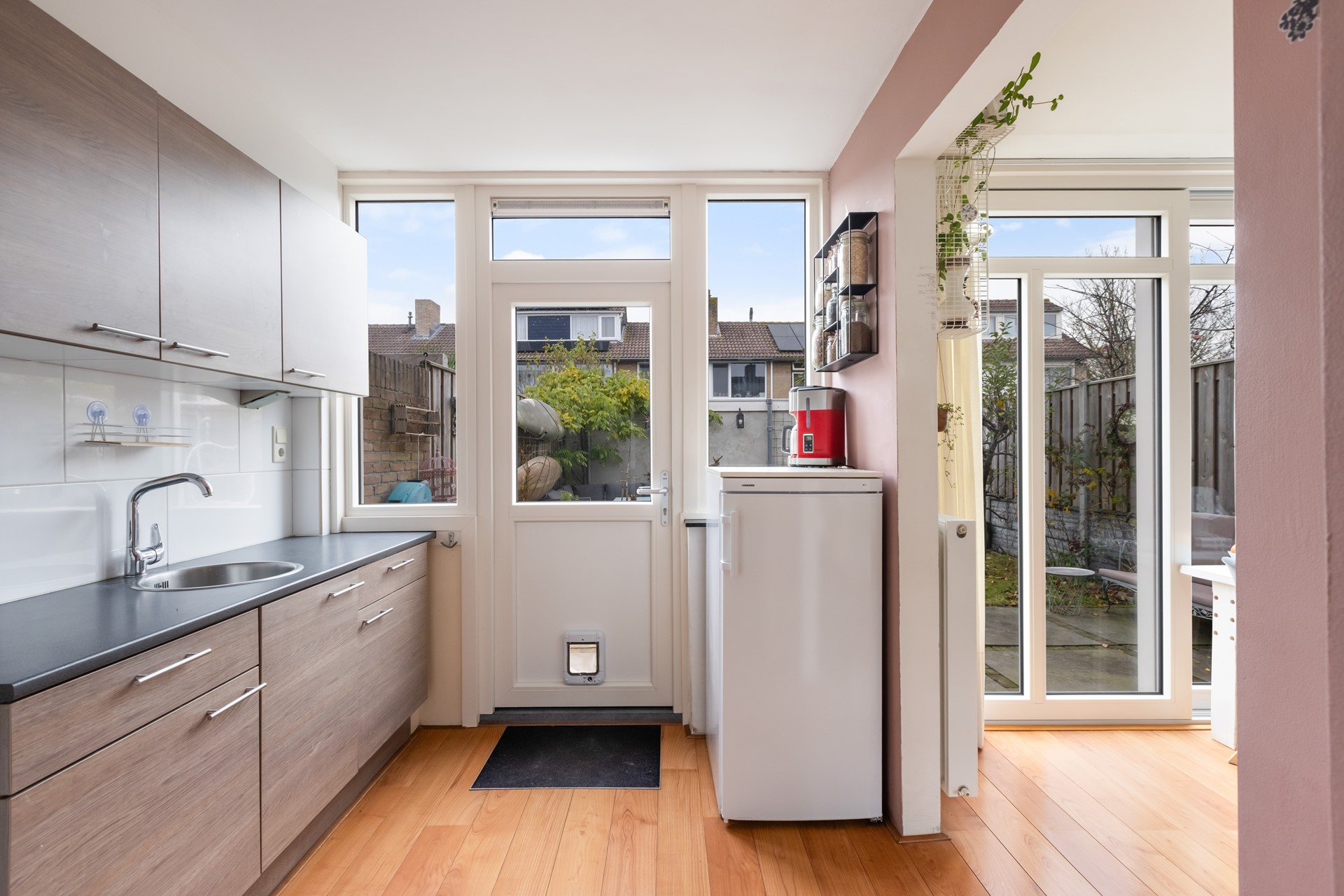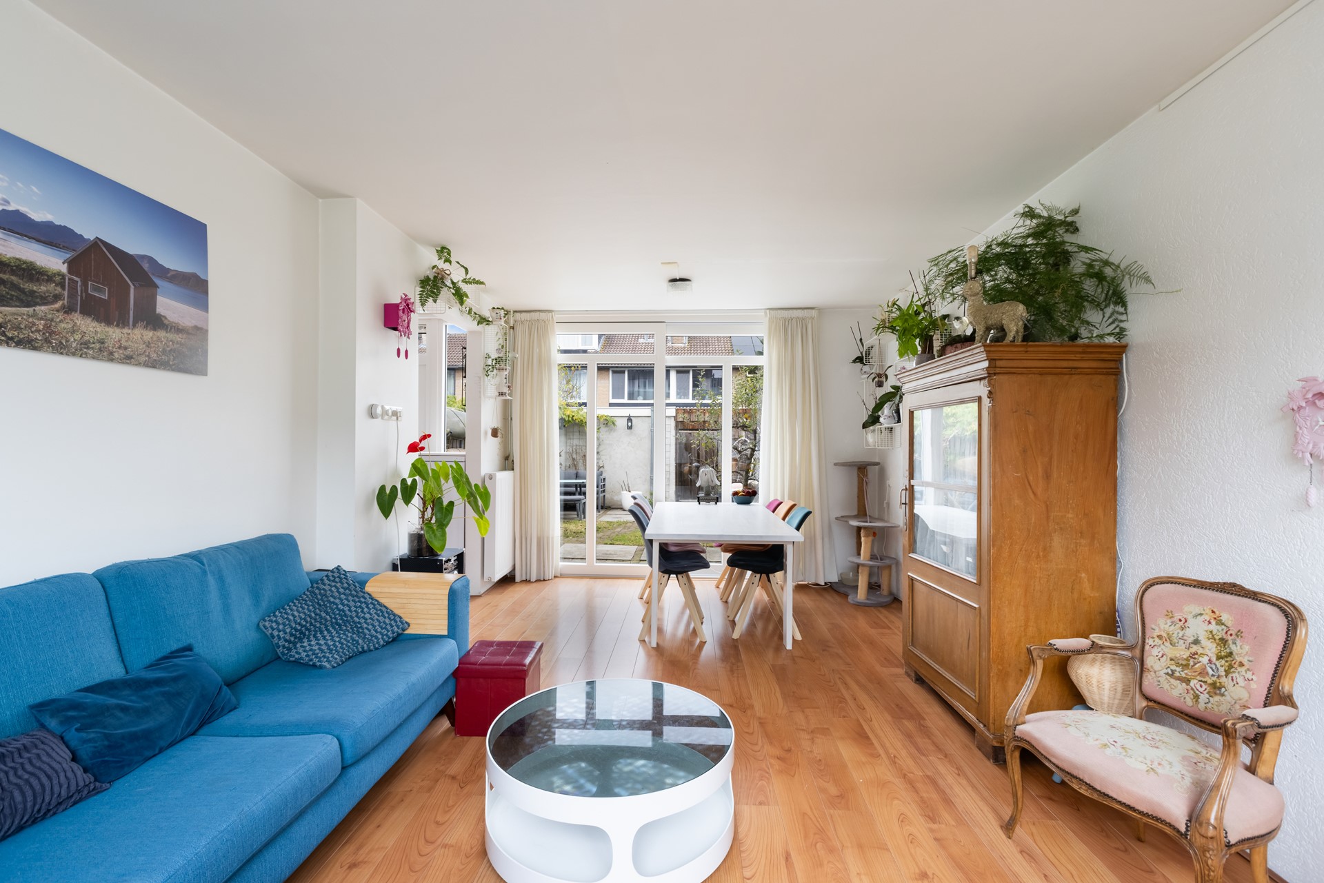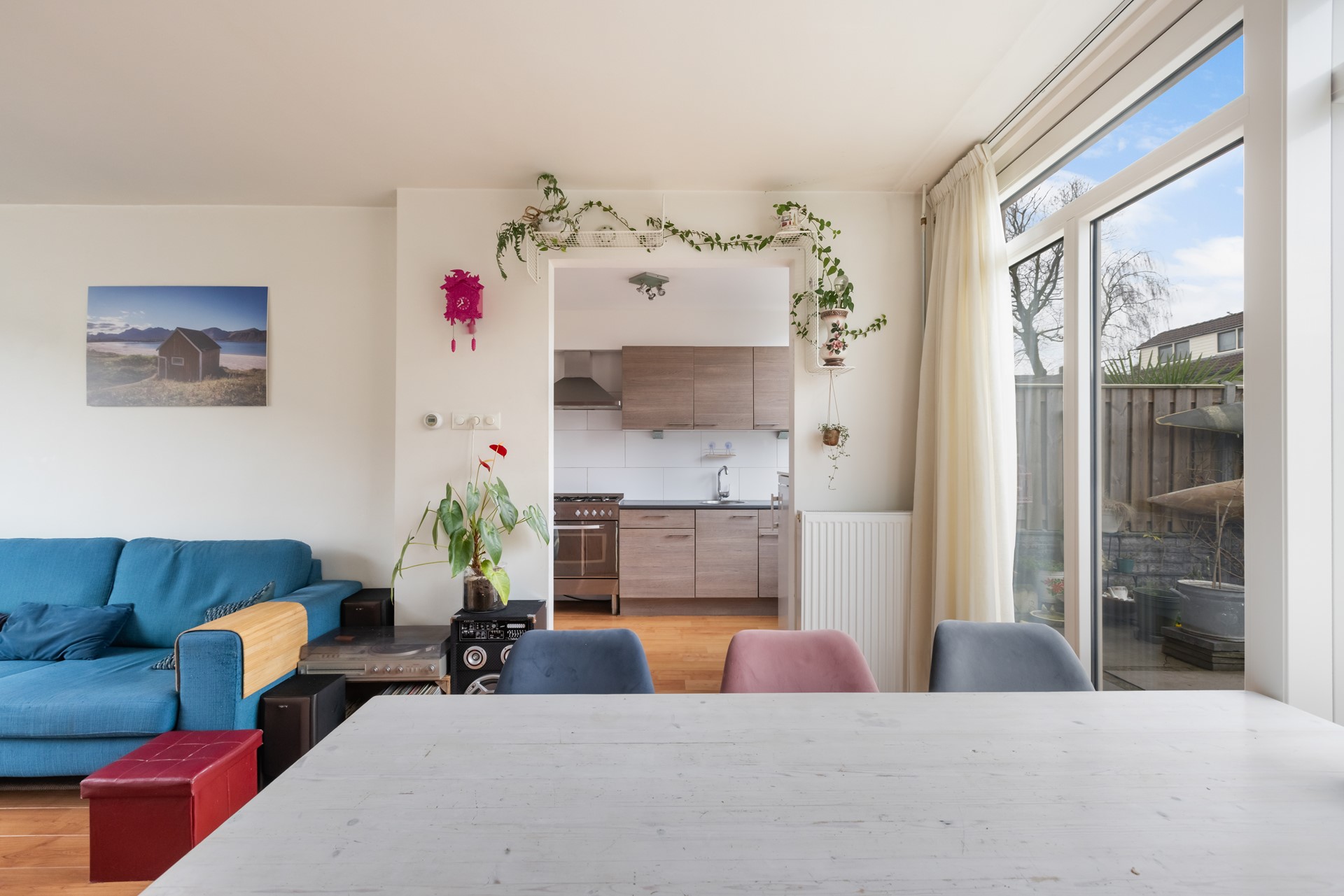 Via de hal/entree stap je de woning binnen. Hier vind je onder andere de vernieuwde meterkast, het toilet en de trap naar boven. De woonkamer is licht, ruim en voelt direct uitnodigend aan. Dankzij de grote schuifpui staat de ruimte in directe verbinding met de achtertuin – ideaal voor lange zomeravonden of gewoon een frisse ochtendkoffie.
