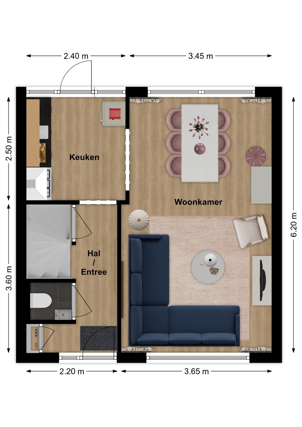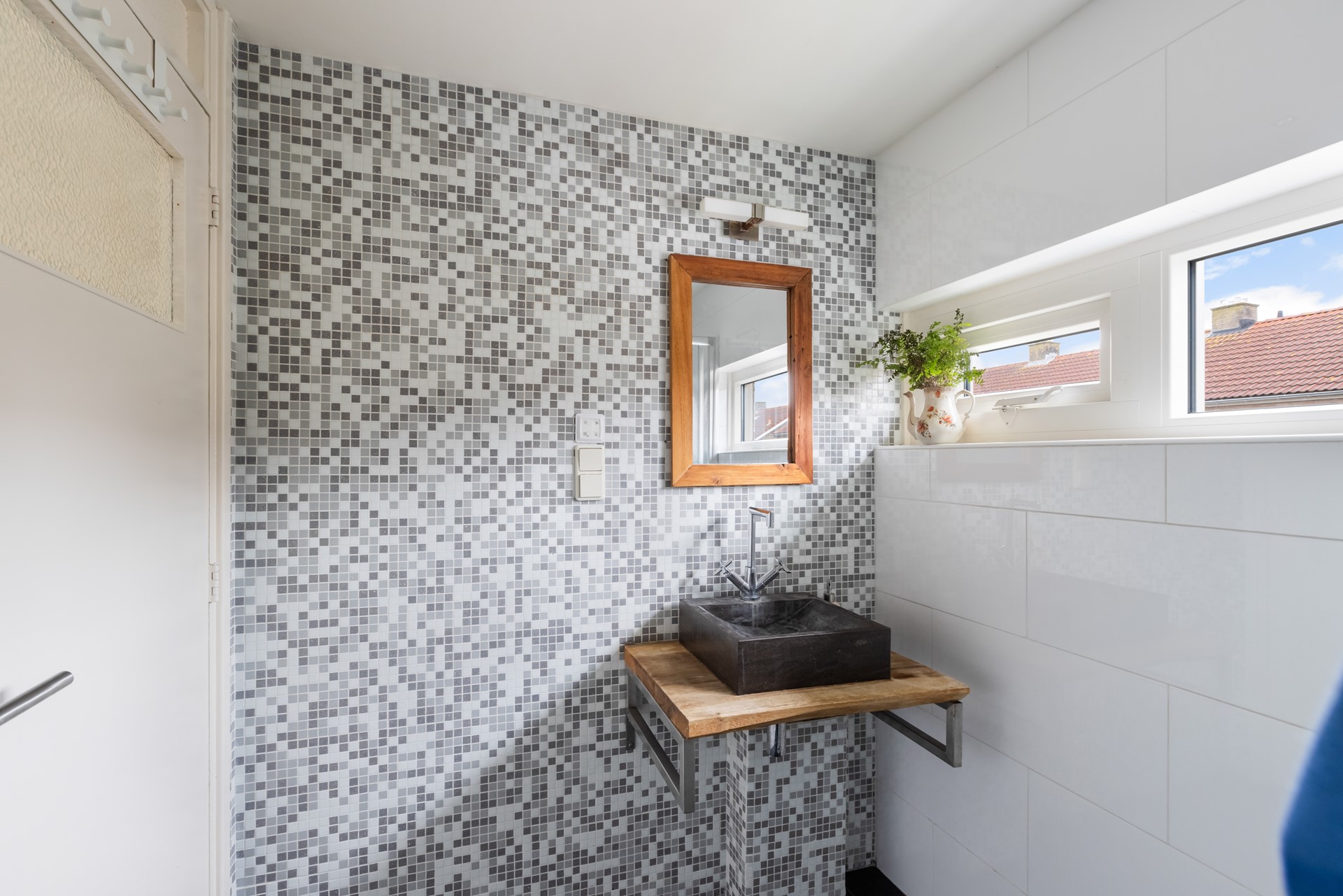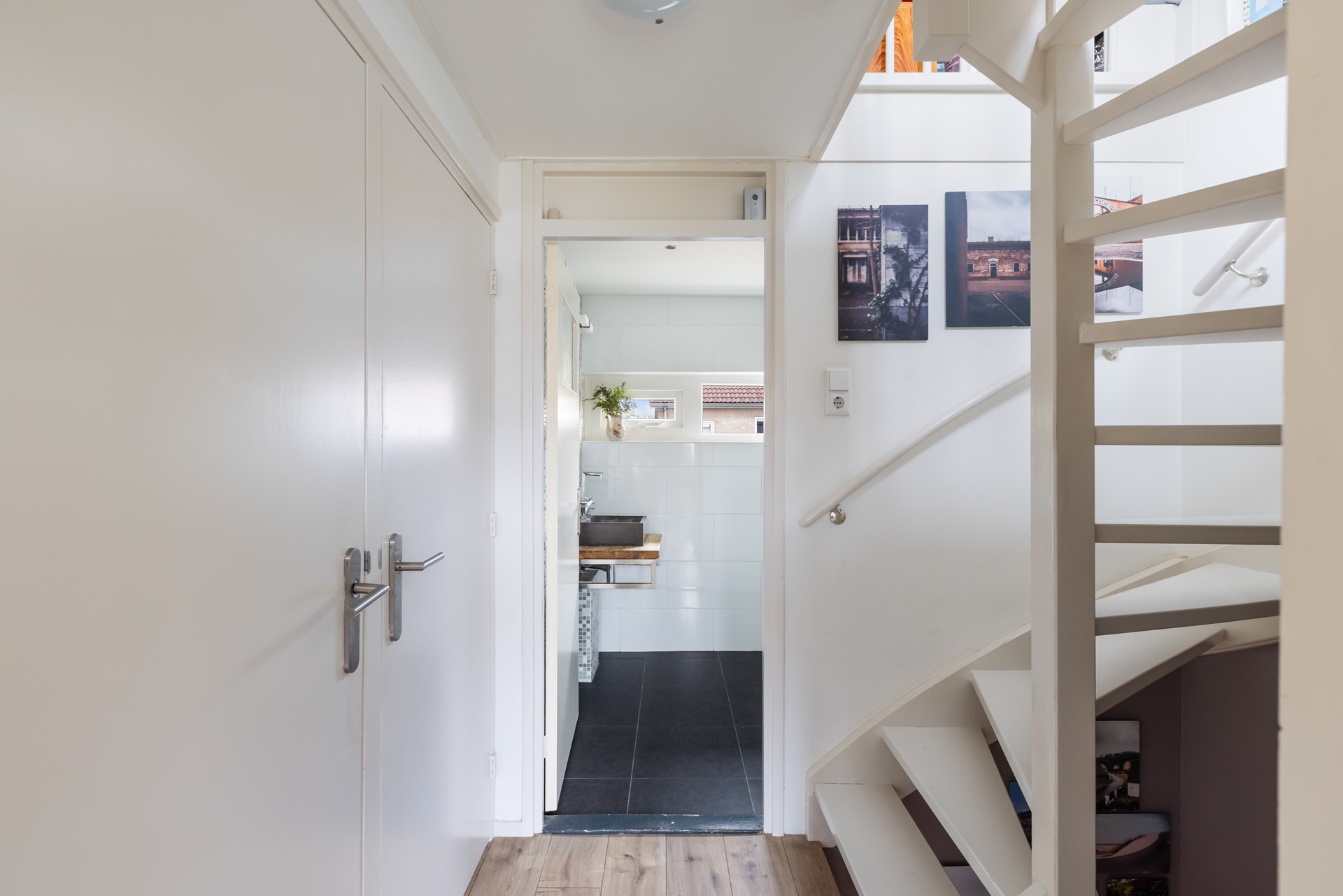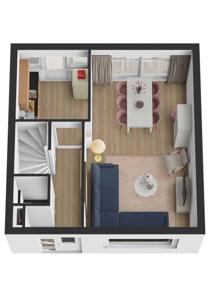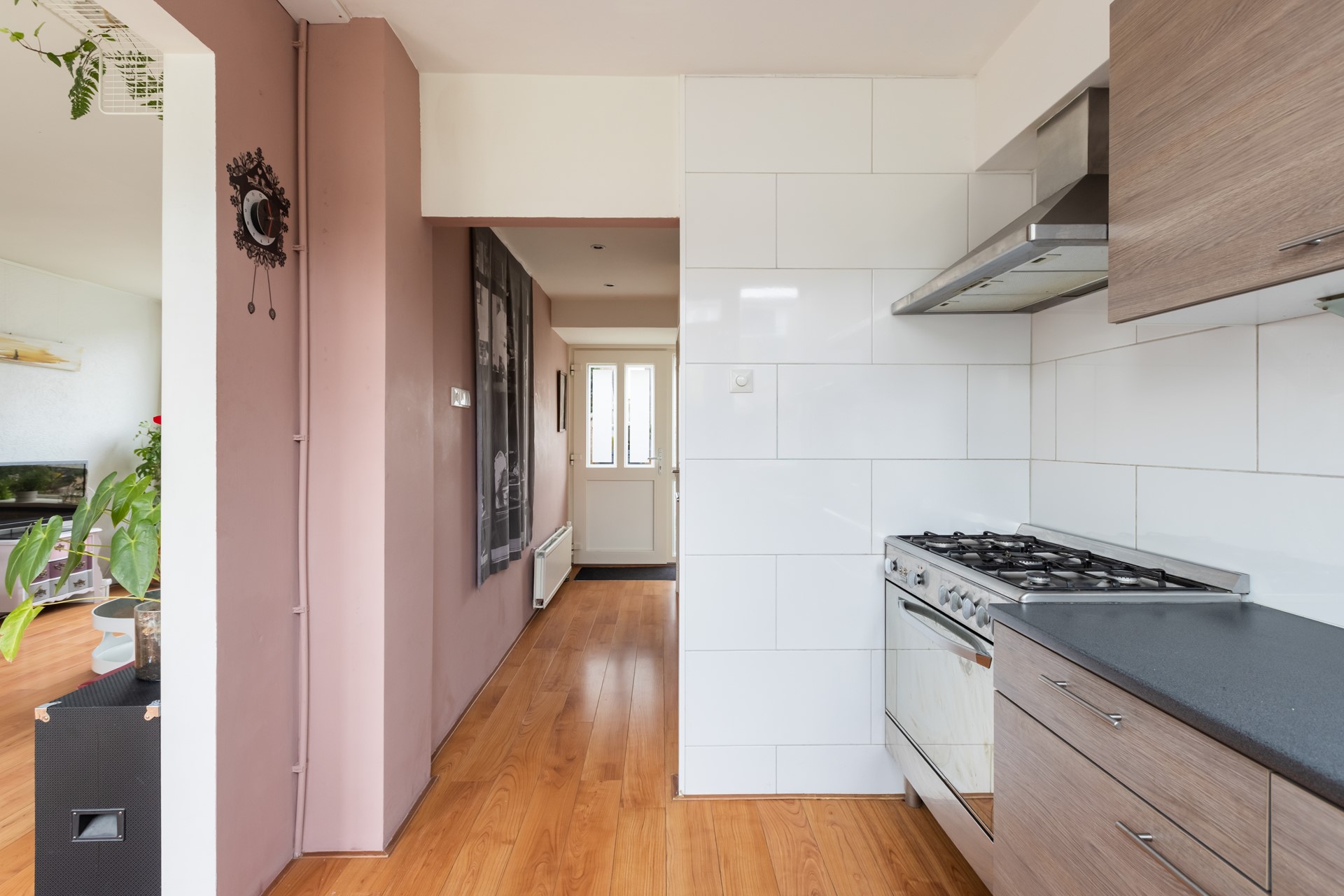 Via de hal/entree stap je de woning binnen. Hier vind je onder andere de vernieuwde meterkast, het toilet en de trap naar boven. De woonkamer is licht, ruim en voelt direct uitnodigend aan. Dankzij de grote schuifpui staat de ruimte in directe verbinding met de achtertuin – ideaal voor lange zomeravonden of gewoon een frisse ochtendkoffie.