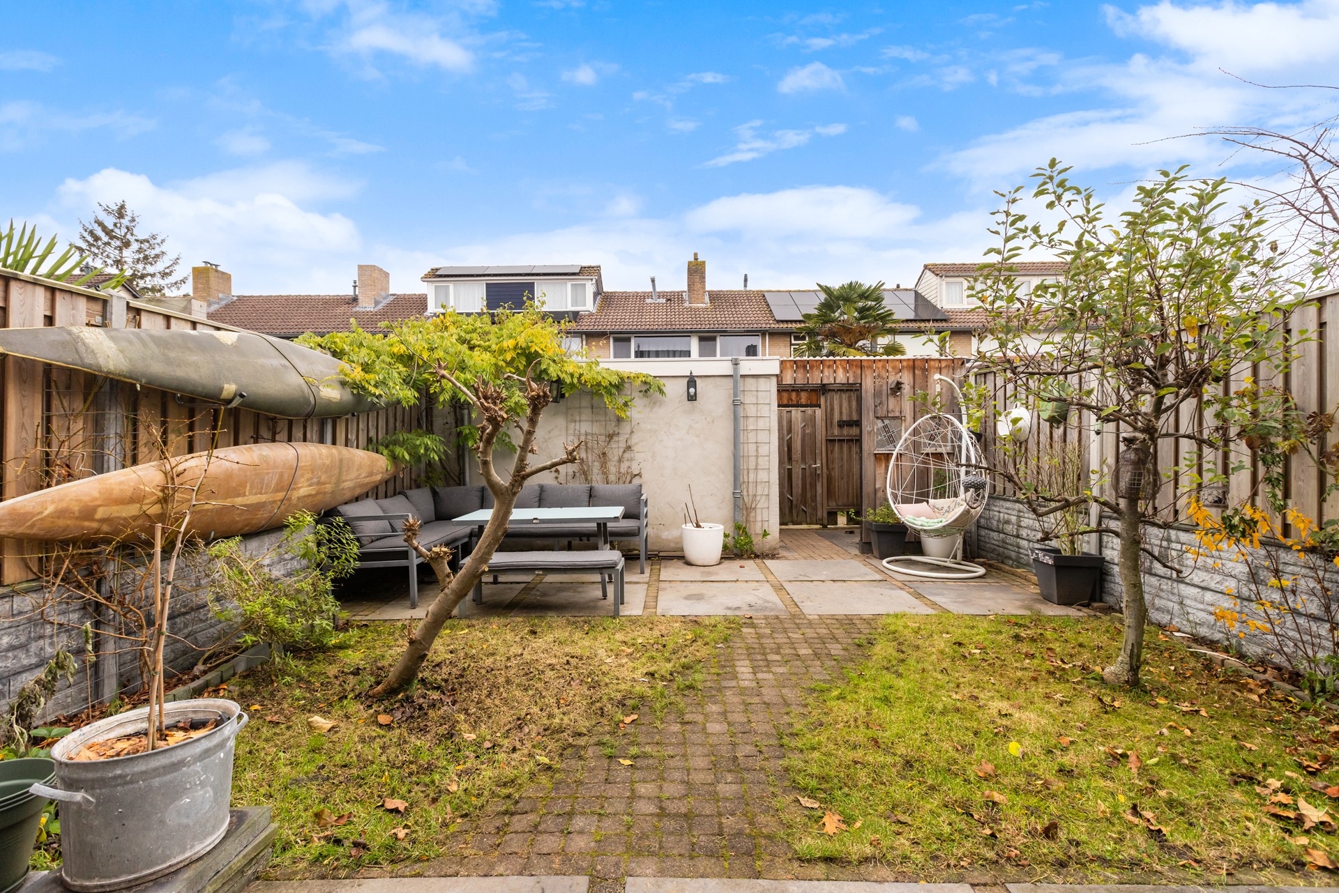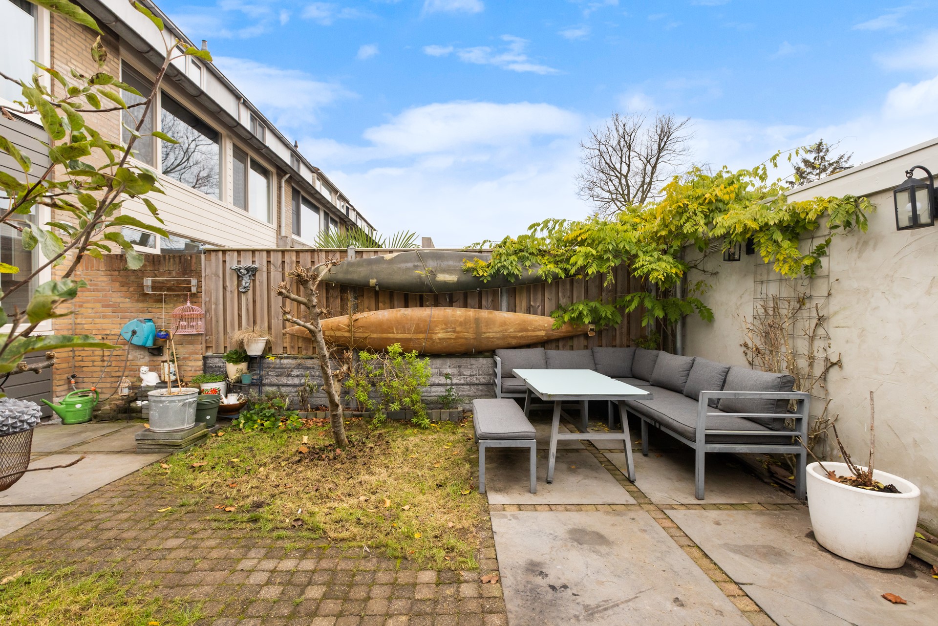 Het totale perceel omvat 136 m². De achtertuin is ruim bemeten en heeft een perfecte zonnige ligging: je vindt er altijd een plekje in de zon én in de schaduw — al moet de zon natuurlijk wél schijnen. Achter op het perceel staat een praktische berging, ideaal voor fietsen, tuingereedschap of andere spullen. Al met al is het een verzorgde tuin waar je het hele jaar door prettig kunt vertoeven