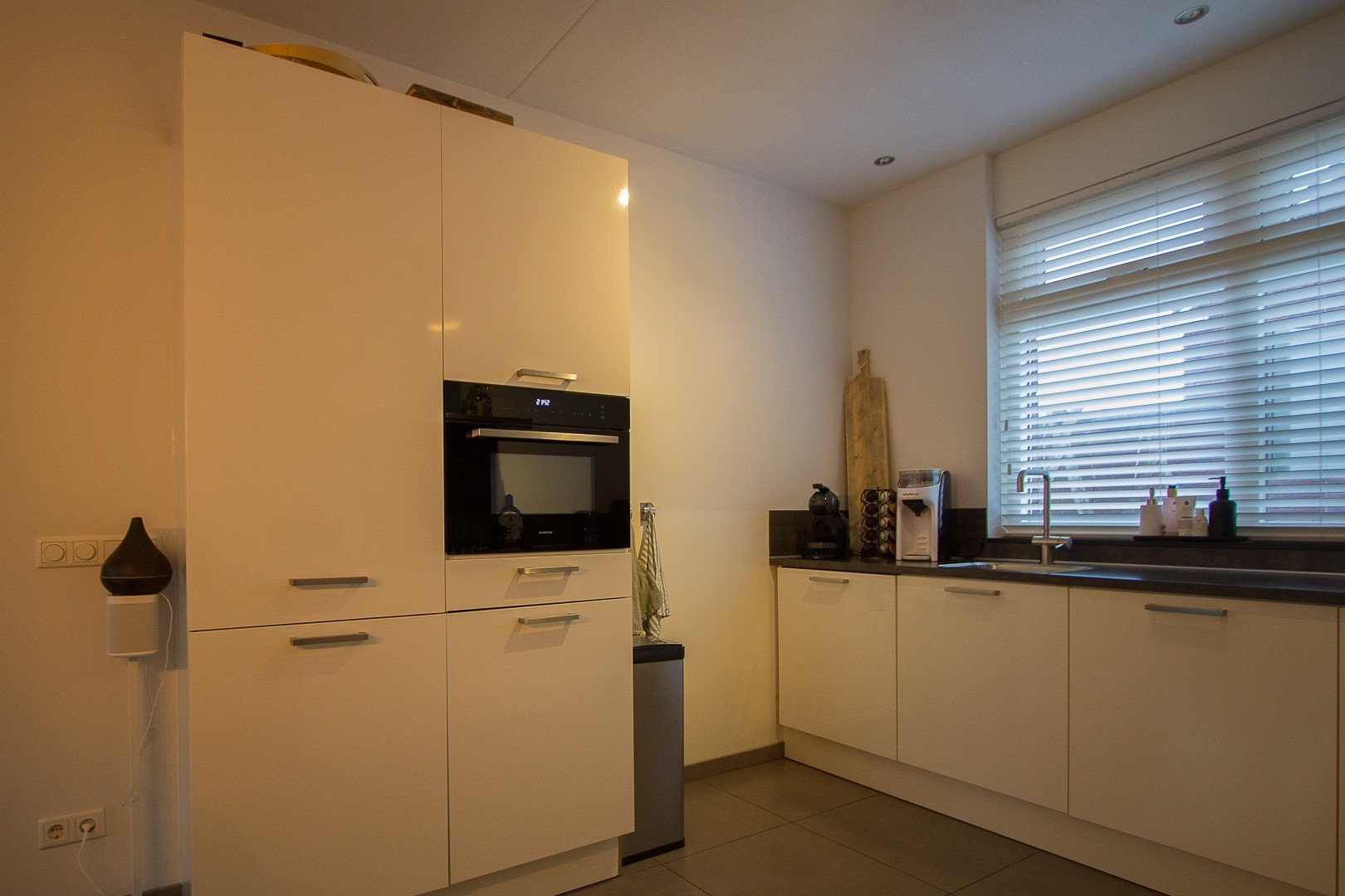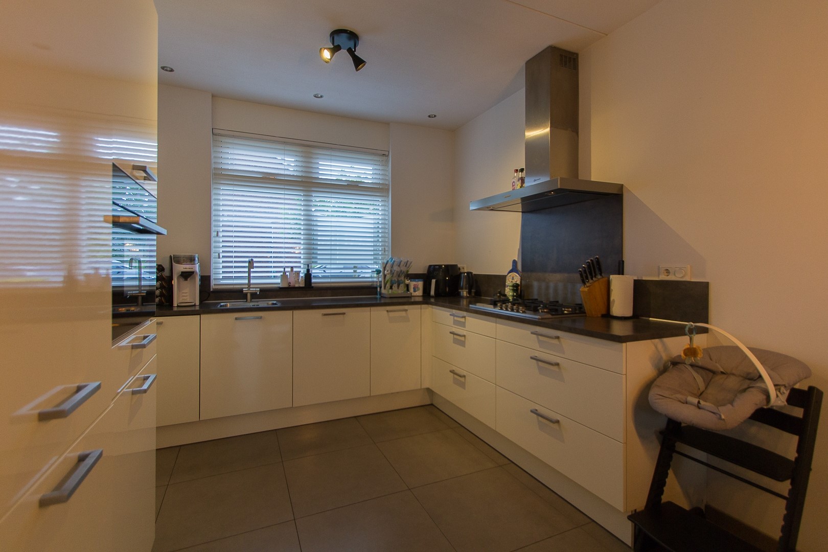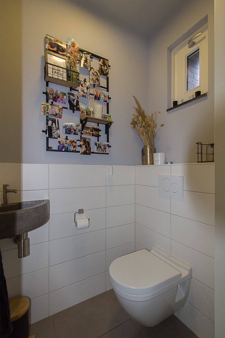 Praktische hal met meterkast en trapopgang naar de verdieping, toilet met fontein, open keuken met een dubbele opstelling welke voorzien is van inbouwapparatuur, woonkamer met openslaande tuindeuren, extra loopdeur en provisiekast.