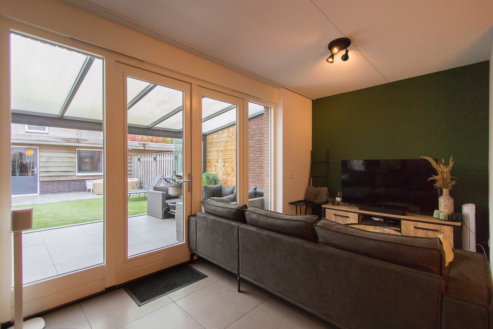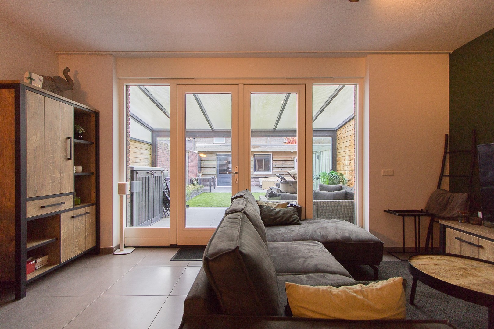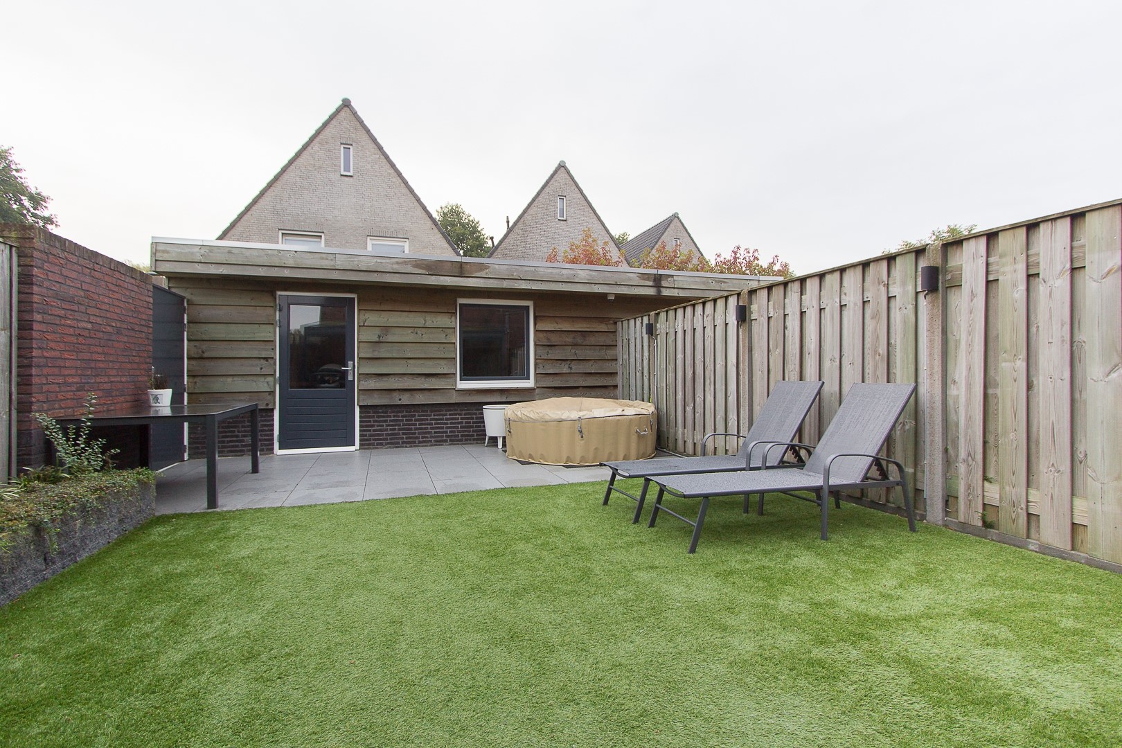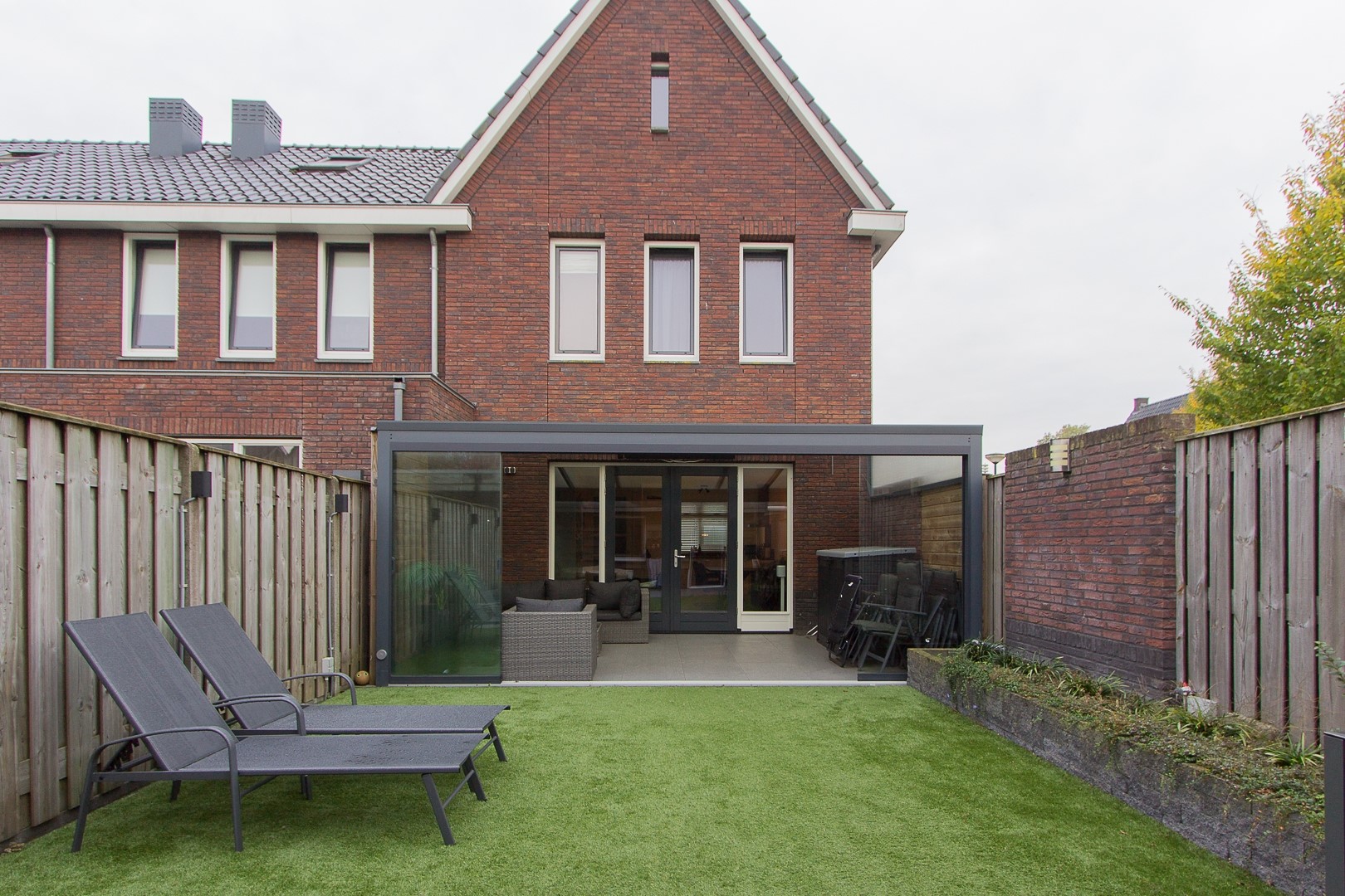 De omsloten achtertuin biedt voldoende privacy en is ingedeeld met sierbestrating, gazon, en fijne overkapping met berging. Middels eigen achterom is er toegang naar de openbare weg met direct parkeergelegenheid bij de poort. De tuin is gelegen op het noorden.