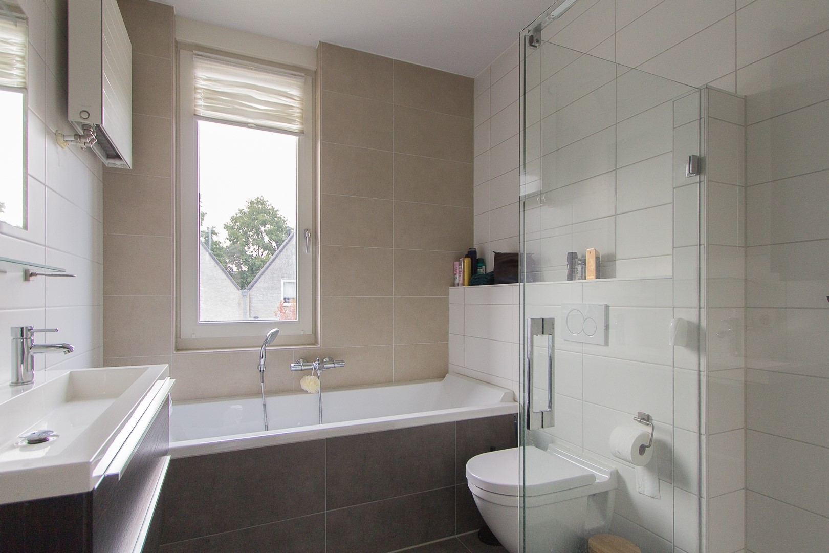 Overloop, 3 slaapkamers, badkamer ingedeeld met een inloopdouche, ligbad, toilet, wastafel en radiator. De badkamer wordt op mechanische en natuurlijke wijze geventileerd.