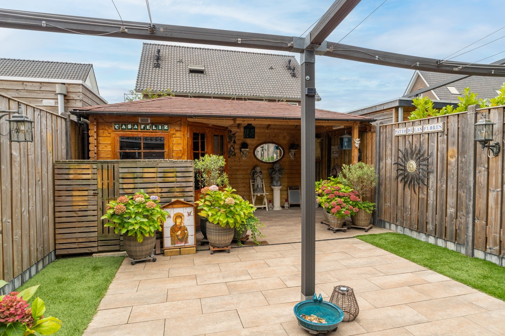 Onderhoudsvriendelijke achtertuin met vaste beplanting, houten berging en achterom. Voorzien van buitenkraan en zonnescherm.