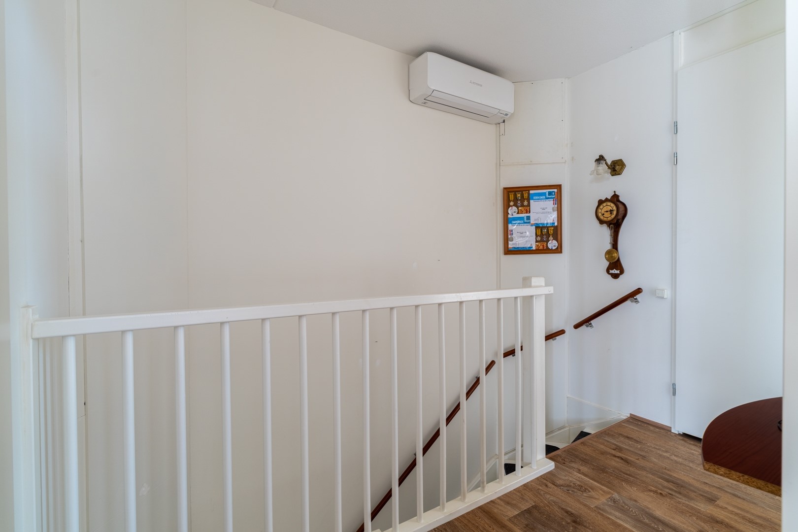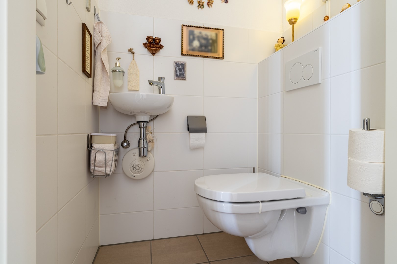Hal met meterkast, toilet met wandcloset en fontein, vaste trap naar de eerste verdieping en toegang tot de technische ruimte met warmtepomp.