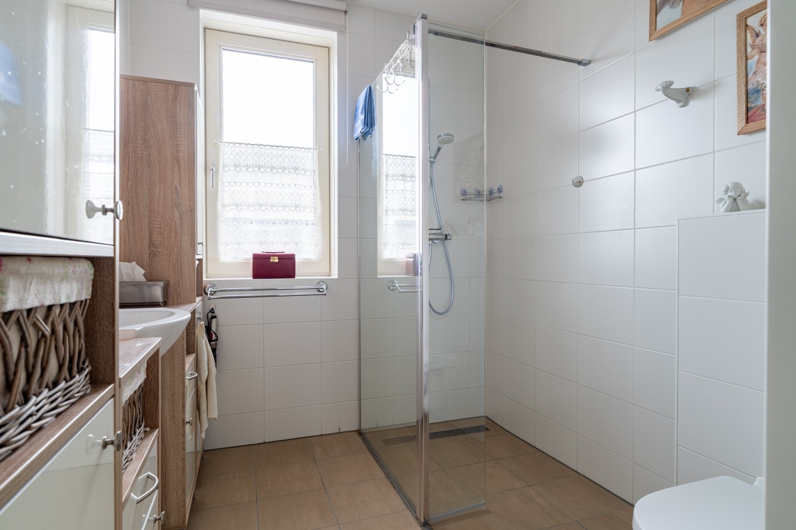 De badkamer is voorzien van een douche, wastafel en tweede toilet (wandcloset).
