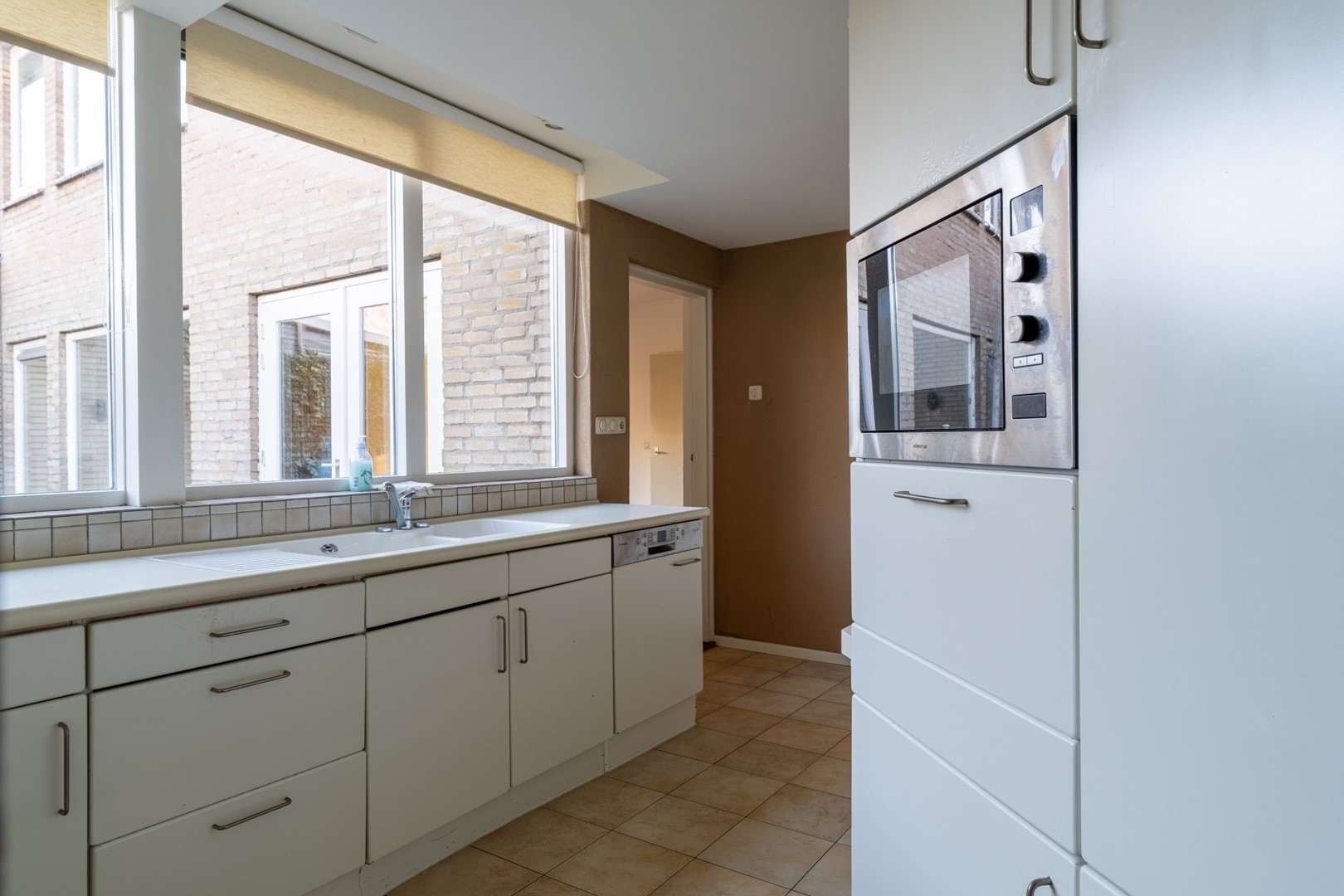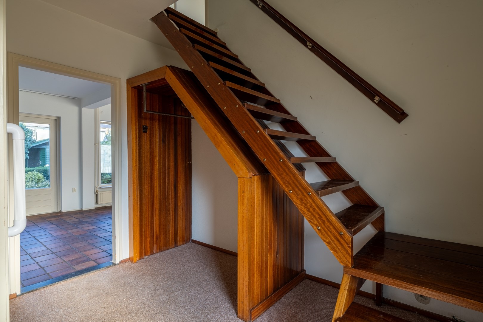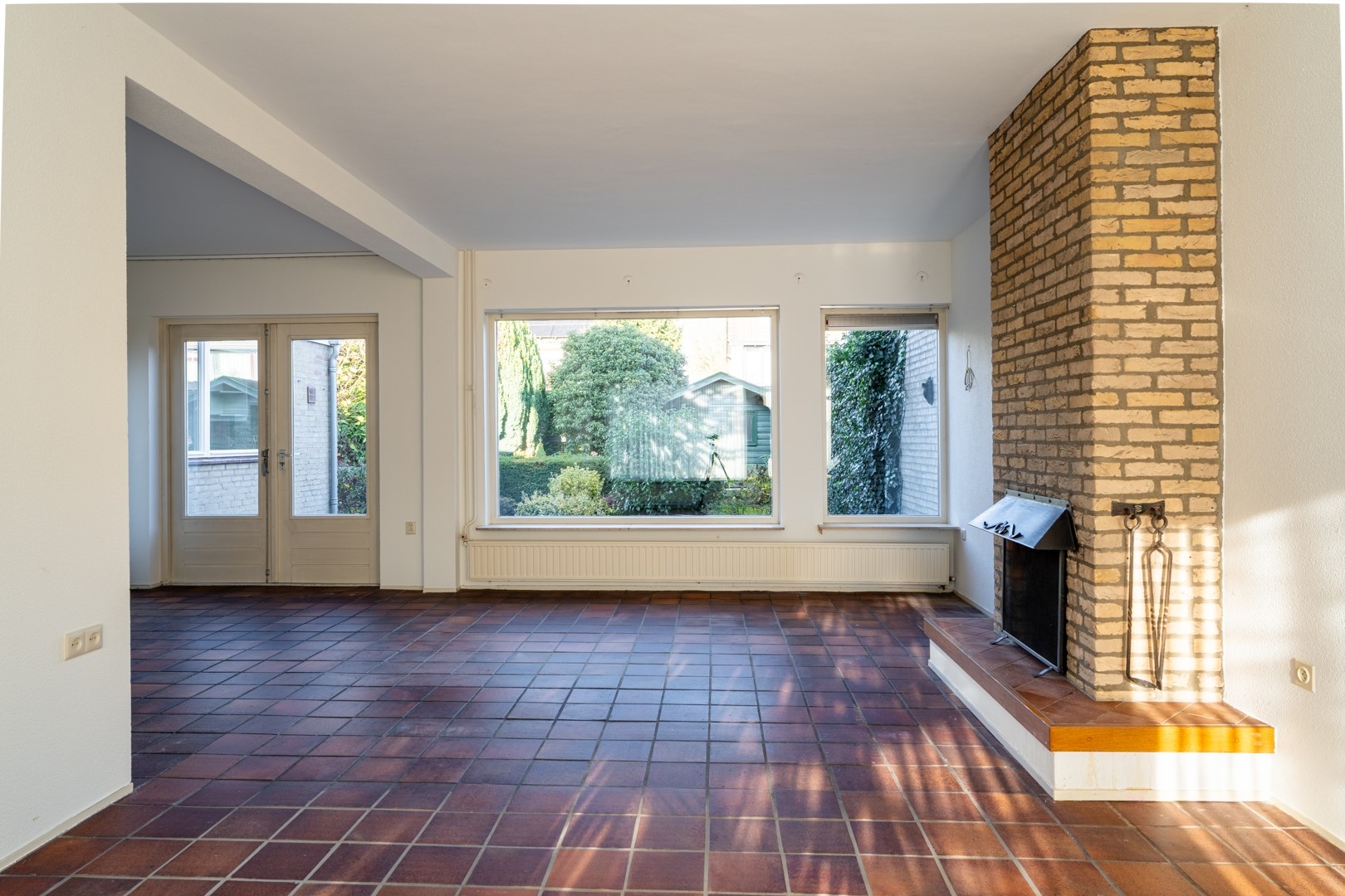 Ontvangsthal met bordestrap, meterkast en toilet met fontein, lichte en ruime L-vormige woonkamer met sfeervolle houthaard en tuindeuren naar het terras en achtertuin, gezellige woonkeuken met gedateerde hoekopstelling en v.v. de volgende inbouwapparatuur: keramische kookplaat, afzuigkap, magnetron, vaatwasser, koelkast en vriezer, vanuit de keuken toegang tot achtergelegen portaal met loopdeur naar de achtertuin en aan de voorzijde toegang tot de inpandige garage met openslaande deuren naar de oprit.