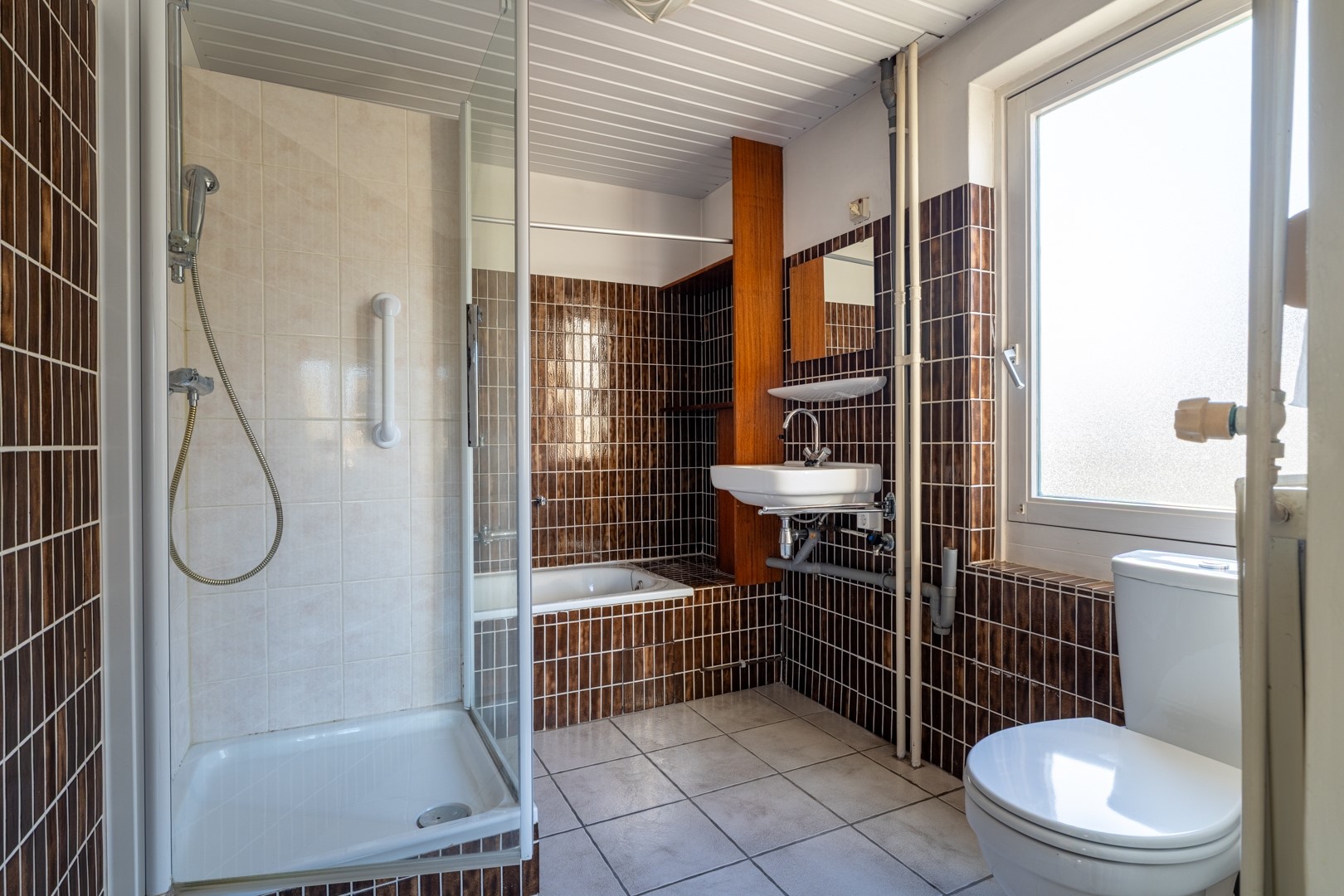 Overloop met trapopgang naar de zolderetage, 3 slaapkamers en nette gedateerde badkamer ingedeeld met ligbad, douche, wastafel en 2e toilet.