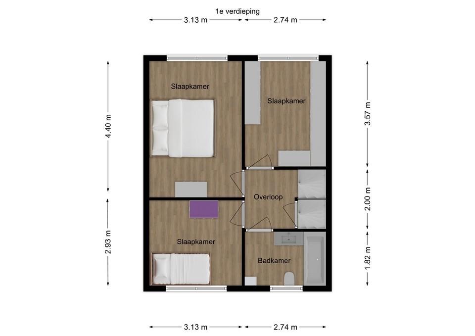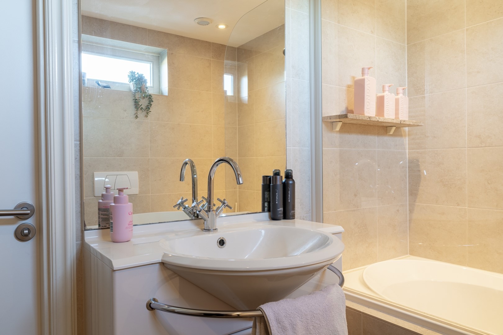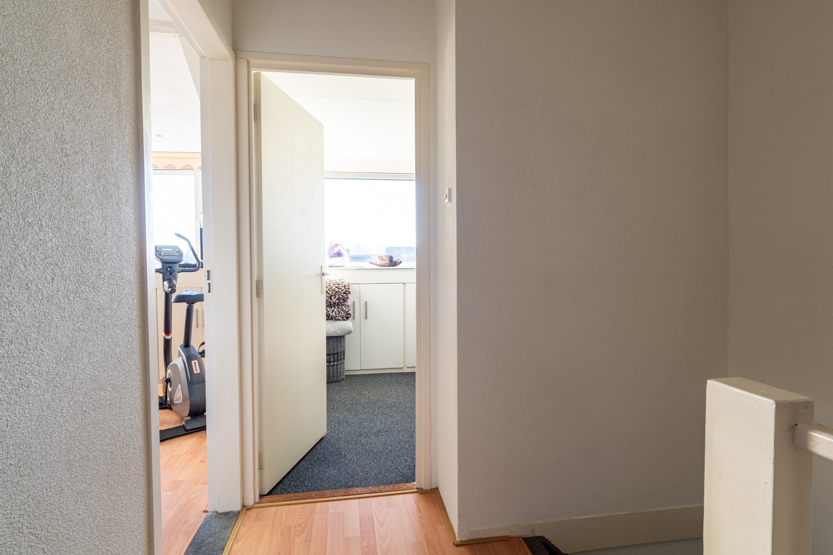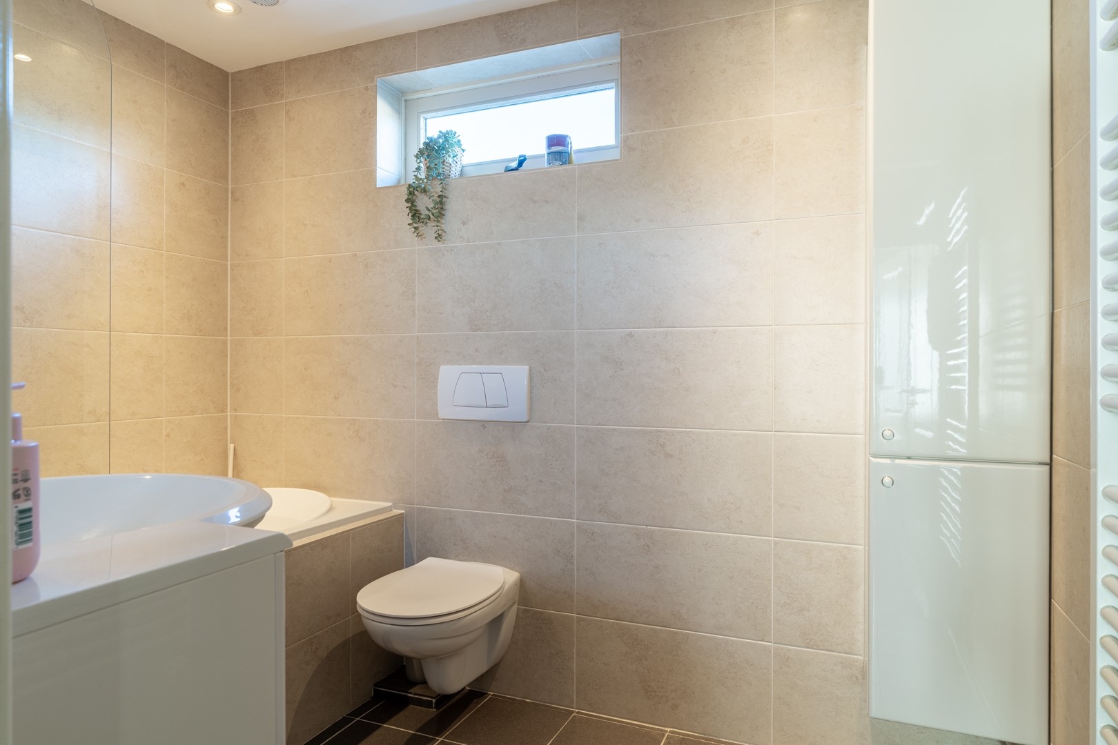 Vanaf de overloop toegang tot 3 slaapkamers en de moderne badkamer met whirlpool (bad/douchecombinatie), 2e toilet, wastafelmeubel en designradiator.
