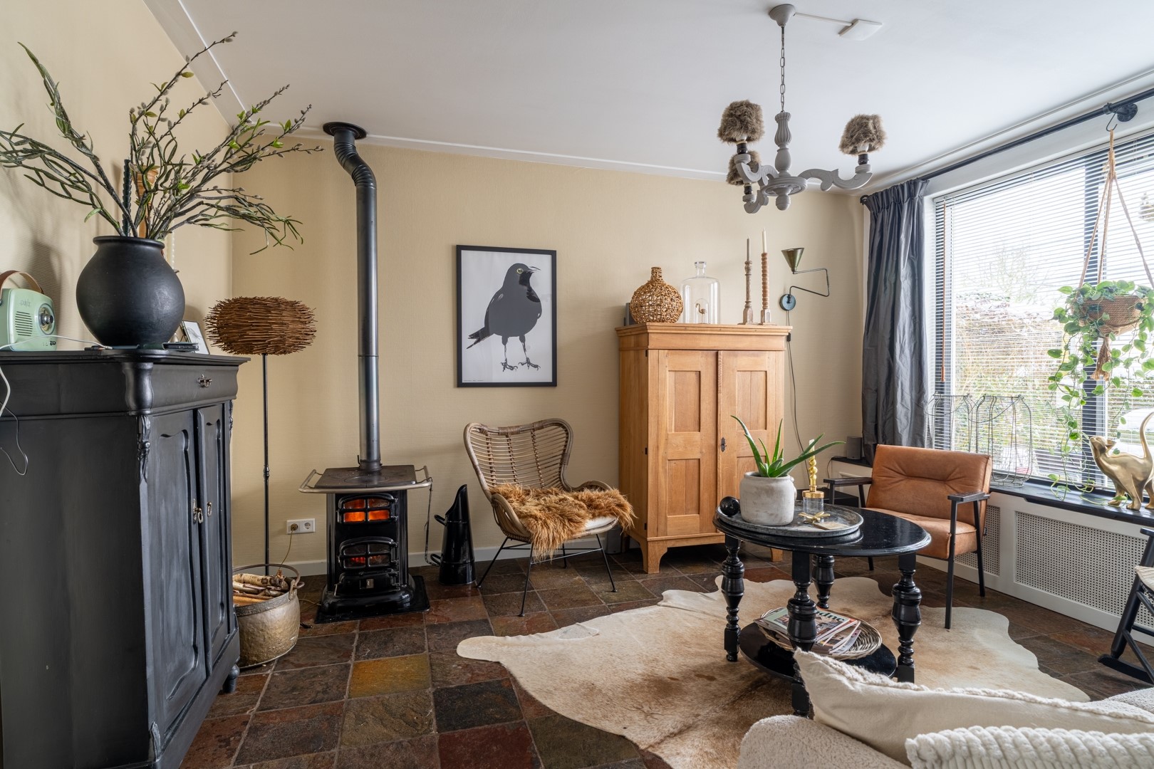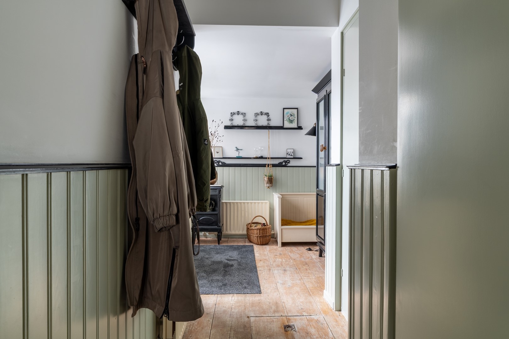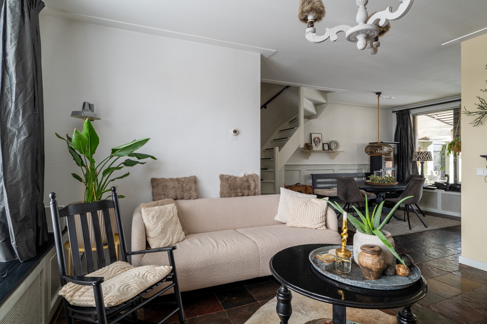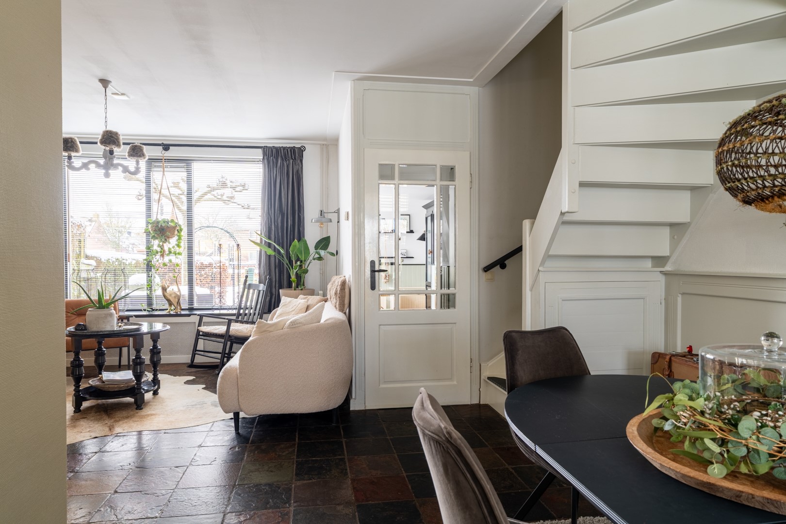 Je komt binnen via de ruime ontvangsthal aan de voorzijde van de woning. Hier bevinden zich de meterkast en het toilet, dat is uitgevoerd met een zwevend closet en een fontein. De L-vormige woonkamer is voorzien van een plavuizenvloer, een gezellige houtkachel en de trapopgang naar de eerste verdieping.