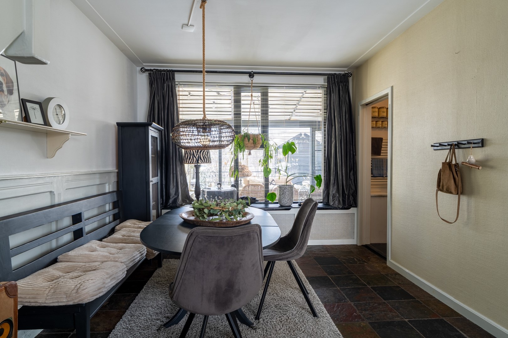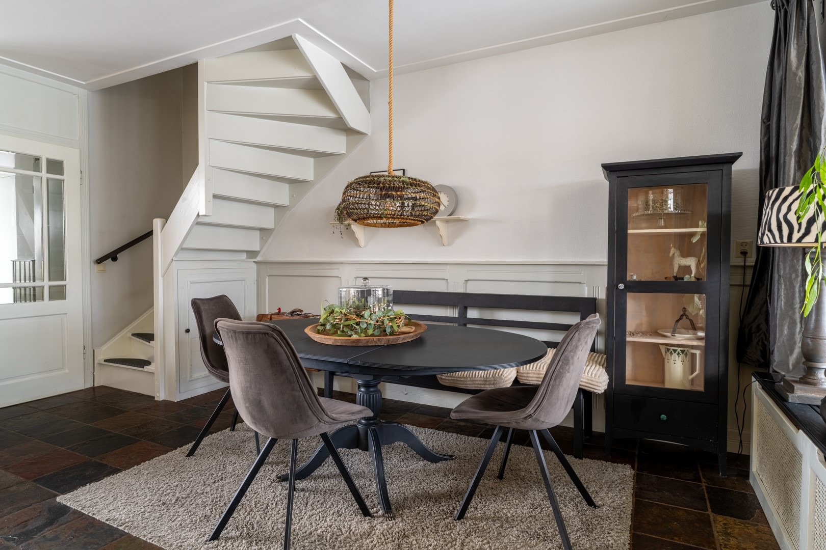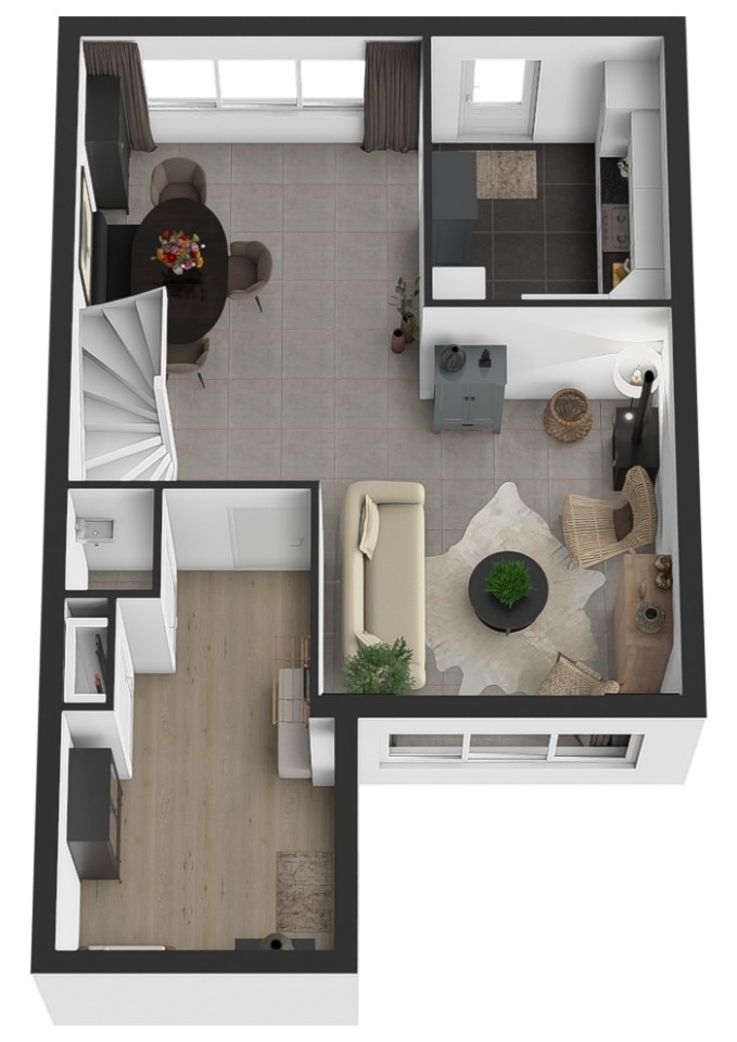 Je komt binnen via de ruime ontvangsthal aan de voorzijde van de woning. Hier bevinden zich de meterkast en het toilet, dat is uitgevoerd met een zwevend closet en een fontein. De L-vormige woonkamer is voorzien van een plavuizenvloer, een gezellige houtkachel en de trapopgang naar de eerste verdieping.