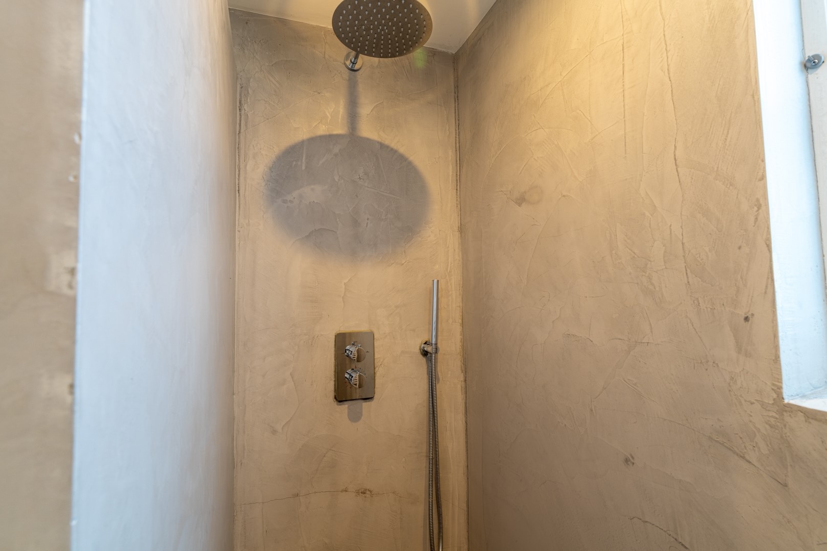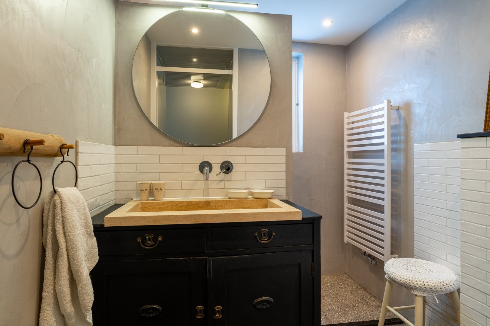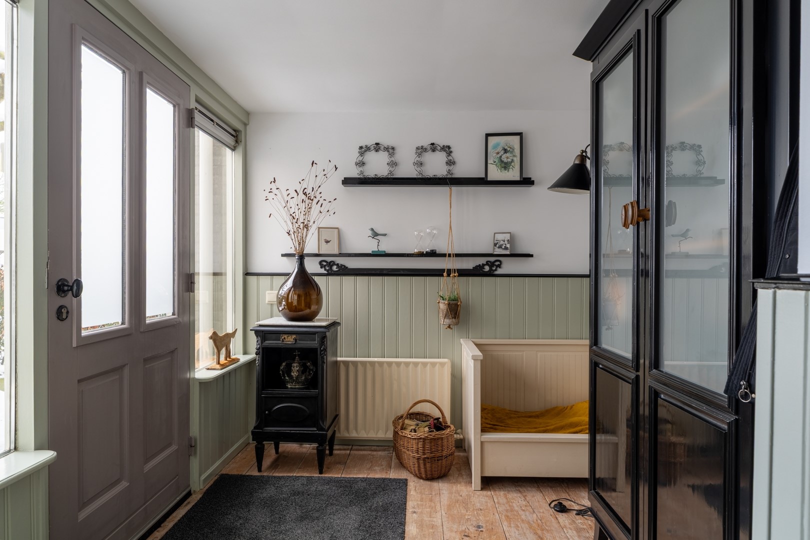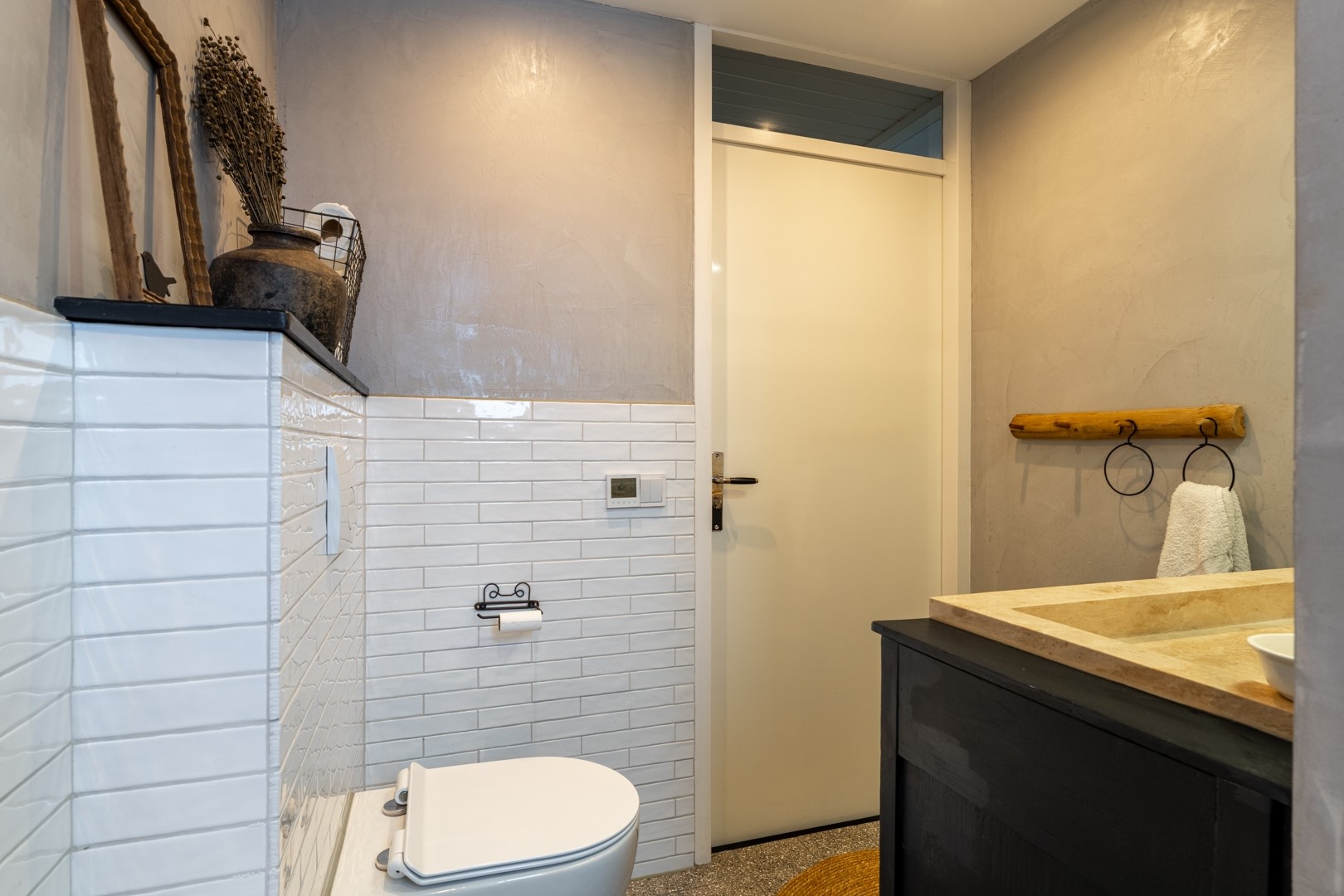 Je komt binnen via de ruime ontvangsthal aan de voorzijde van de woning. Hier bevinden zich de meterkast en het toilet, dat is uitgevoerd met een zwevend closet en een fontein. De L-vormige woonkamer is voorzien van een plavuizenvloer, een gezellige houtkachel en de trapopgang naar de eerste verdieping.