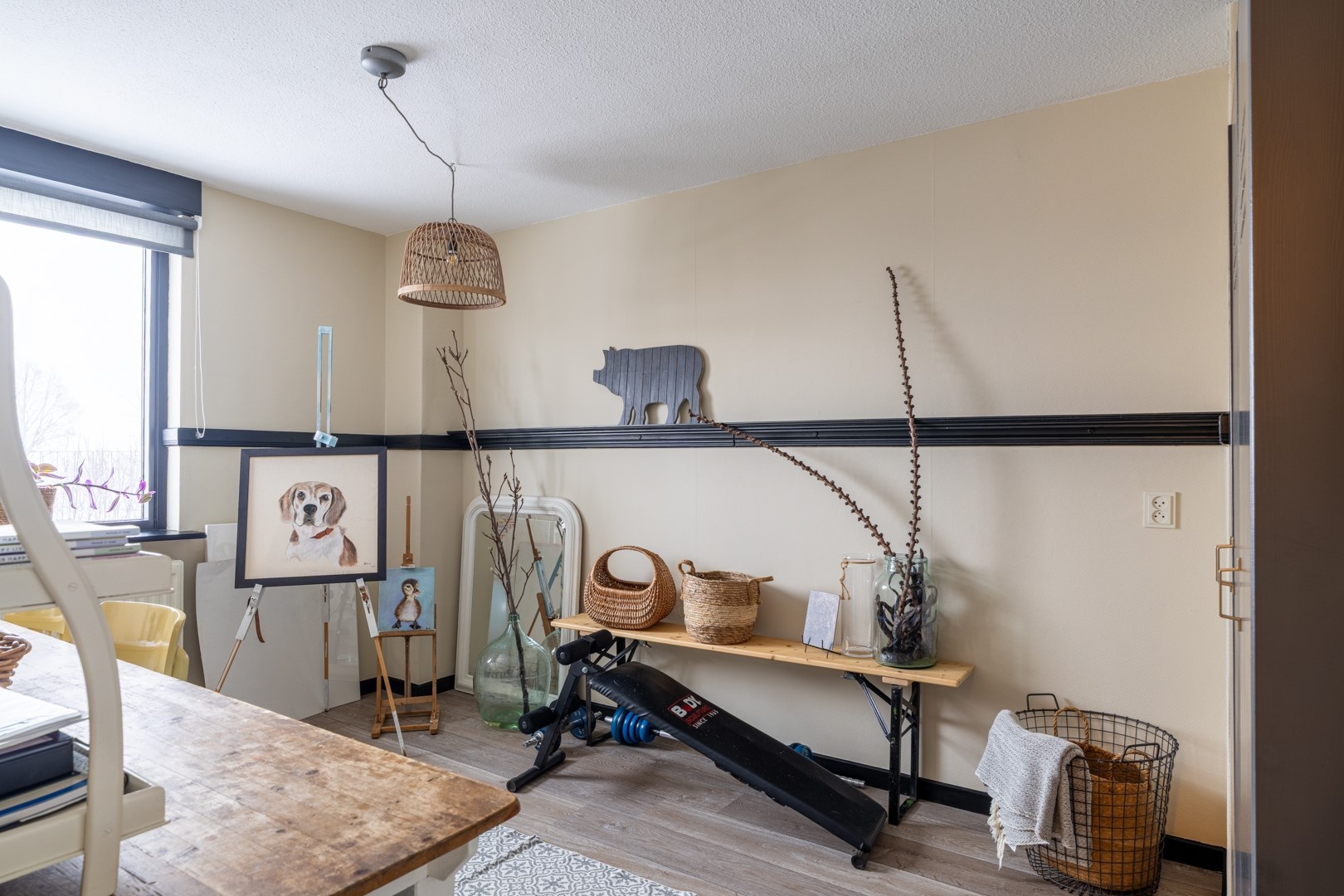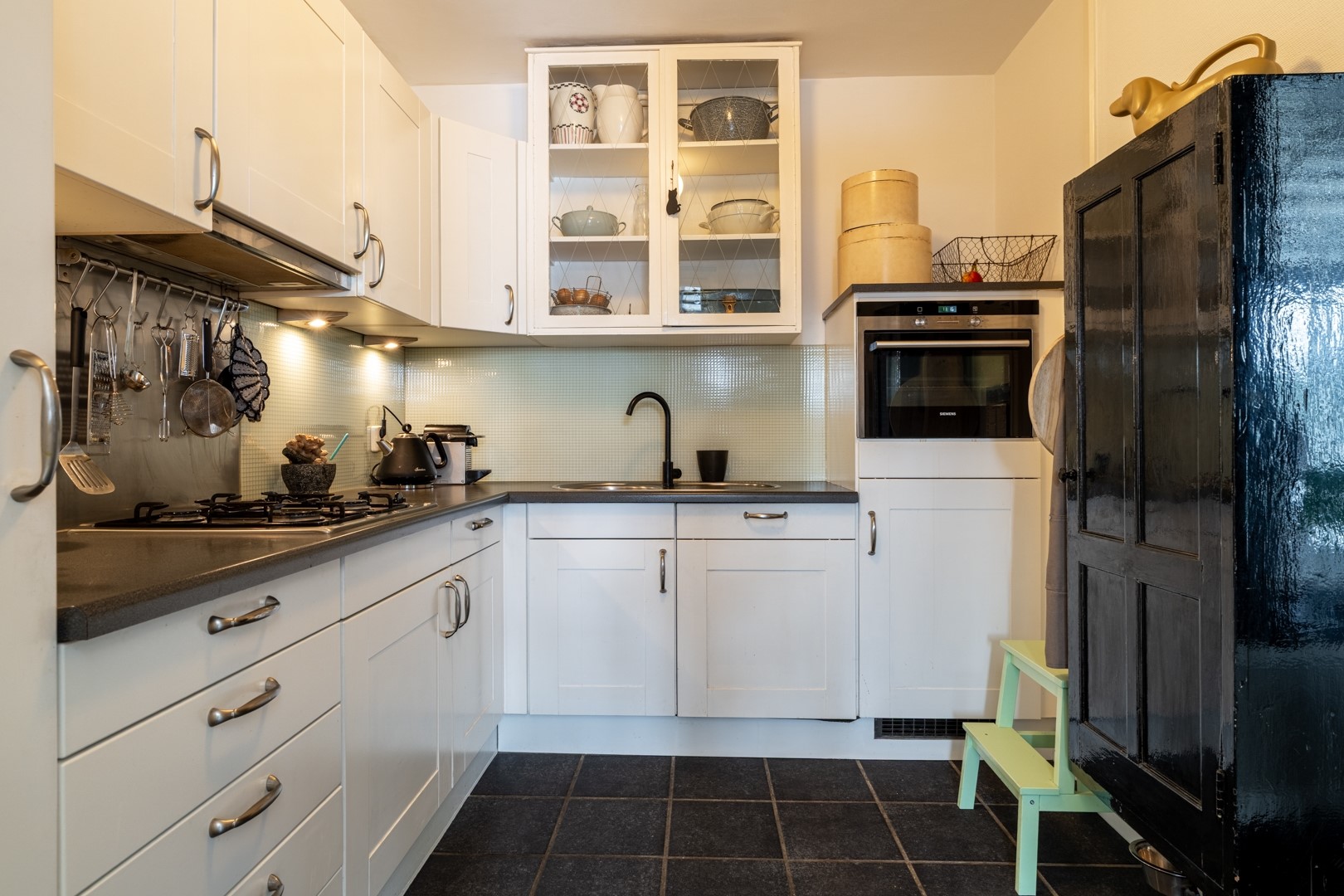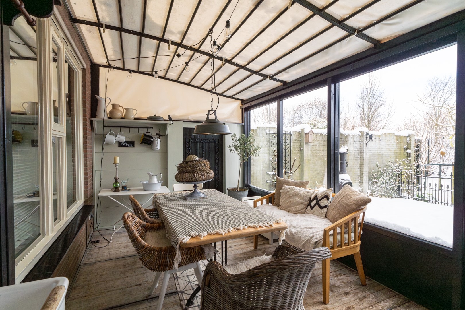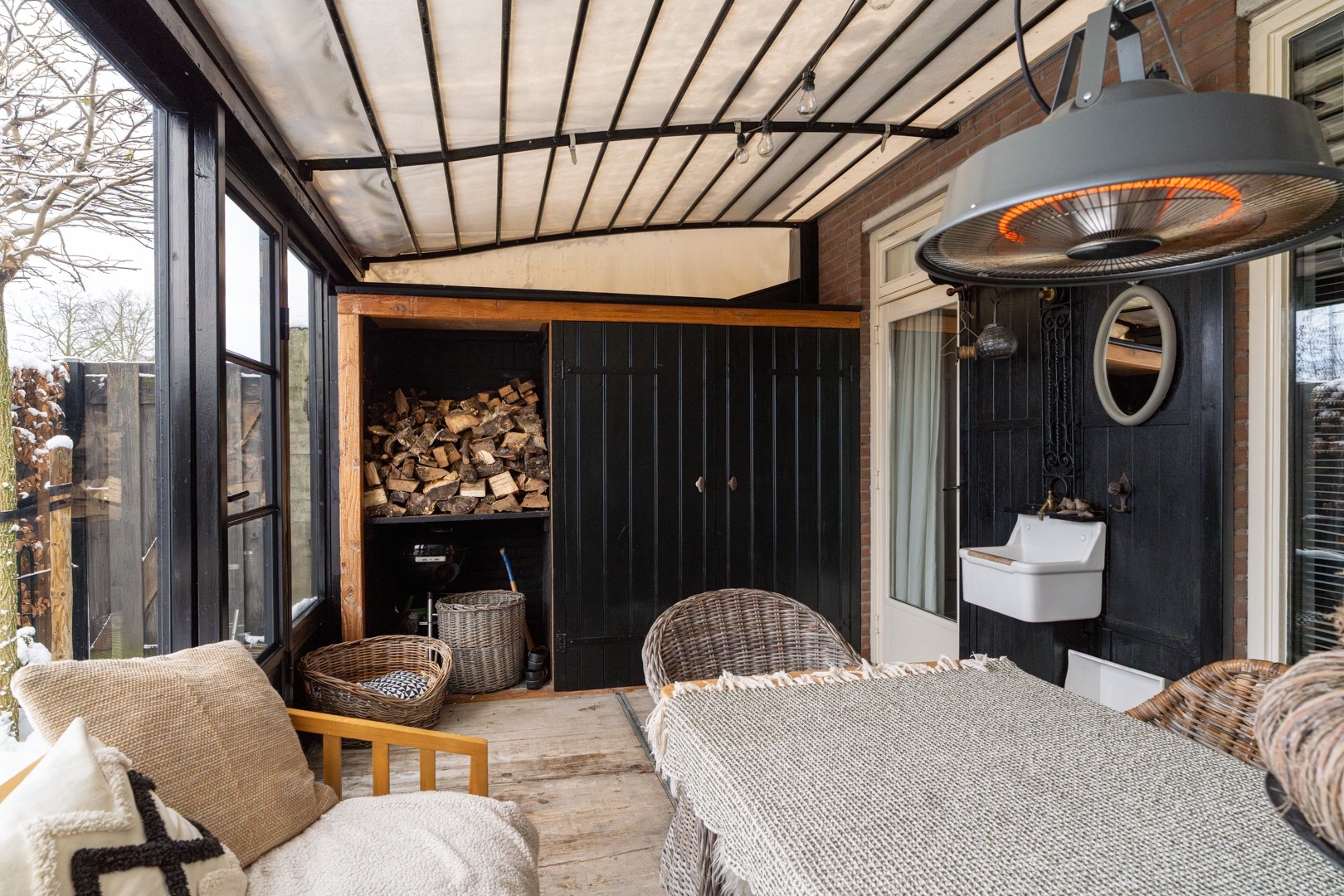De gesloten keuken ligt aan de achterzijde van de woning en is ingericht met een praktische hoekopstelling. Deze is uitgerust met een 4-pits gaskookplaat, afzuigkap, vaatwasser, koelkast en oven. Vanuit de keuken stap je zo de gezellige tuinkamer in. Hier vind je een vaste kast met bergruimte en houtopslag, evenals een uitstortgootsteen.