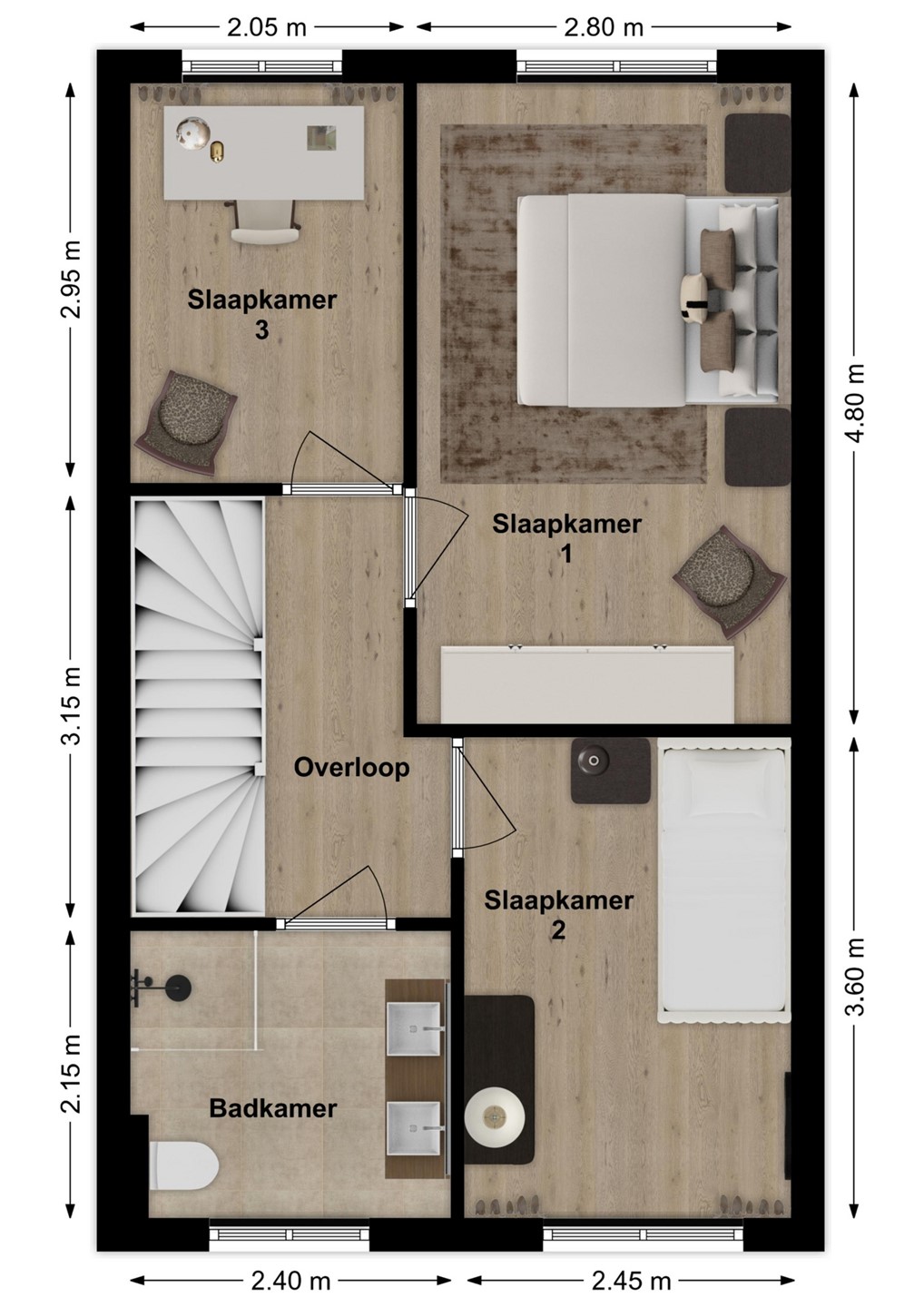 Op de eerste verdieping vind je drie slaapkamers van prettig formaat: perfect voor een gezin, een thuiskantoor of een royale inloopkast. De stijlvolle pvc-vloer is onderhoudsvriendelijk,